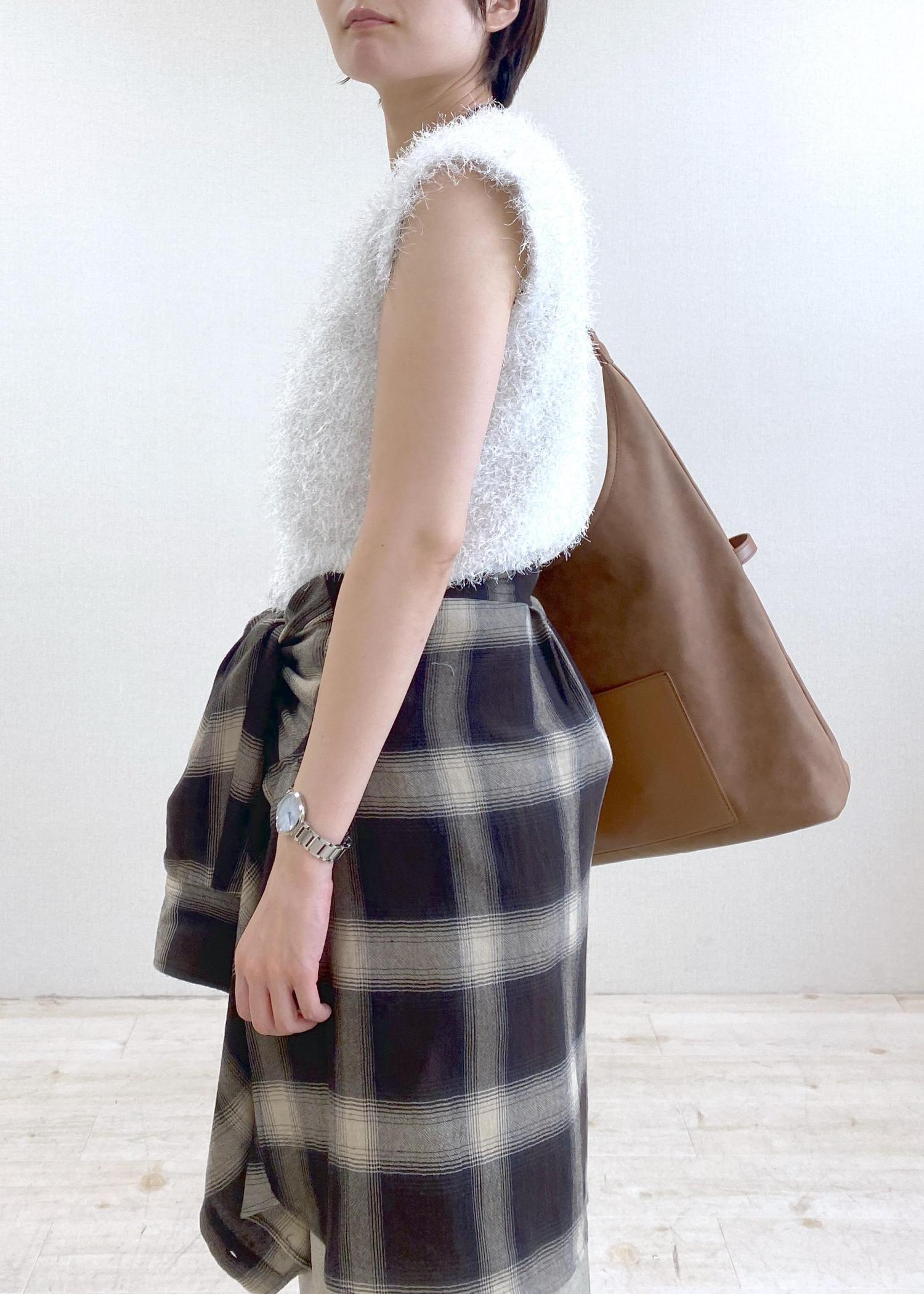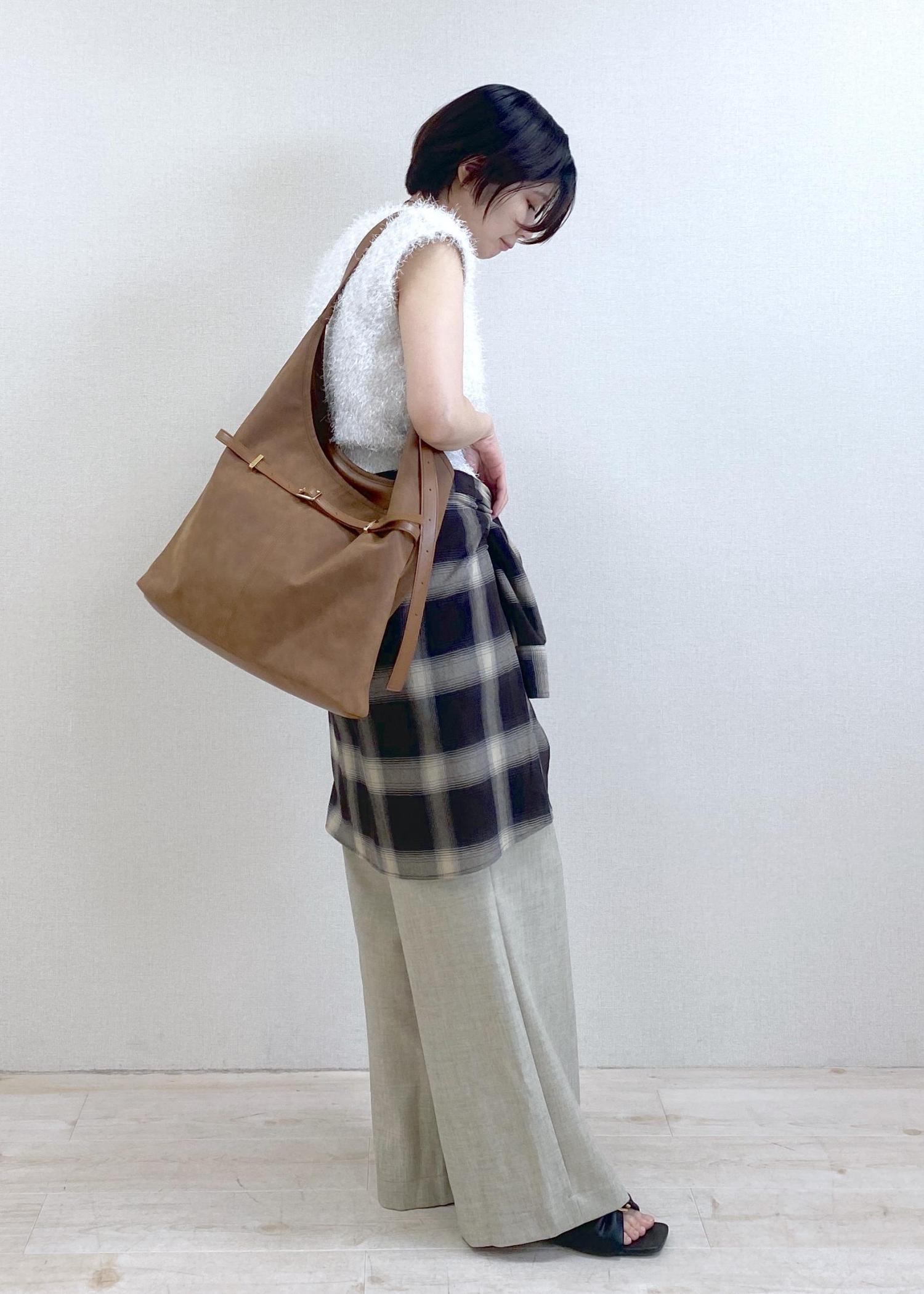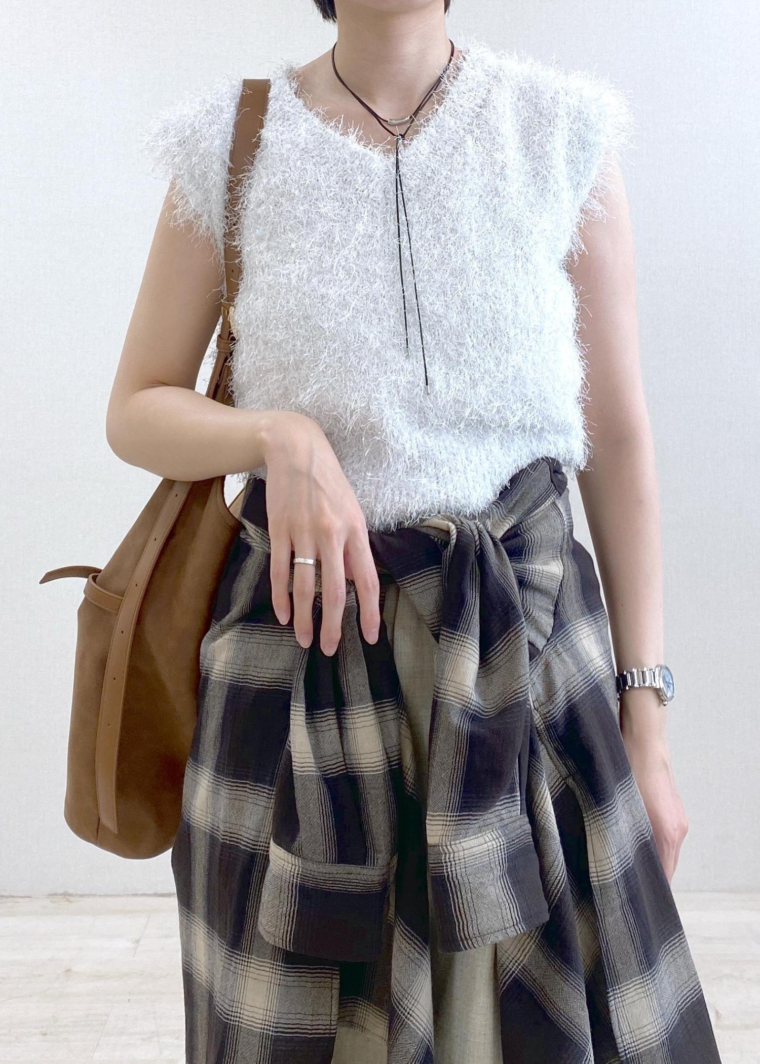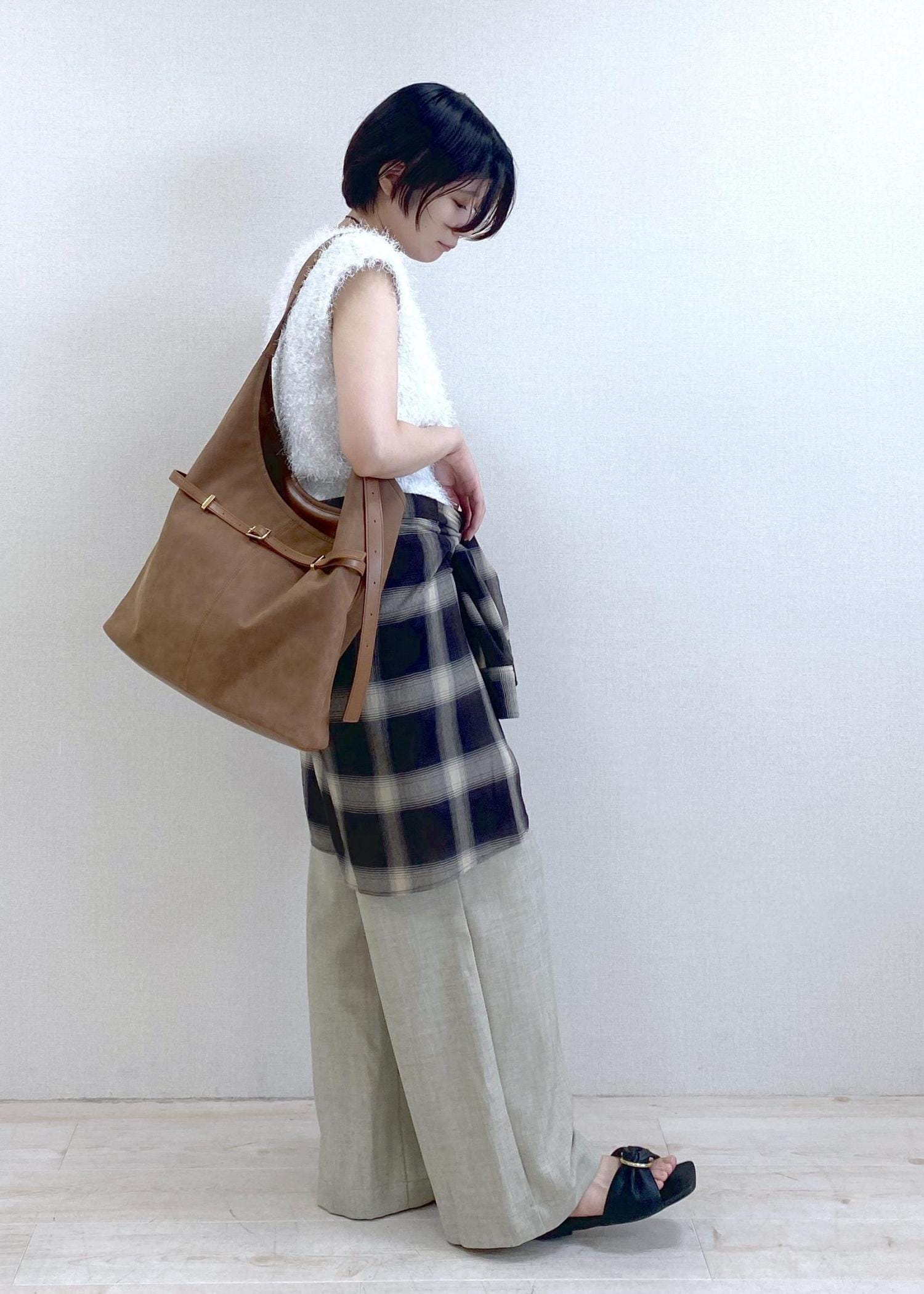 フェザーヤーンベストとワイドパンツにオンブレチェックのシャツを腰巻きしました。