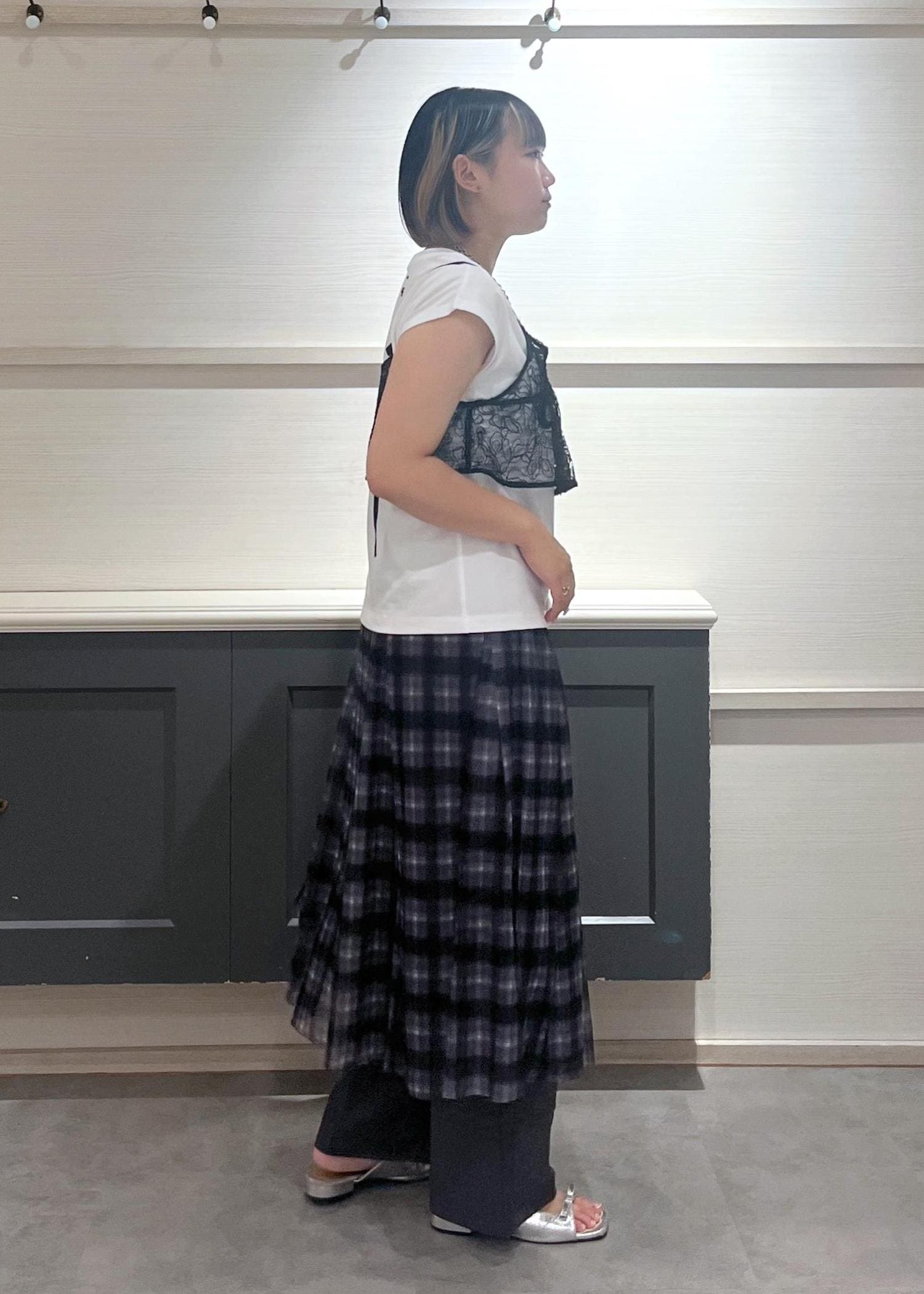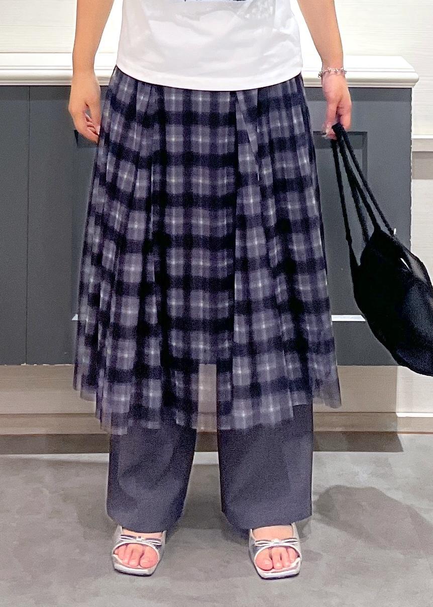 ボトムはチェック柄のスカートとワイドパンツを重ねることで、動きが出て個性的なシルエットに仕上がっています!