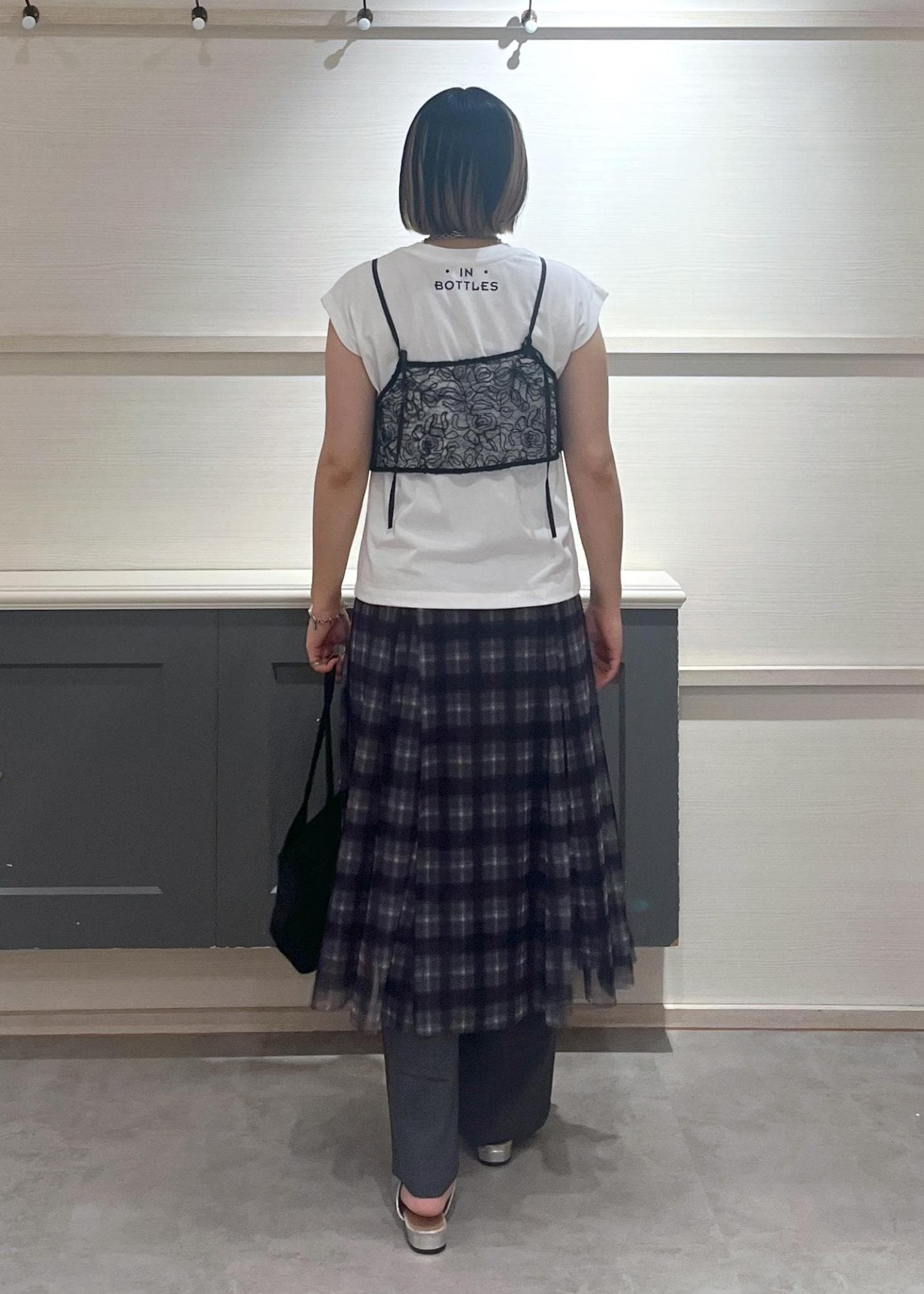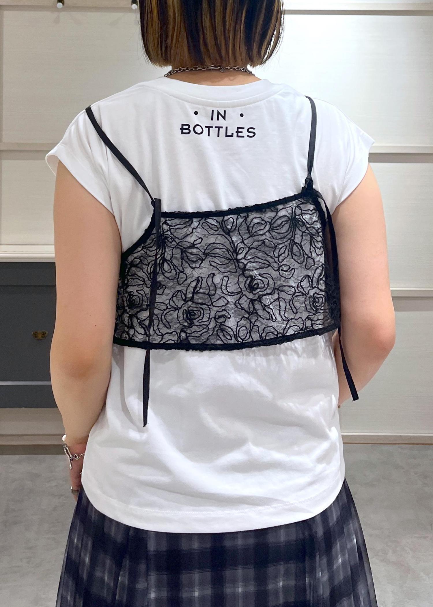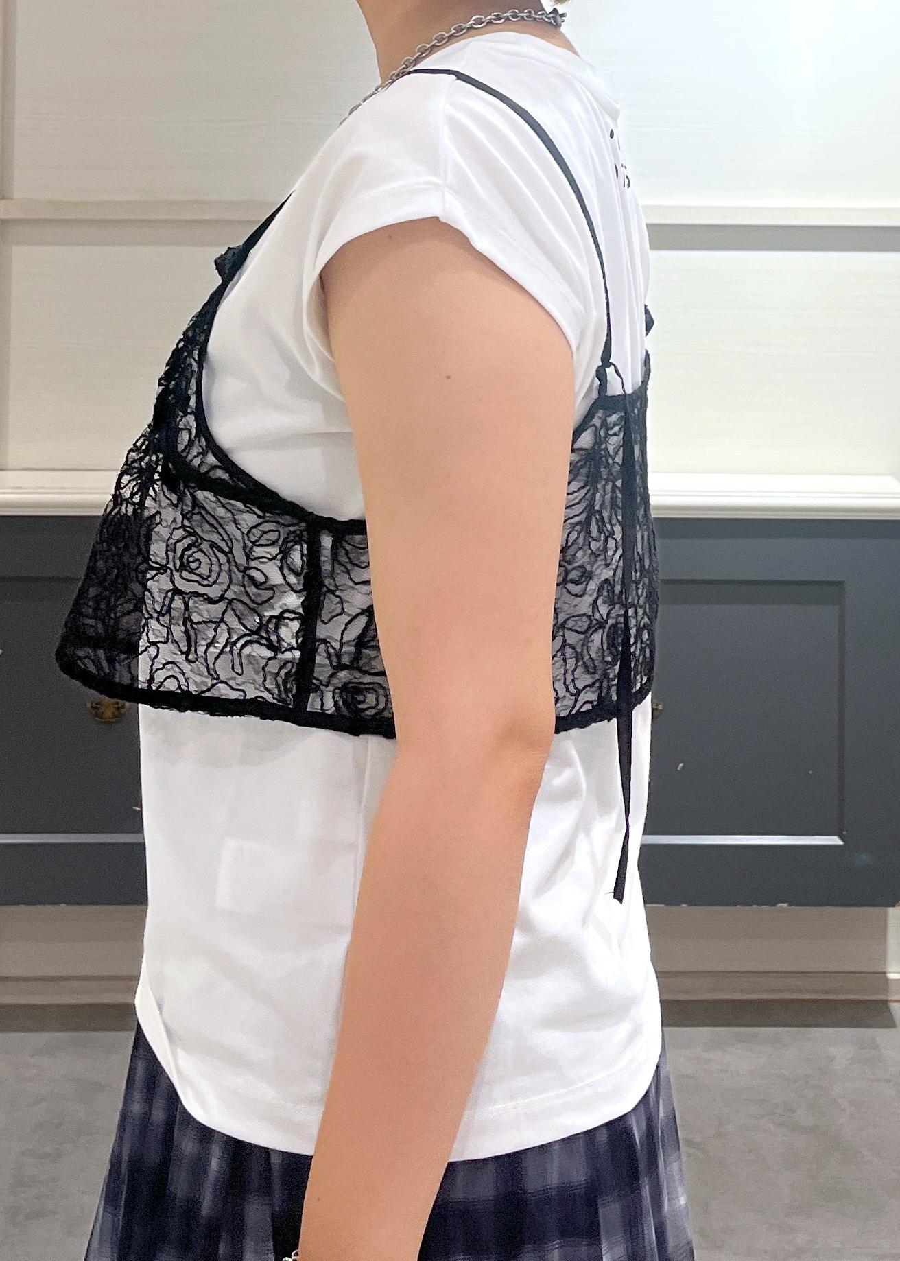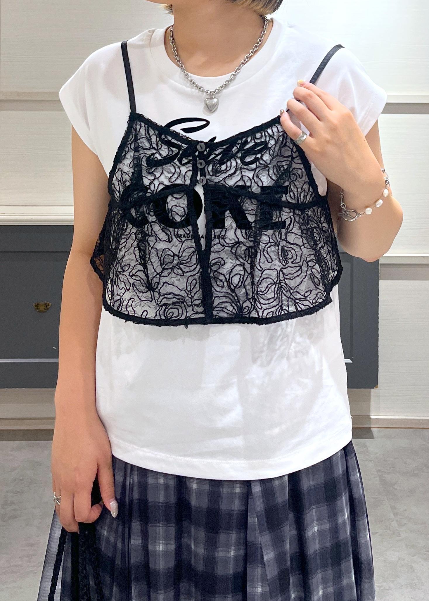 白Tシャツに黒のレースキャミを重ねて、