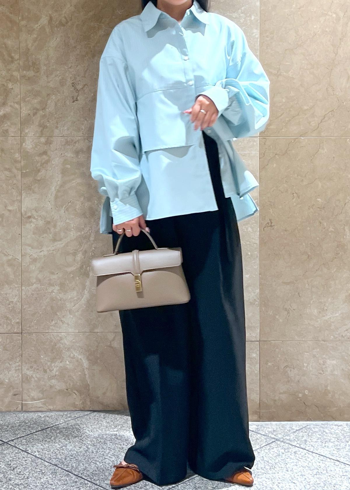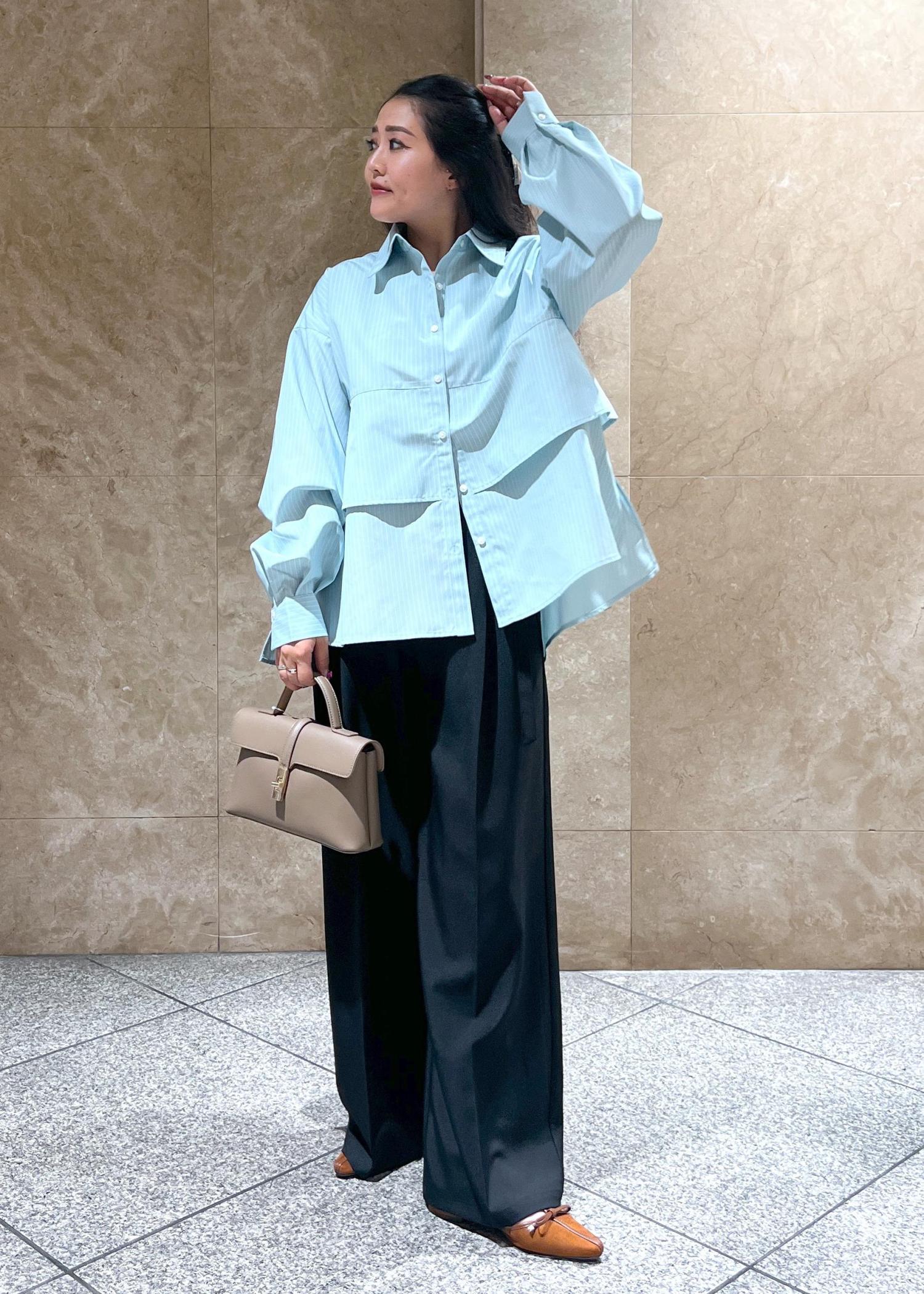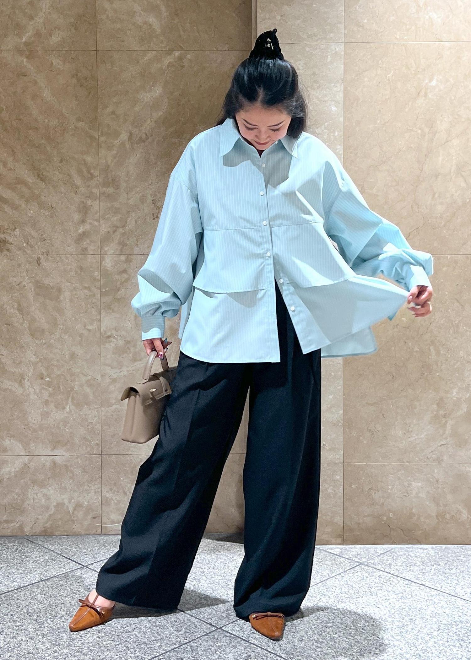 VIS裾ティアードオーバーシャツ/UVケア・イージーケアライトグリーン / F¥3,557レビューヒラヒラ感を見せたくて何度も動きましたが、写真では上手く伝わらず、、!少しハリ感のある素材なので、ほどよくかっちりとした感じが出ていて、お仕事にもとっても良さそうです。◎