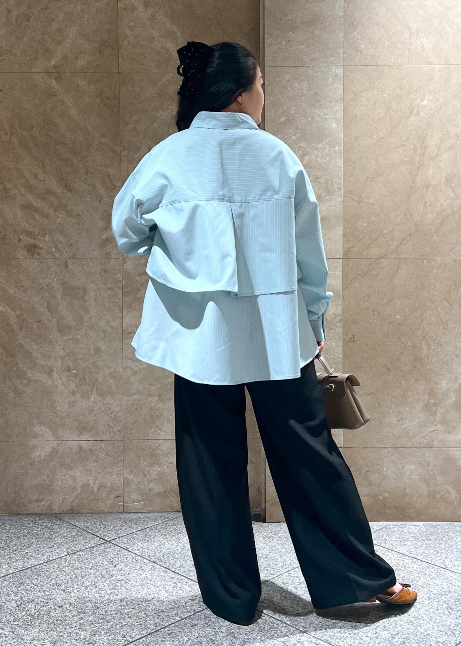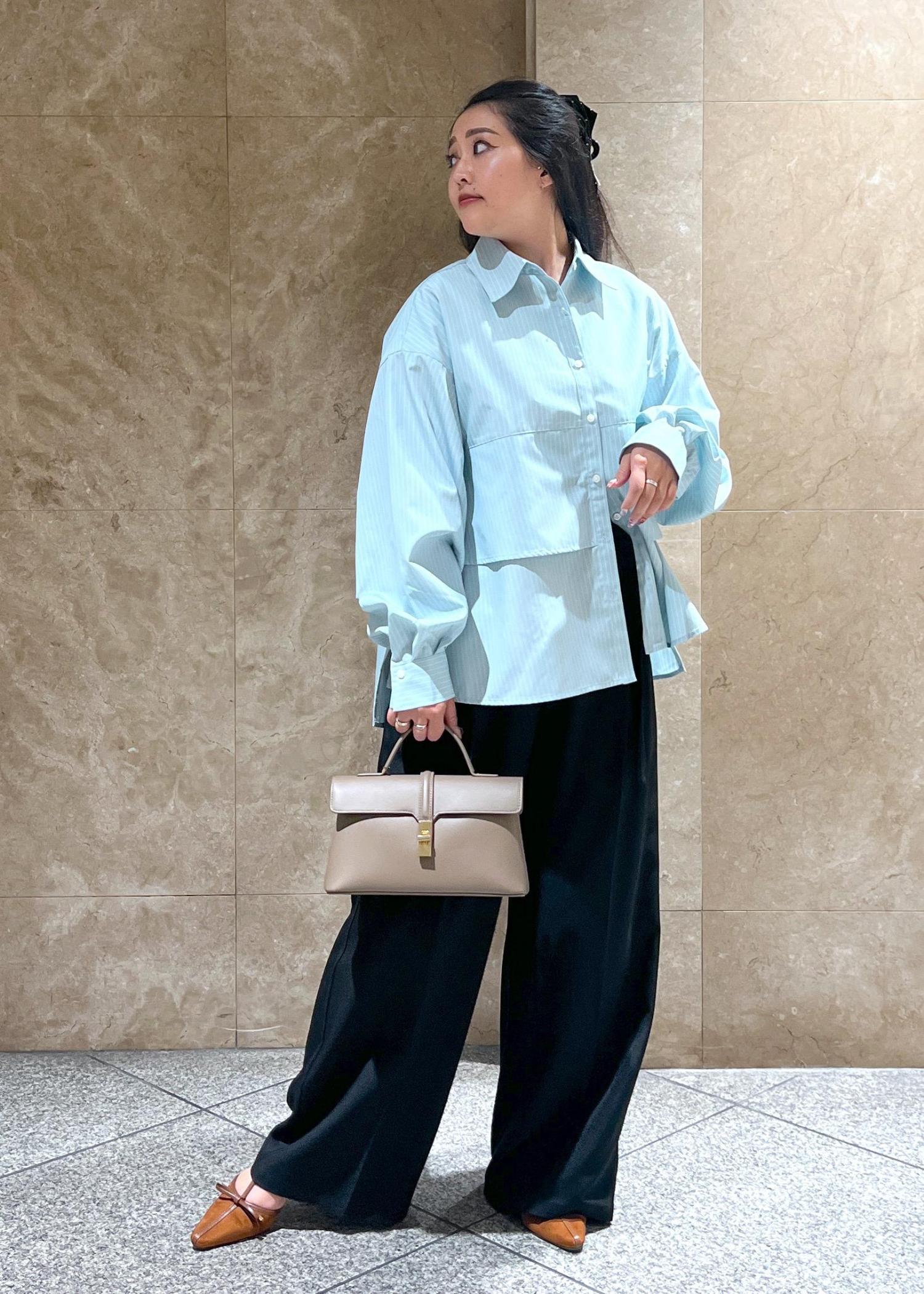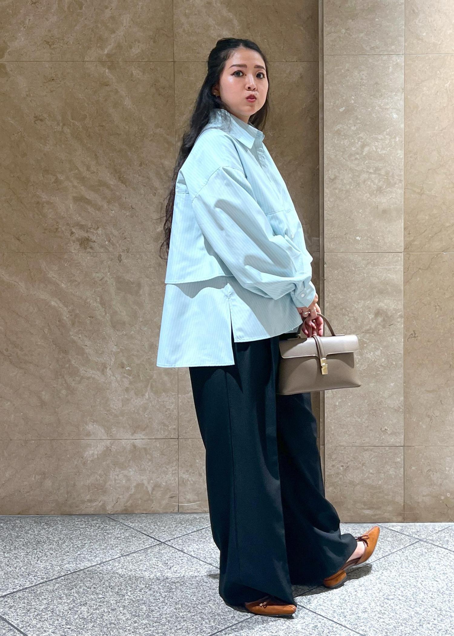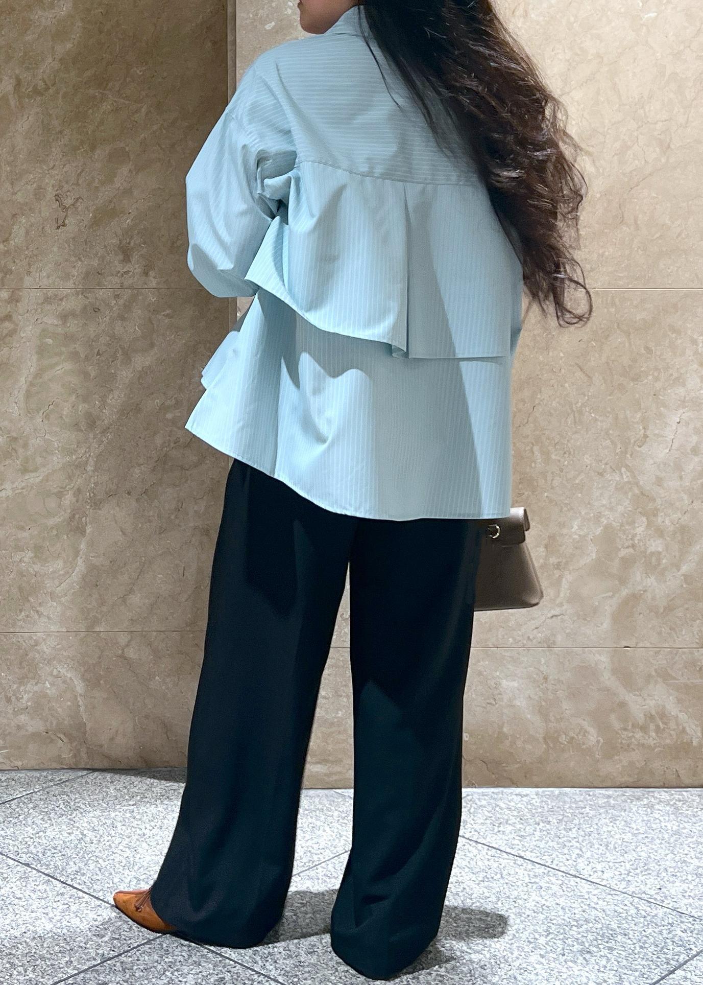 VIS裾ティアードオーバーシャツ/UVケア・イージーケアライトグリーン / F¥3,557レビューヒラヒラ感を見せたくて何度も動きましたが、写真では上手く伝わらず、、!少しハリ感のある素材なので、ほどよくかっちりとした感じが出ていて、お仕事にもとっても良さそうです。◎