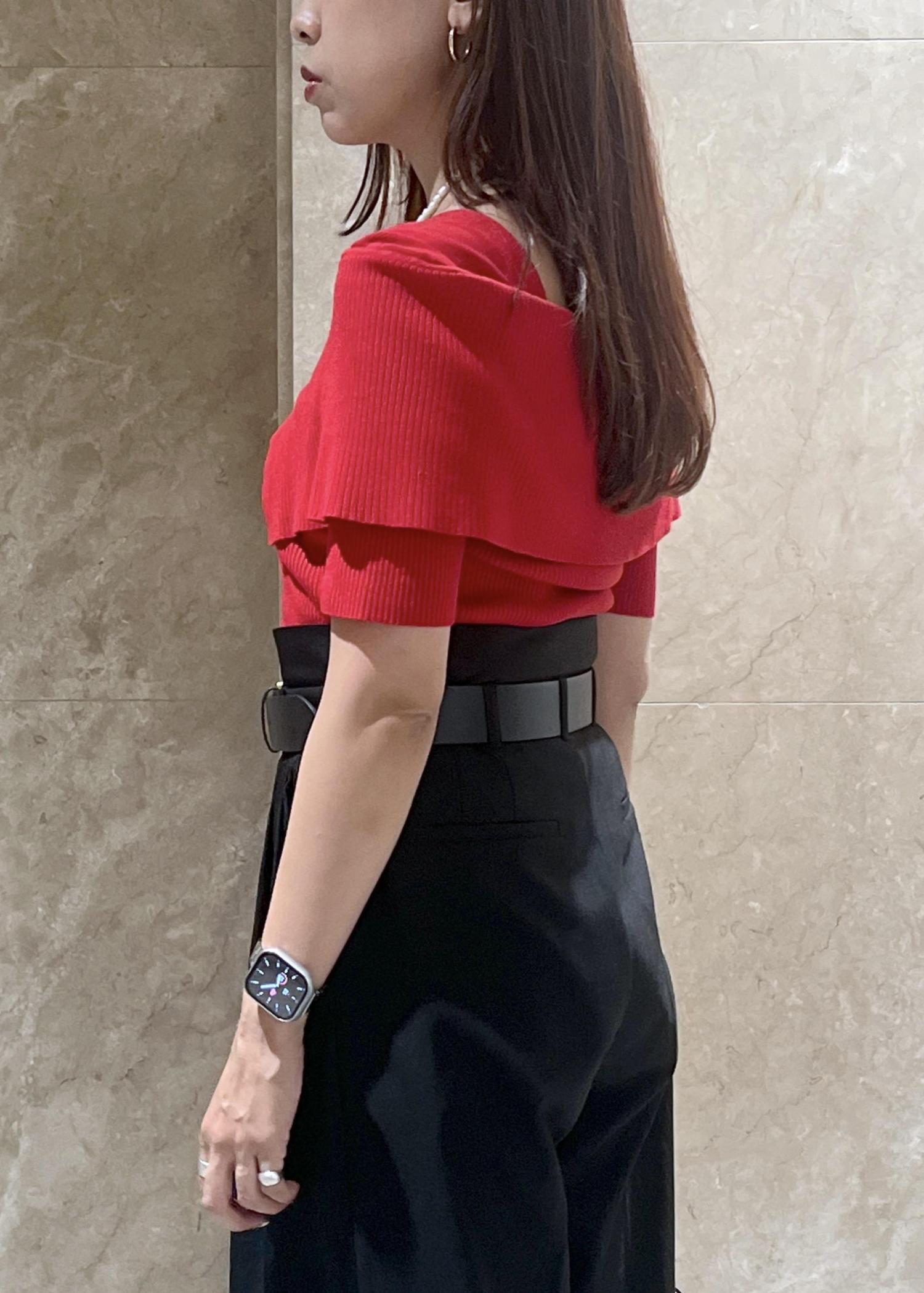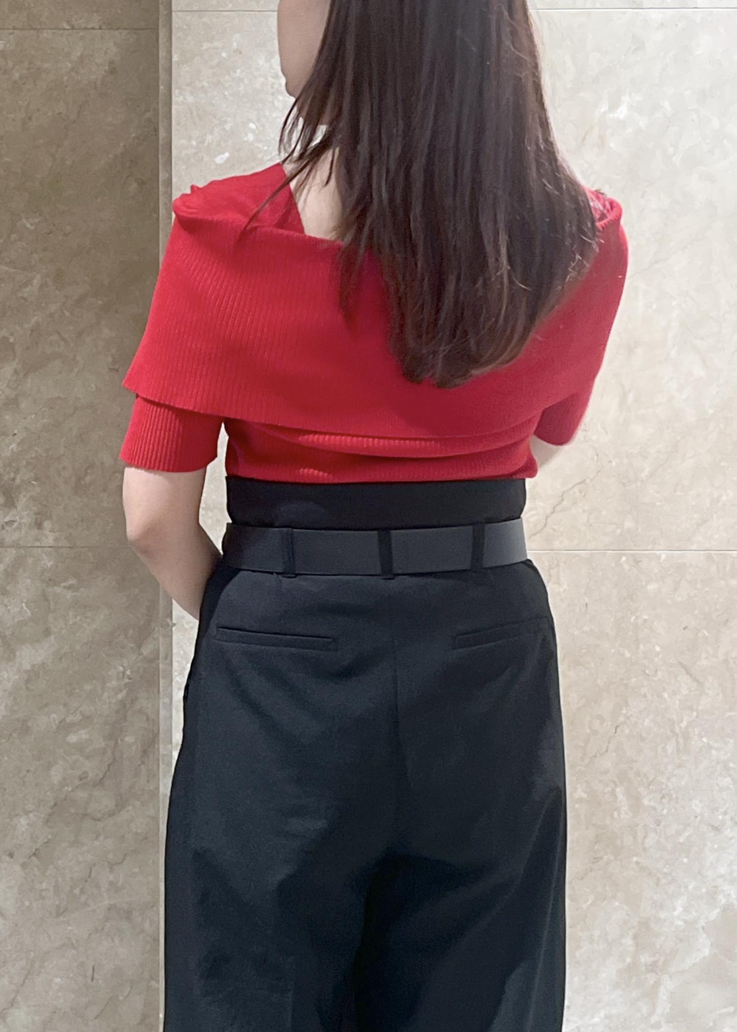 VISビックカラーオフショルハーフスリーブニットレッド / F¥2,963レビュー身長158cm、着丈はおしりにかかるほど、袖丈はちょうど肘上あたりまでの丈感でした。