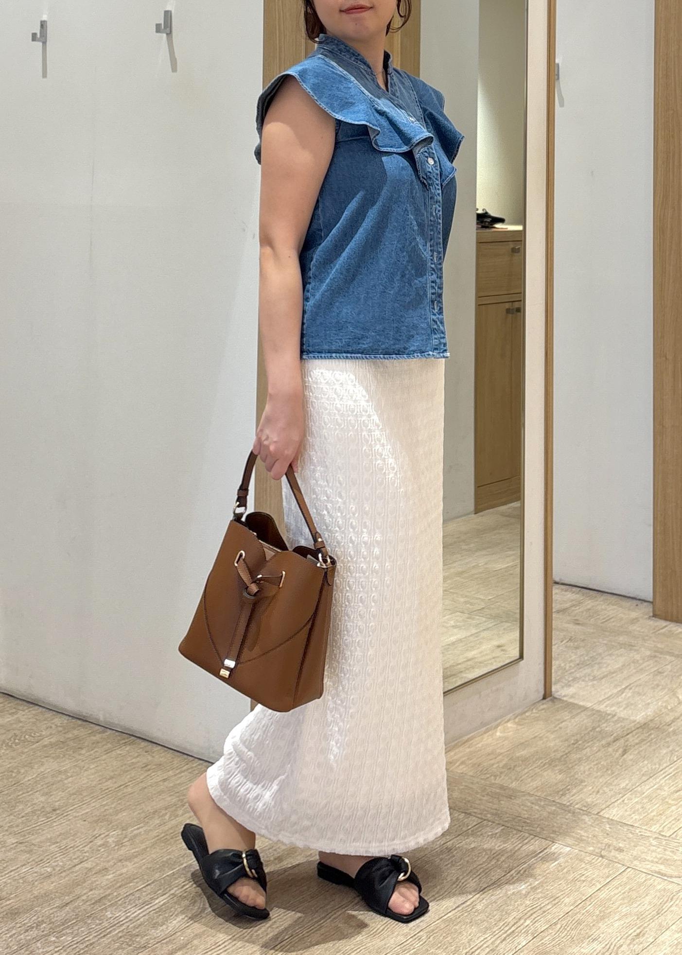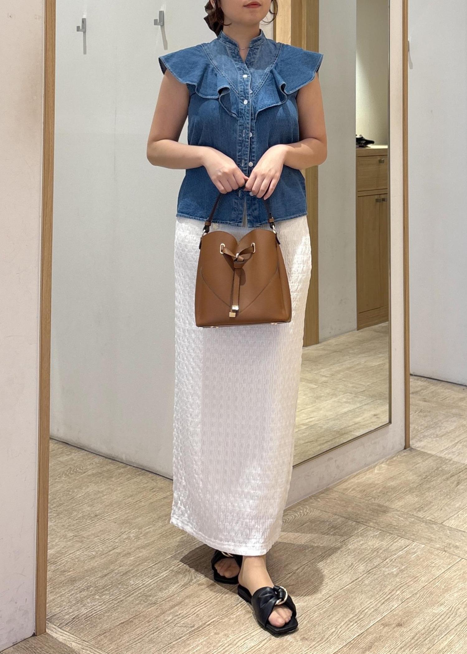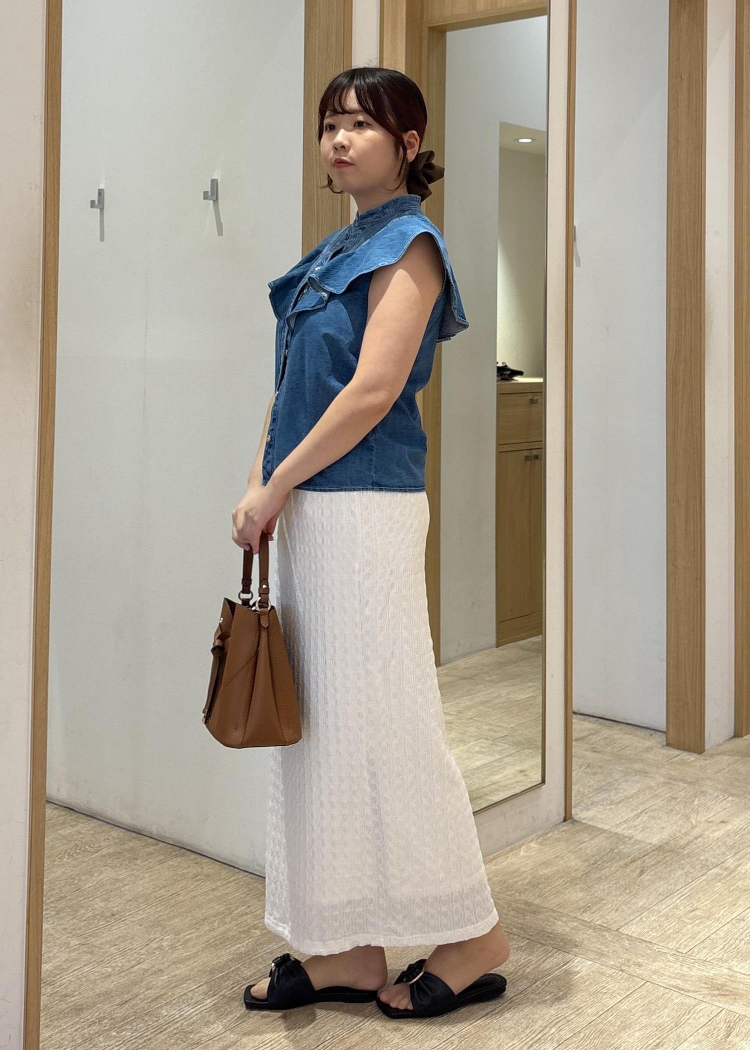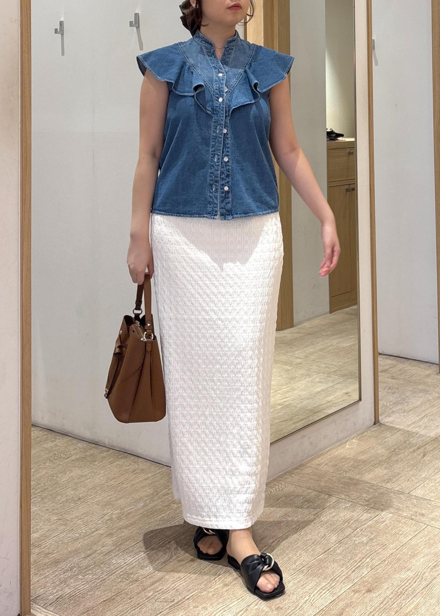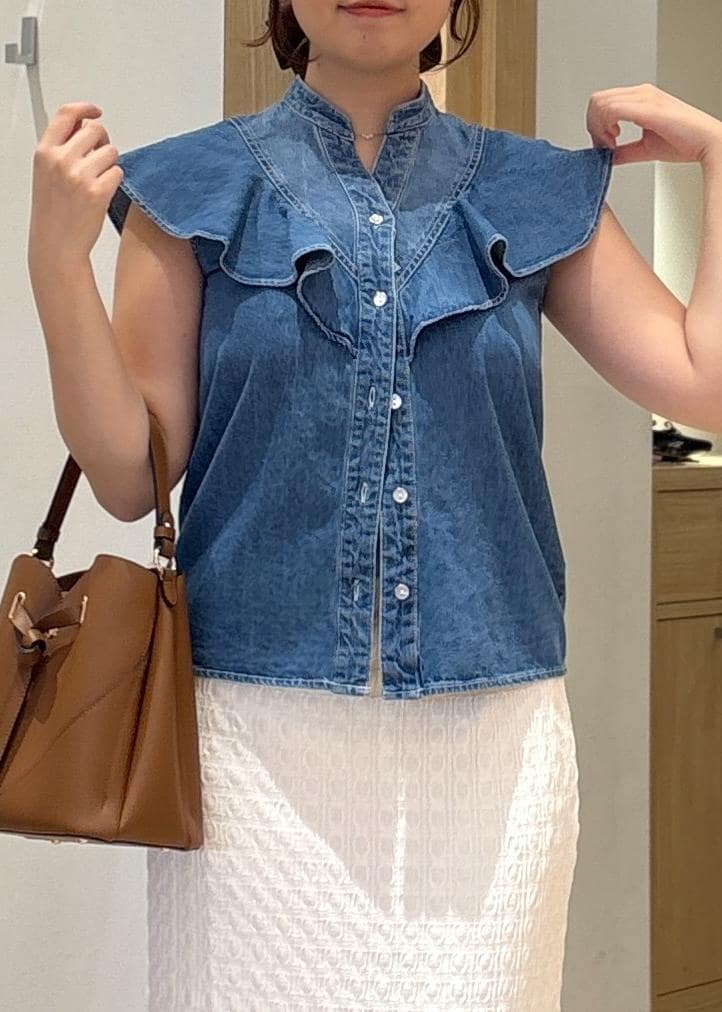 程よいハリ感で上半身に立体感を出し、骨格ストレートでも厚みを拾わずすっきり。デニムのカジュアルさとフリルの甘さが好バランス。 -