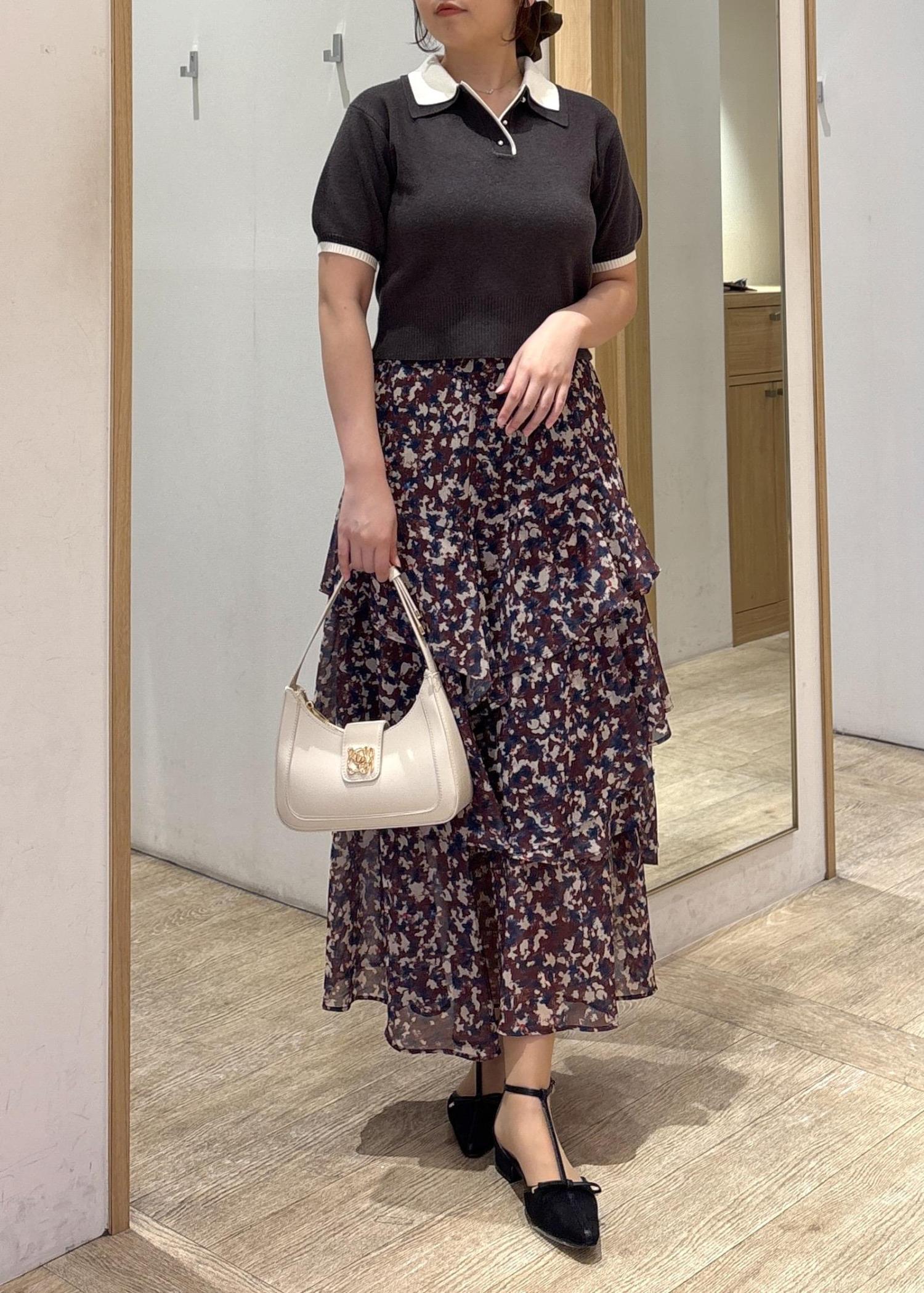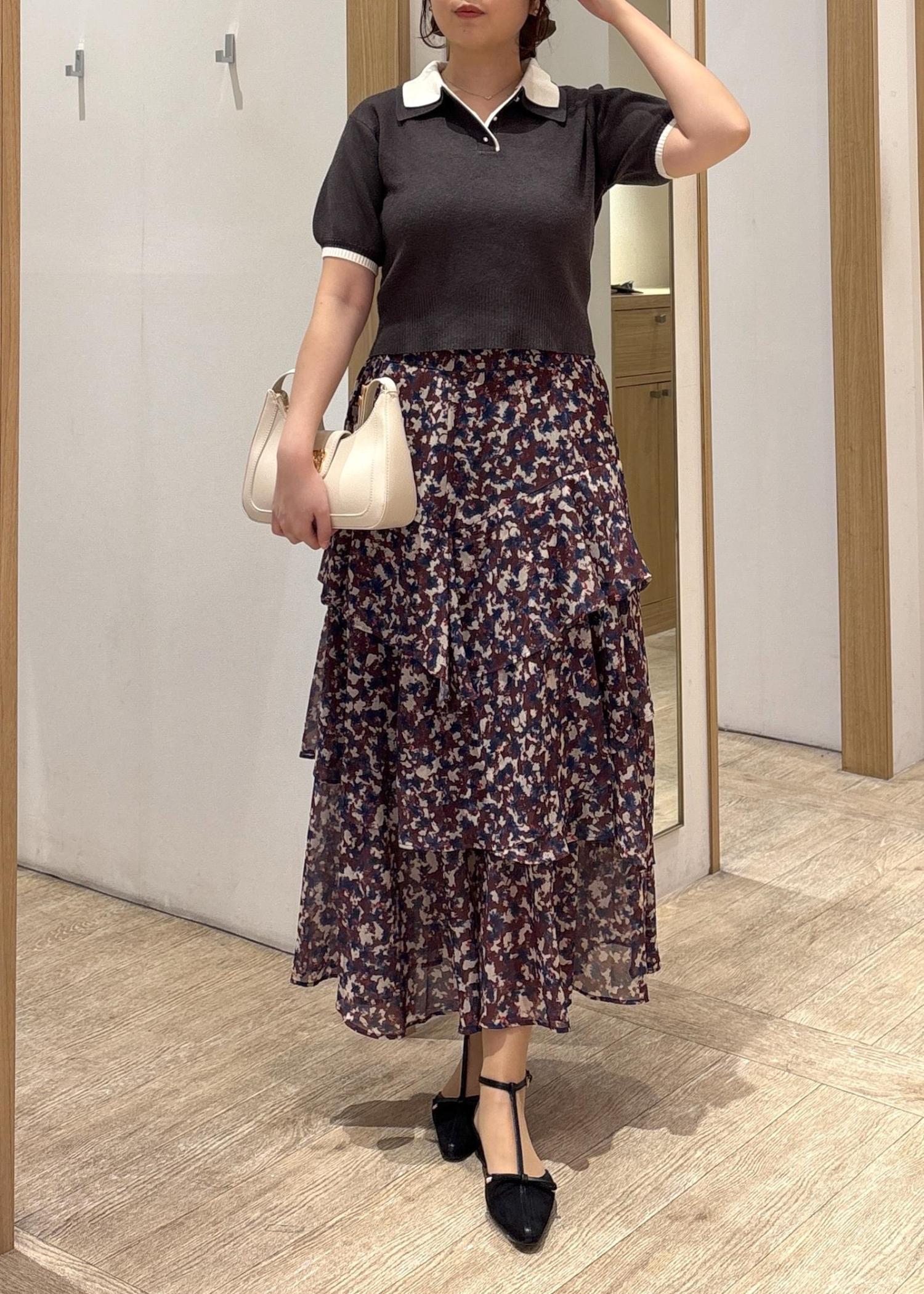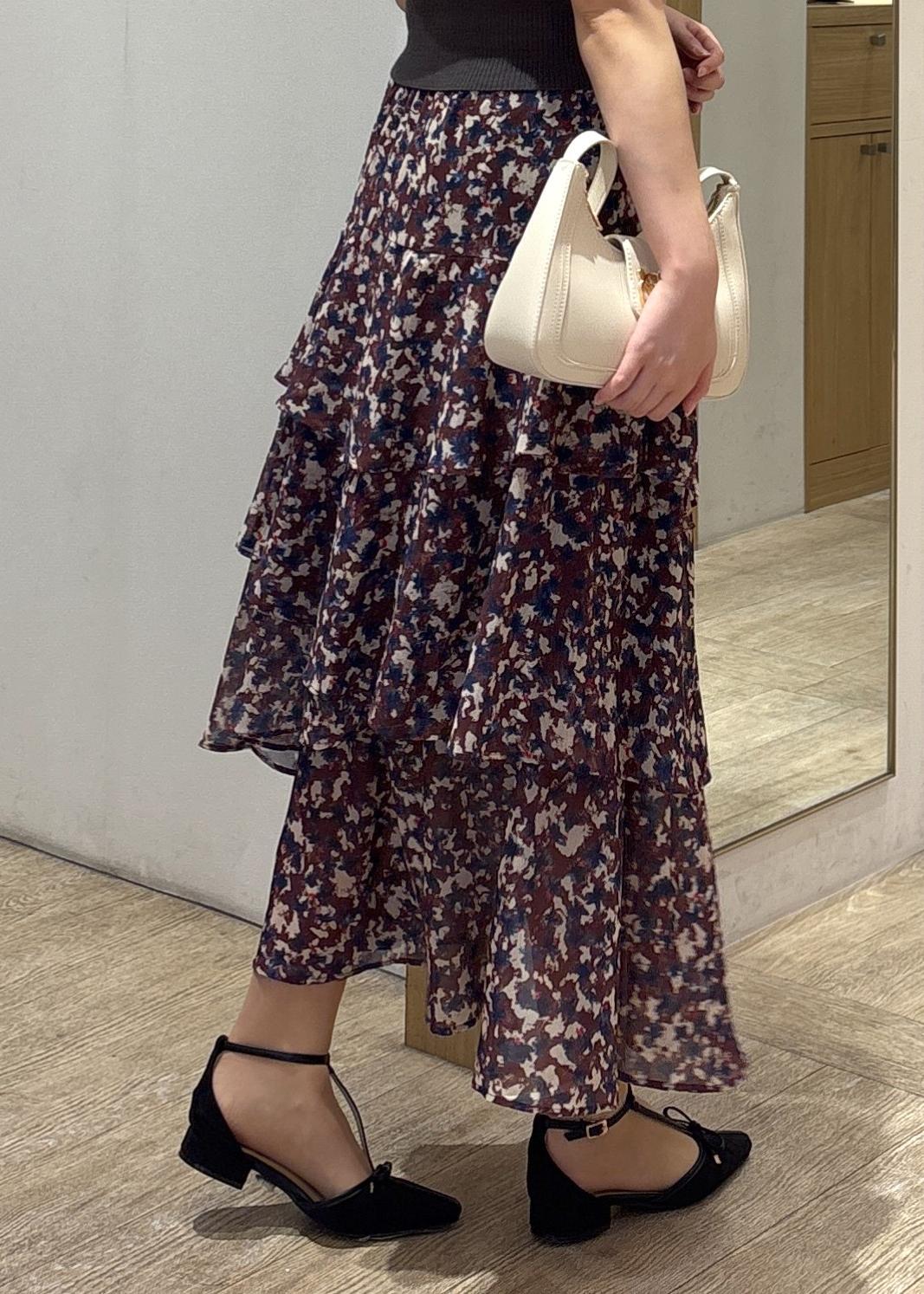 VIS花柄アソート楊柳ティアードスカートブラウン系 / F¥4,613レビューふんわり重なるティアードデザインが、動くたびに軽やかで華やか。甘さのあるデザインだけど、落ち着いたカラーなので大人可愛くまとまります。