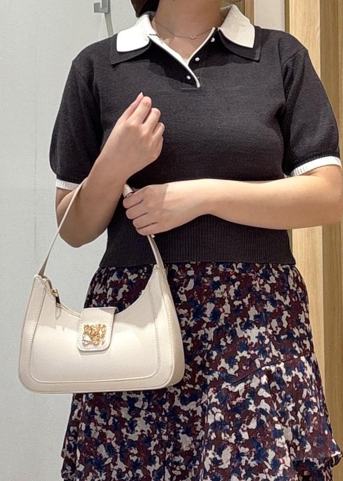 金具のワンポイントがリッチ見え。コーデ全体の柔らかいトーンとマッチし、上品なまとまり感を演出。 -