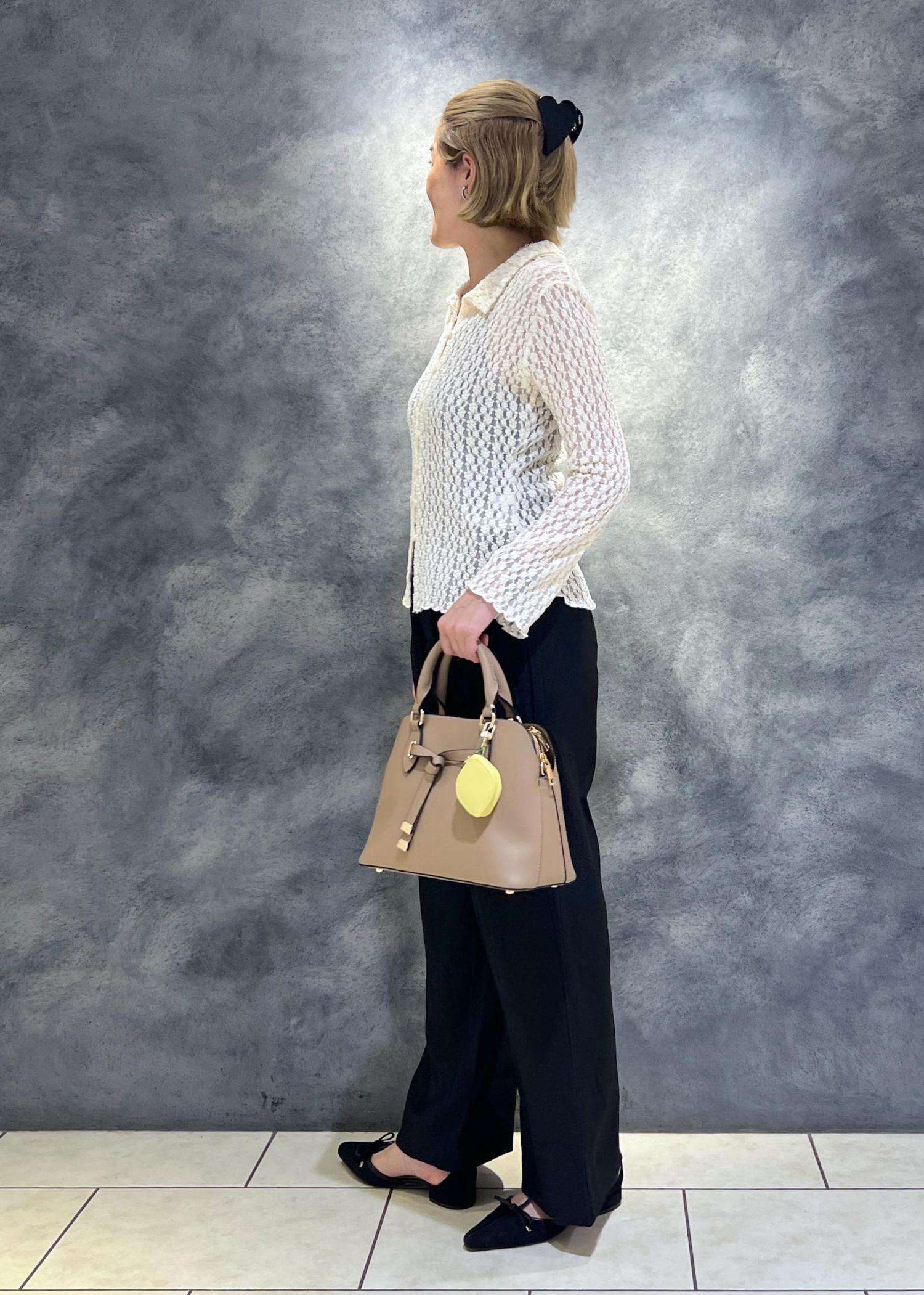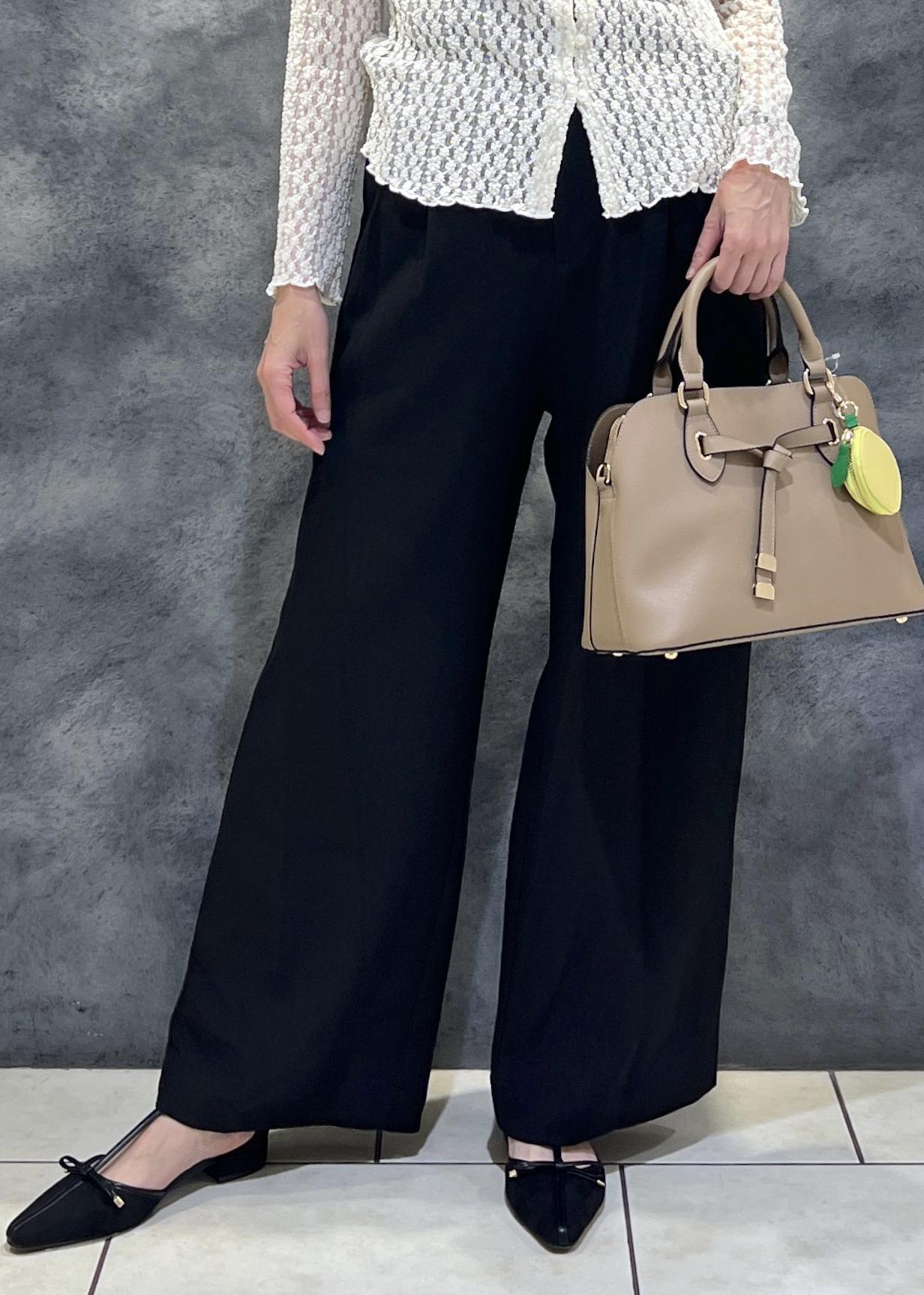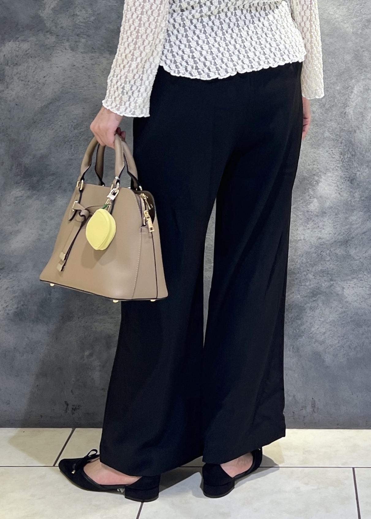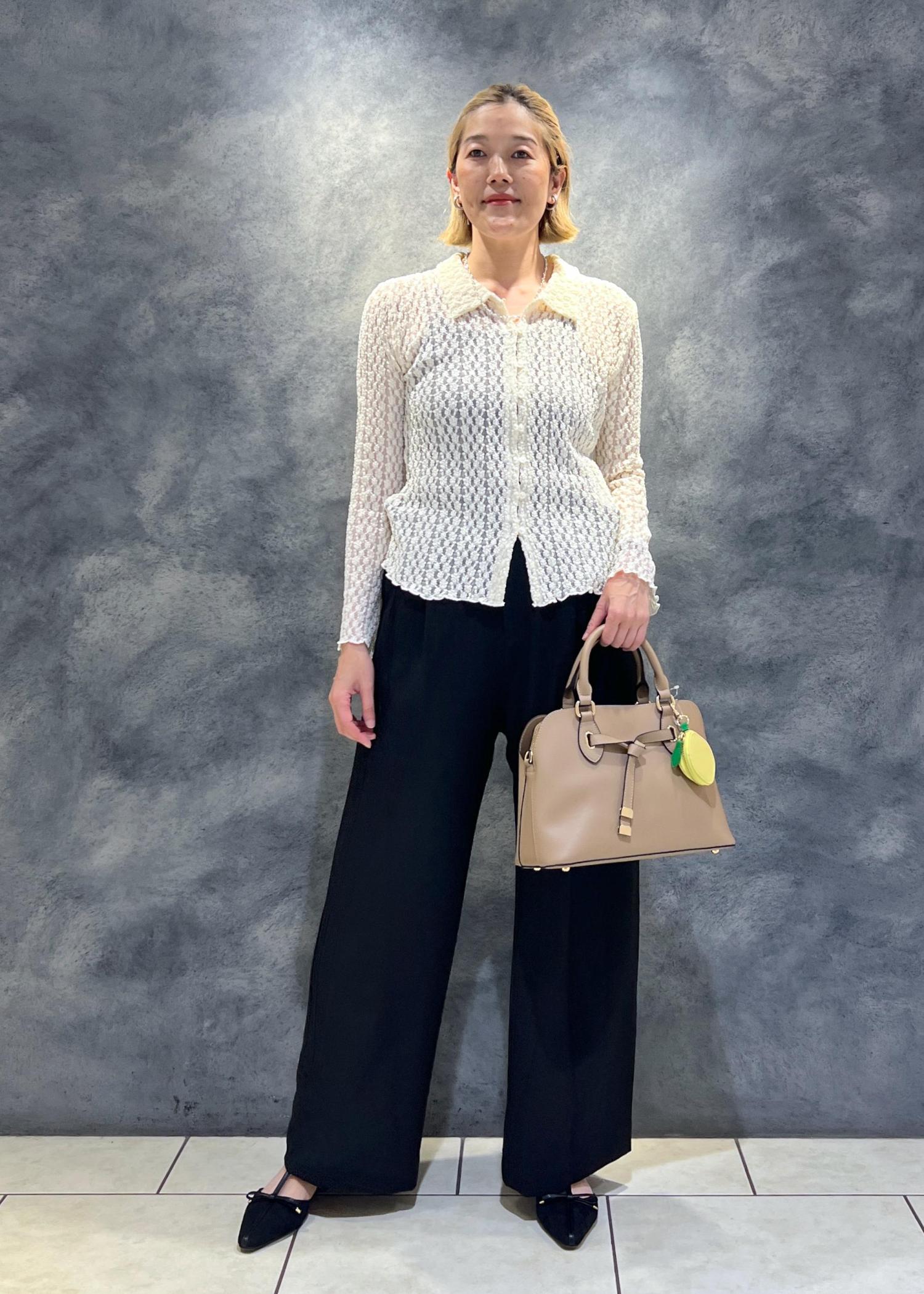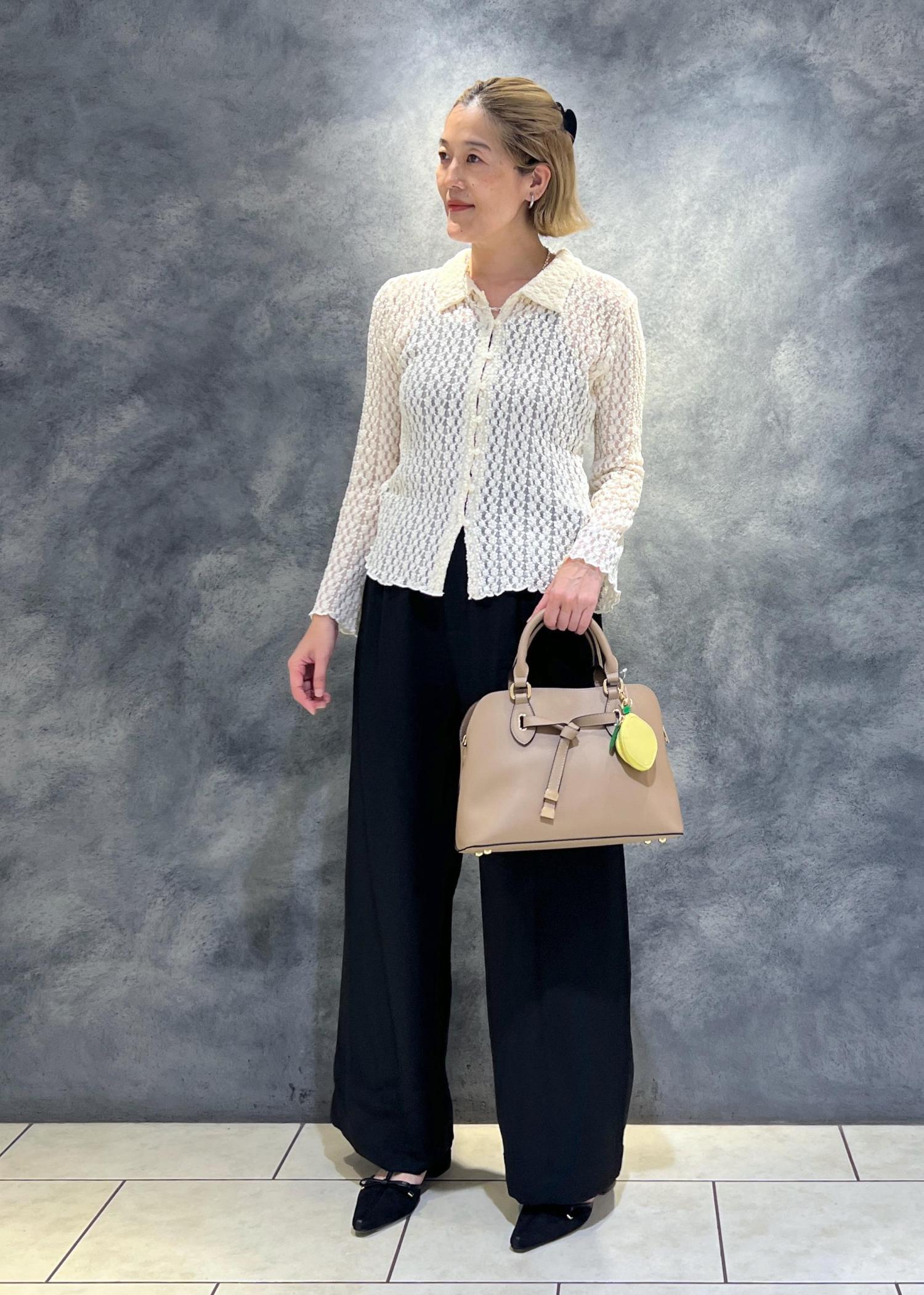 ボトムはボリューム感のあるリラックスなものをチョイスして甘さを抑えた大人スタイリングに仕上げております。