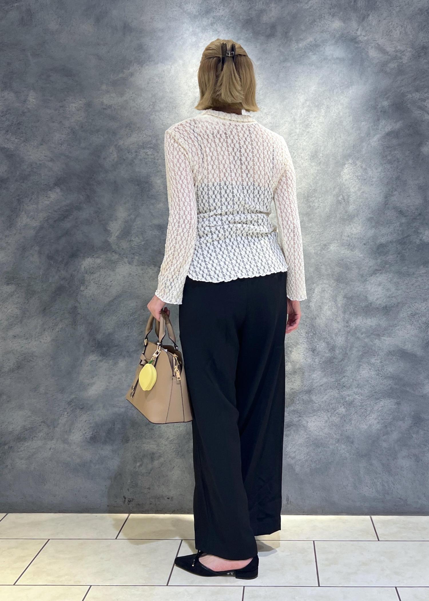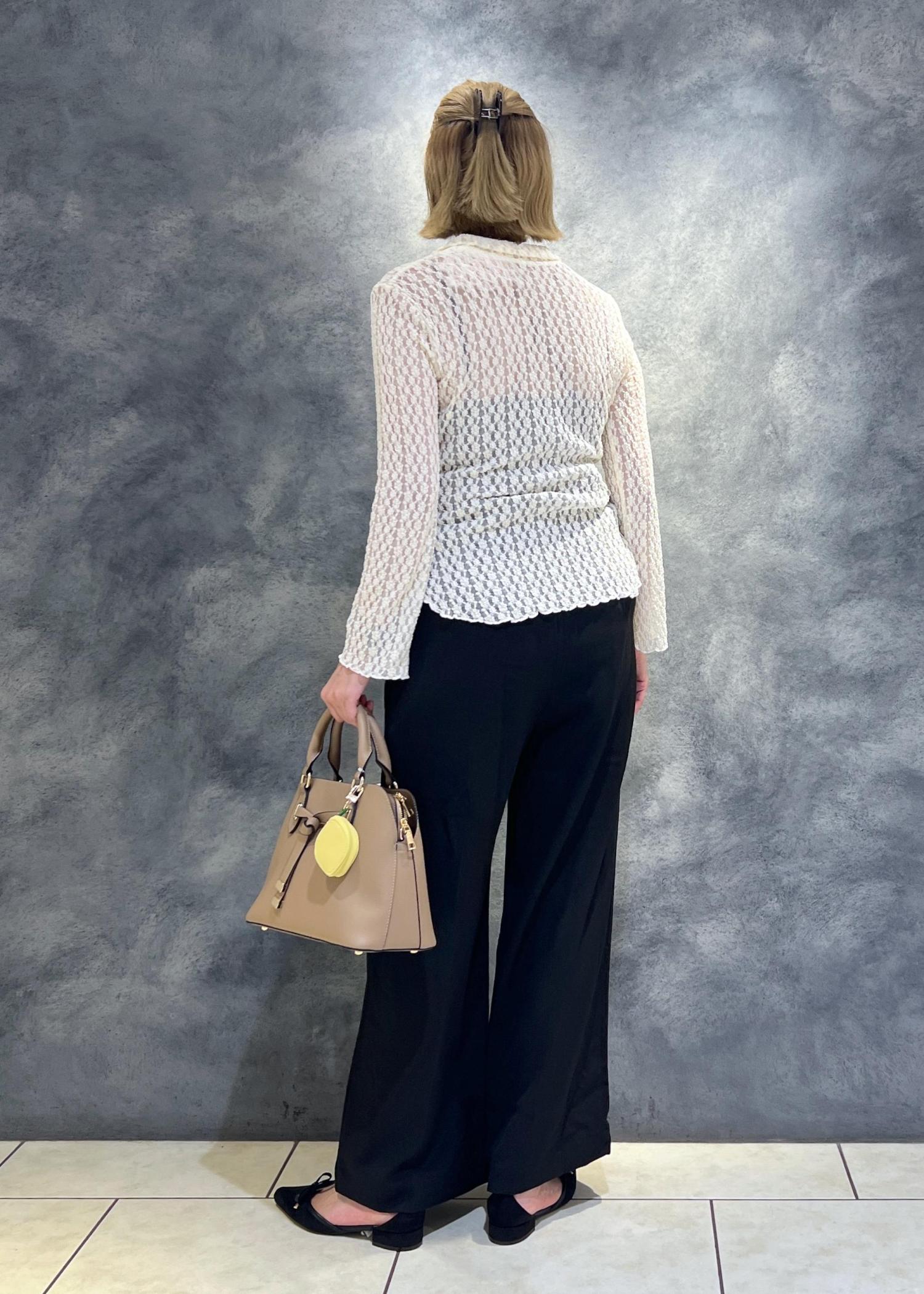 シャツよりも柔らかく着用がしやすいためパンツスタイルでも女性らしい印象のコーディネートになります。