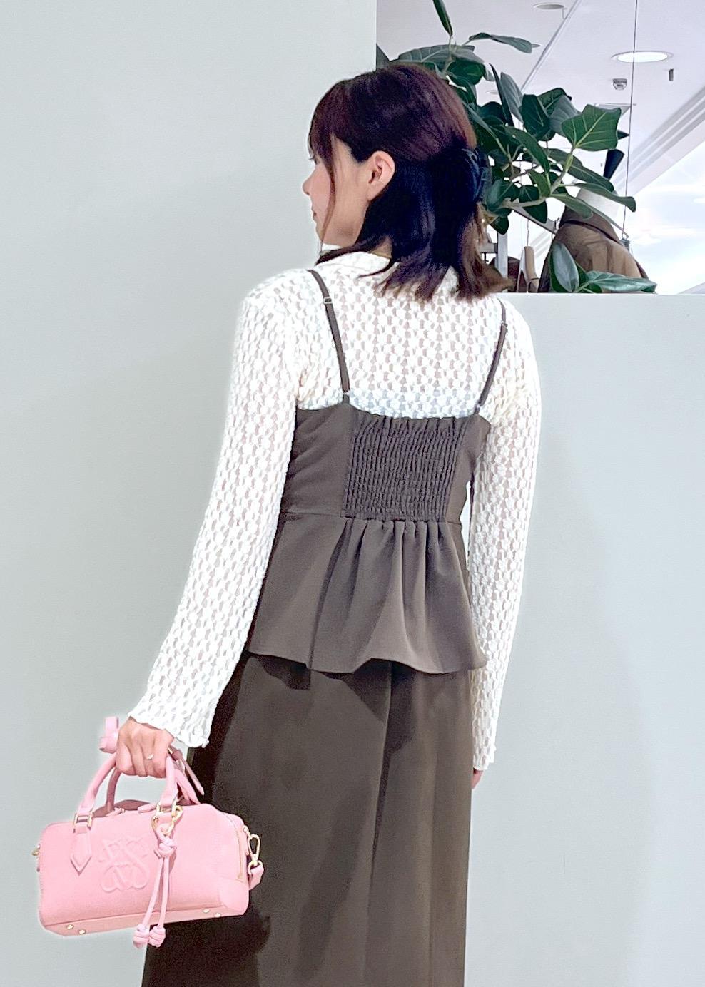 VISビスチェドッキングライクキャミワンピースダークブラウン系 / F¥7,689レビュービスチェ風のデザインとペプラムが相まってすごく可愛いデザインです。後ろのシャーリングもポイントで、後ろ姿も抜かりなしです。