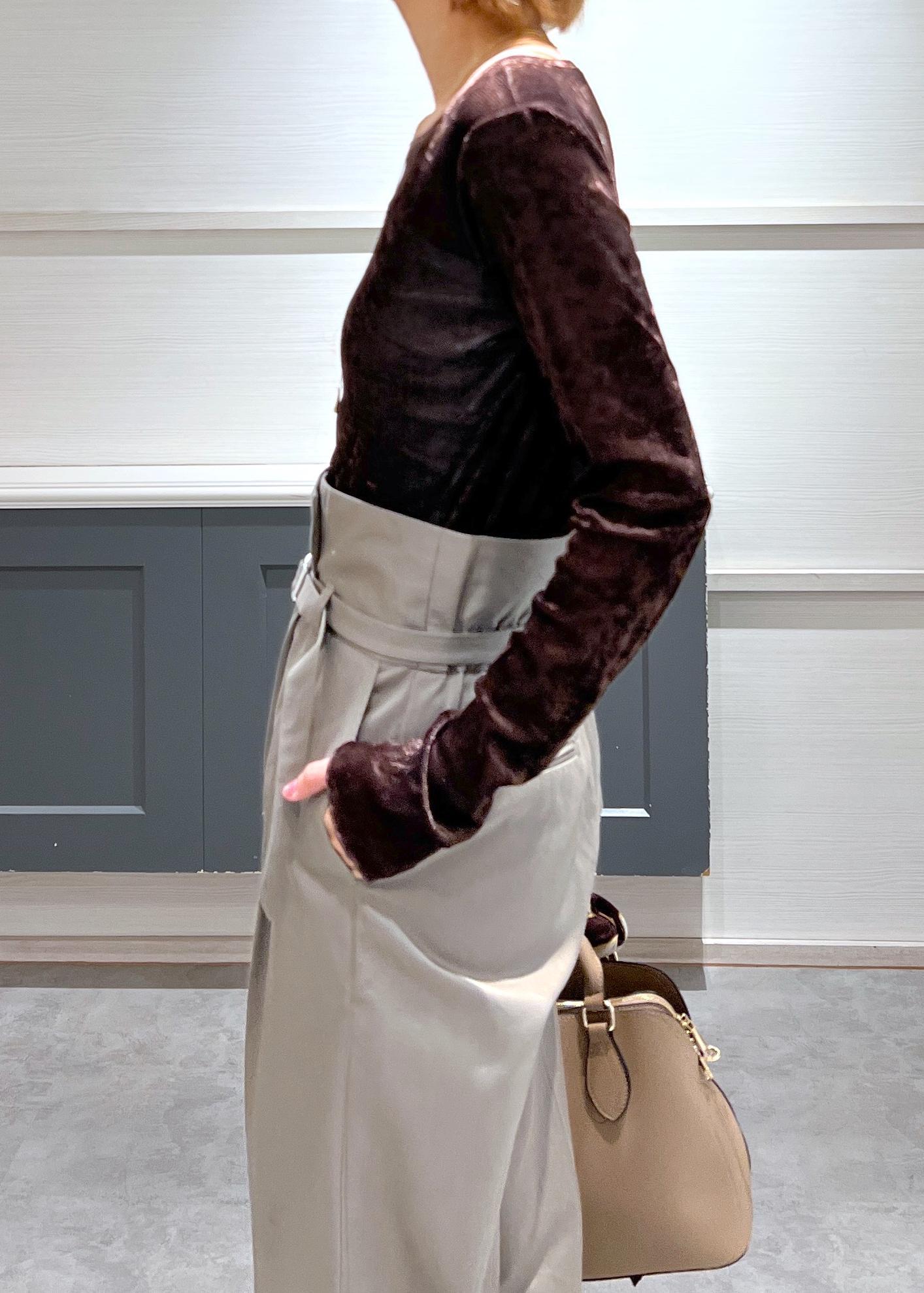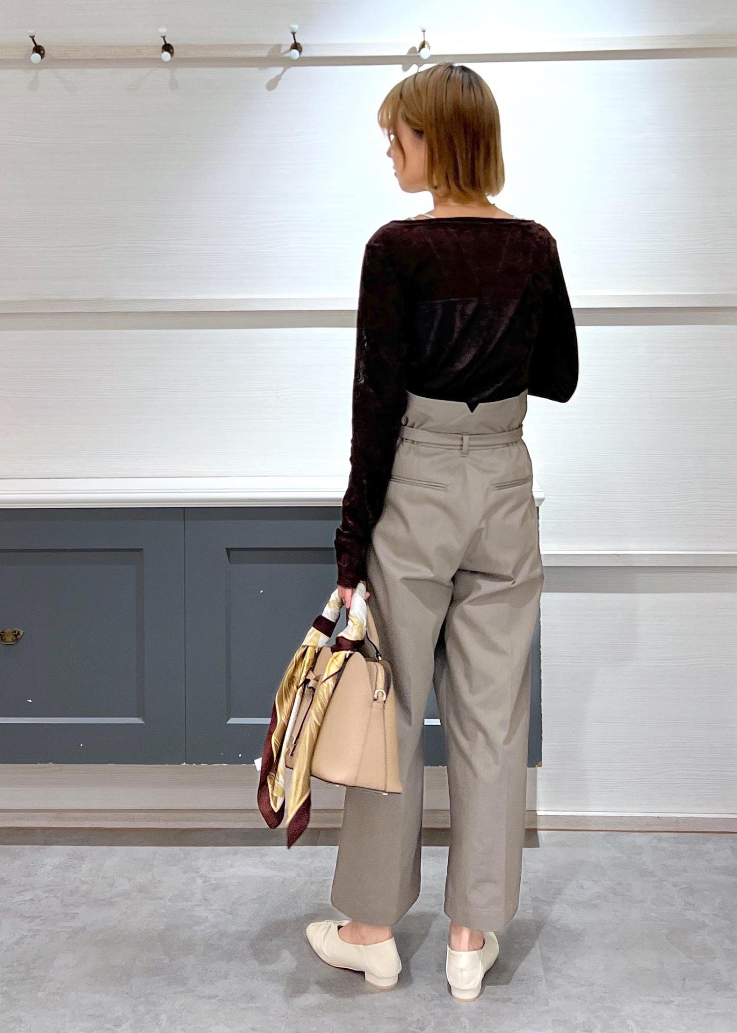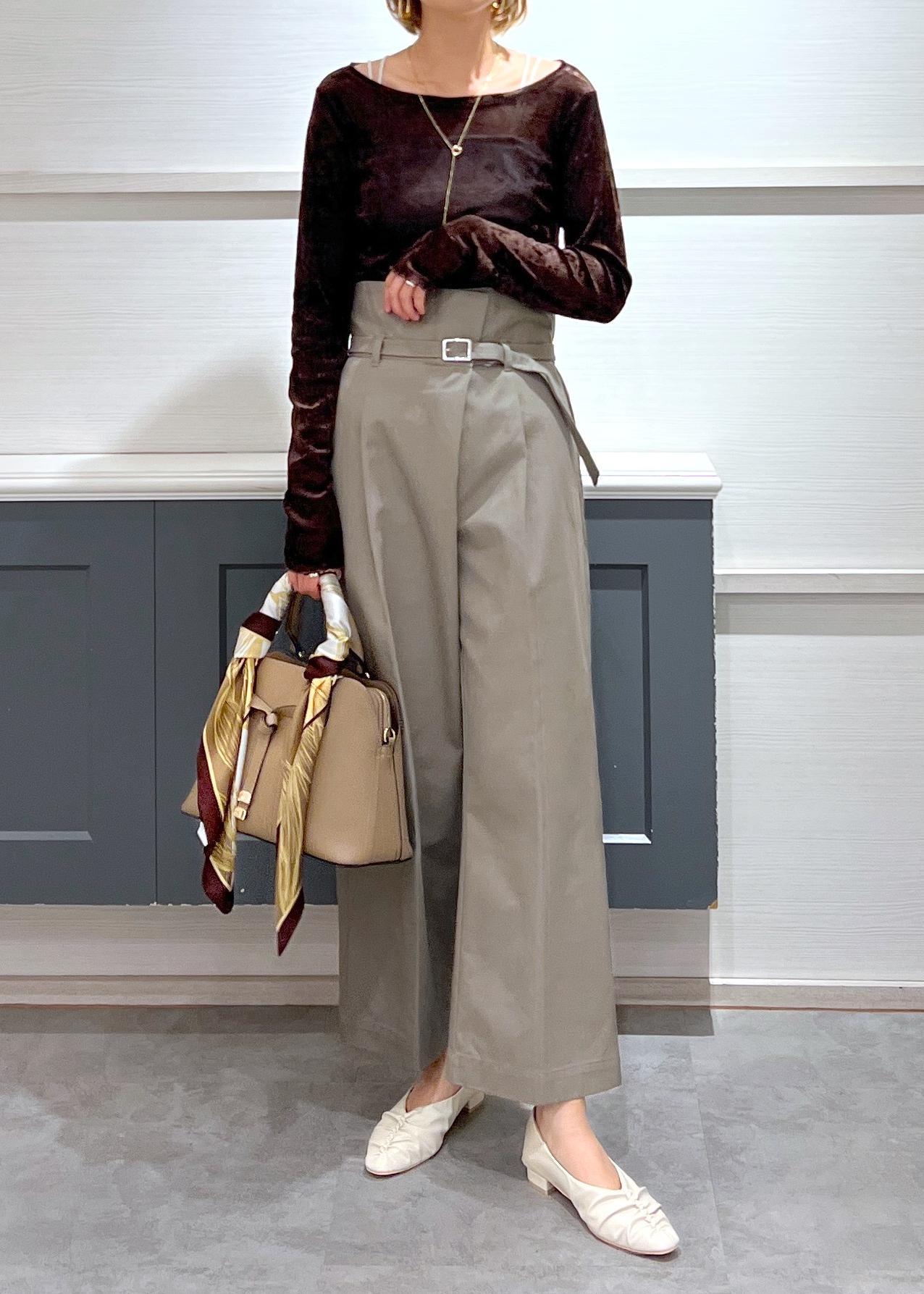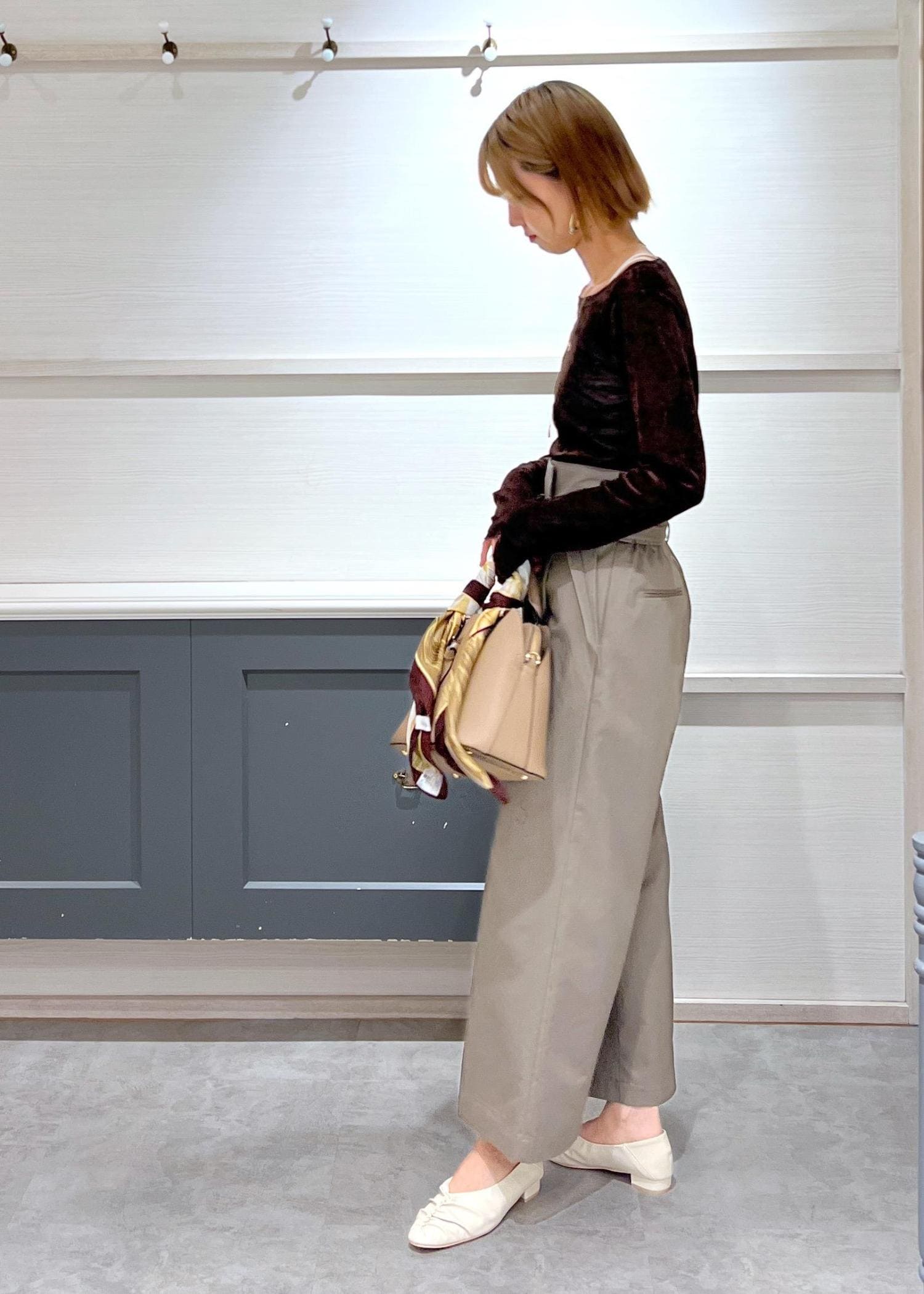 ブラウンのベロアトップスにグレージュのワイドパンツで、落ち着いた大人バランス。