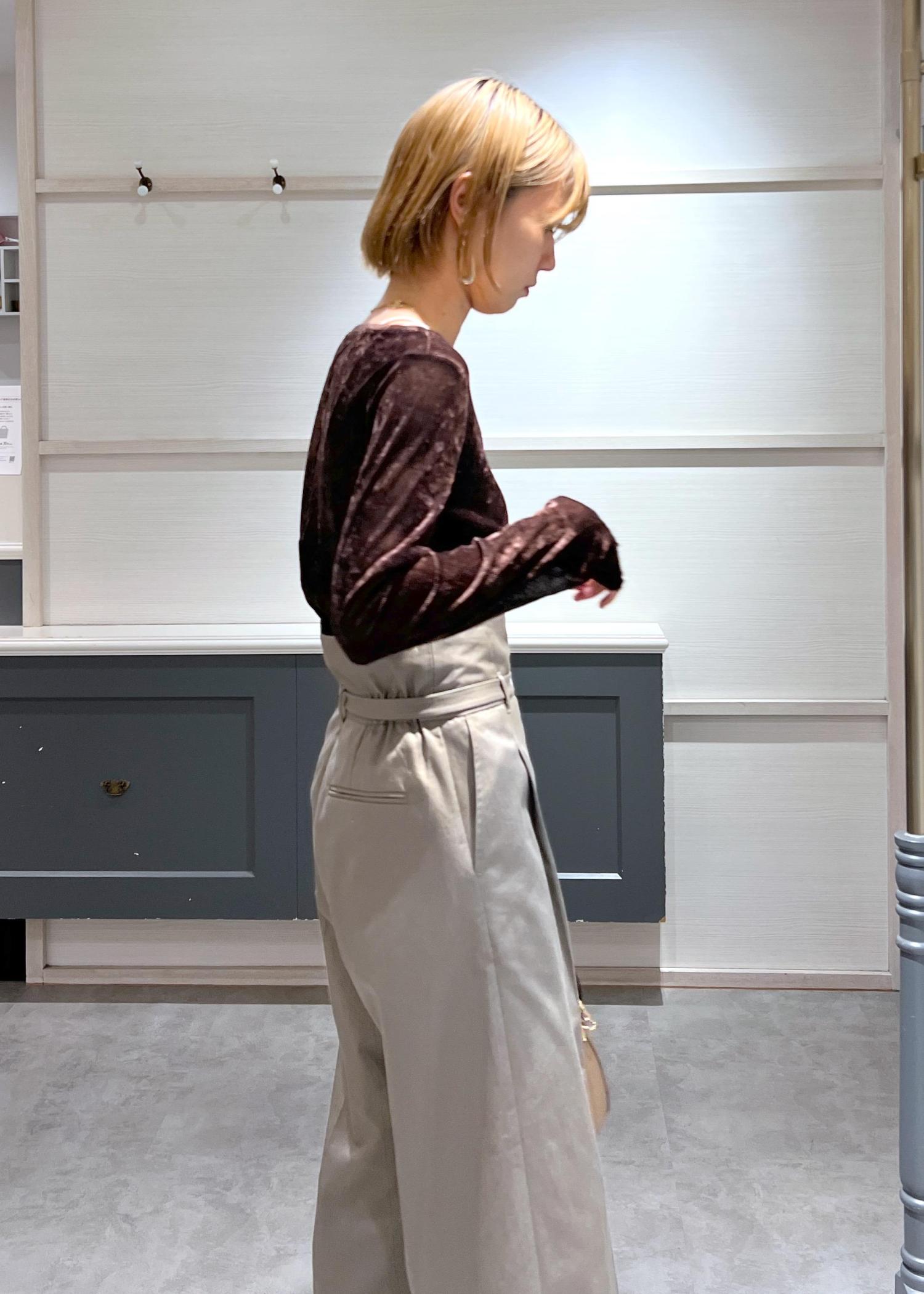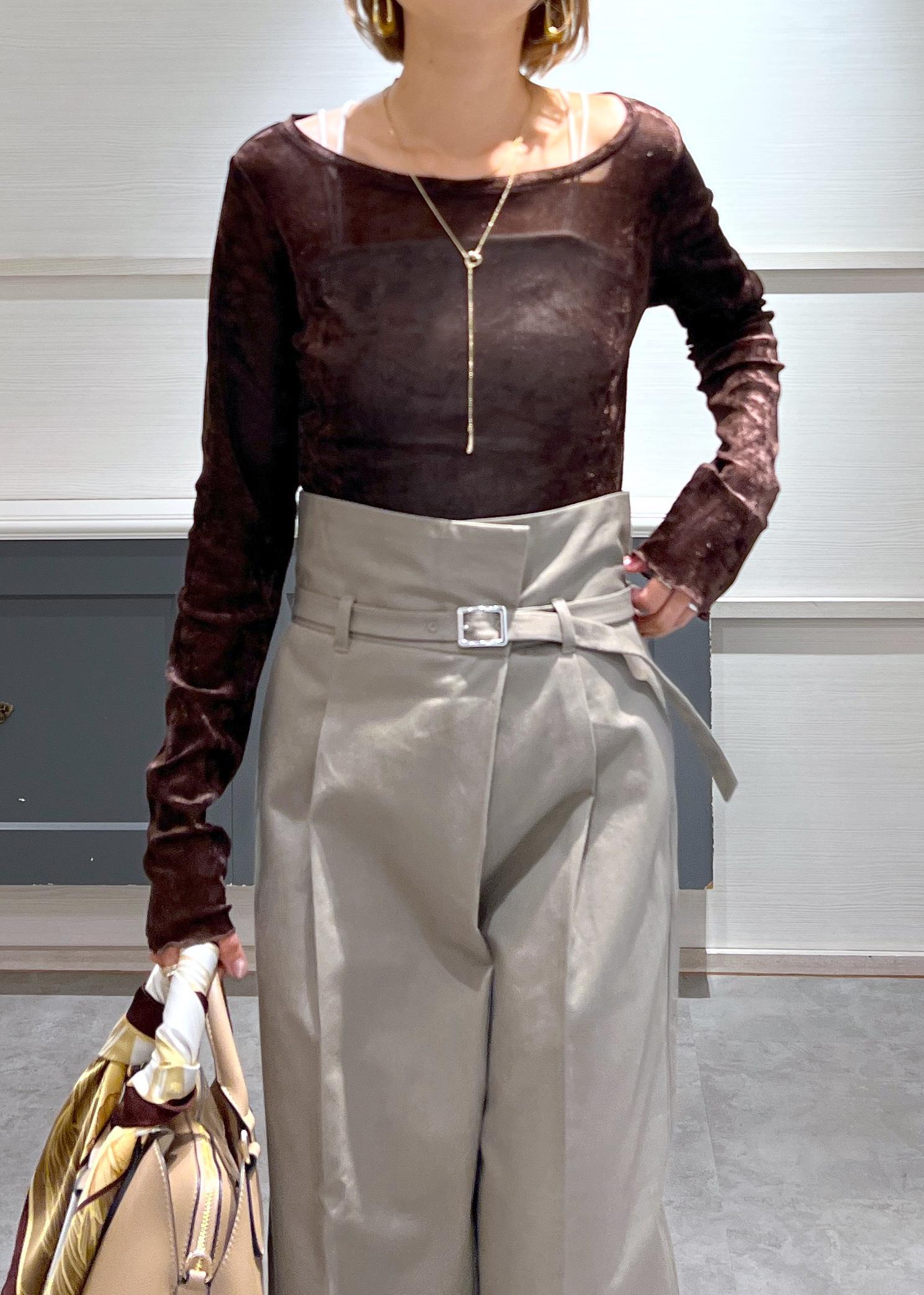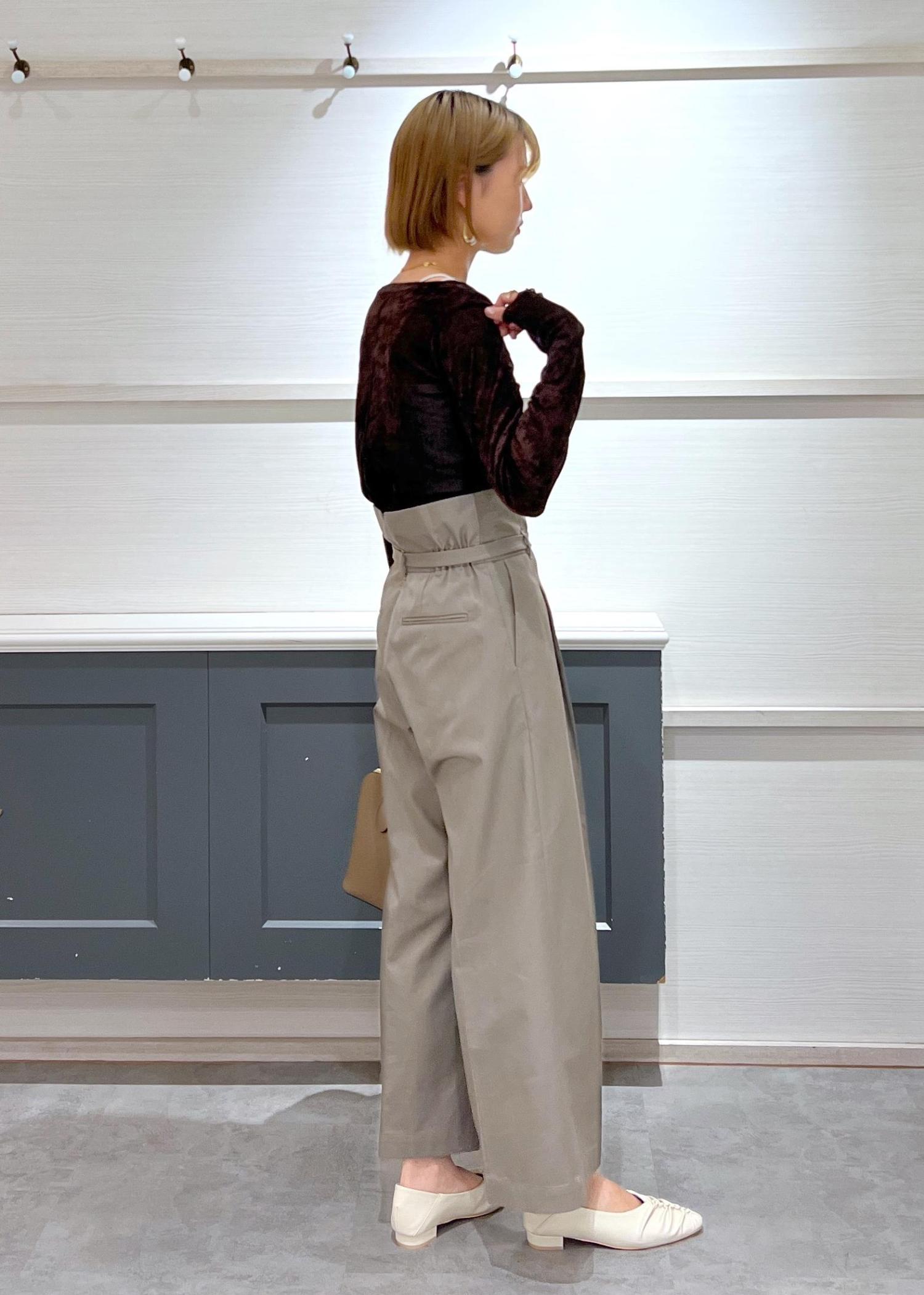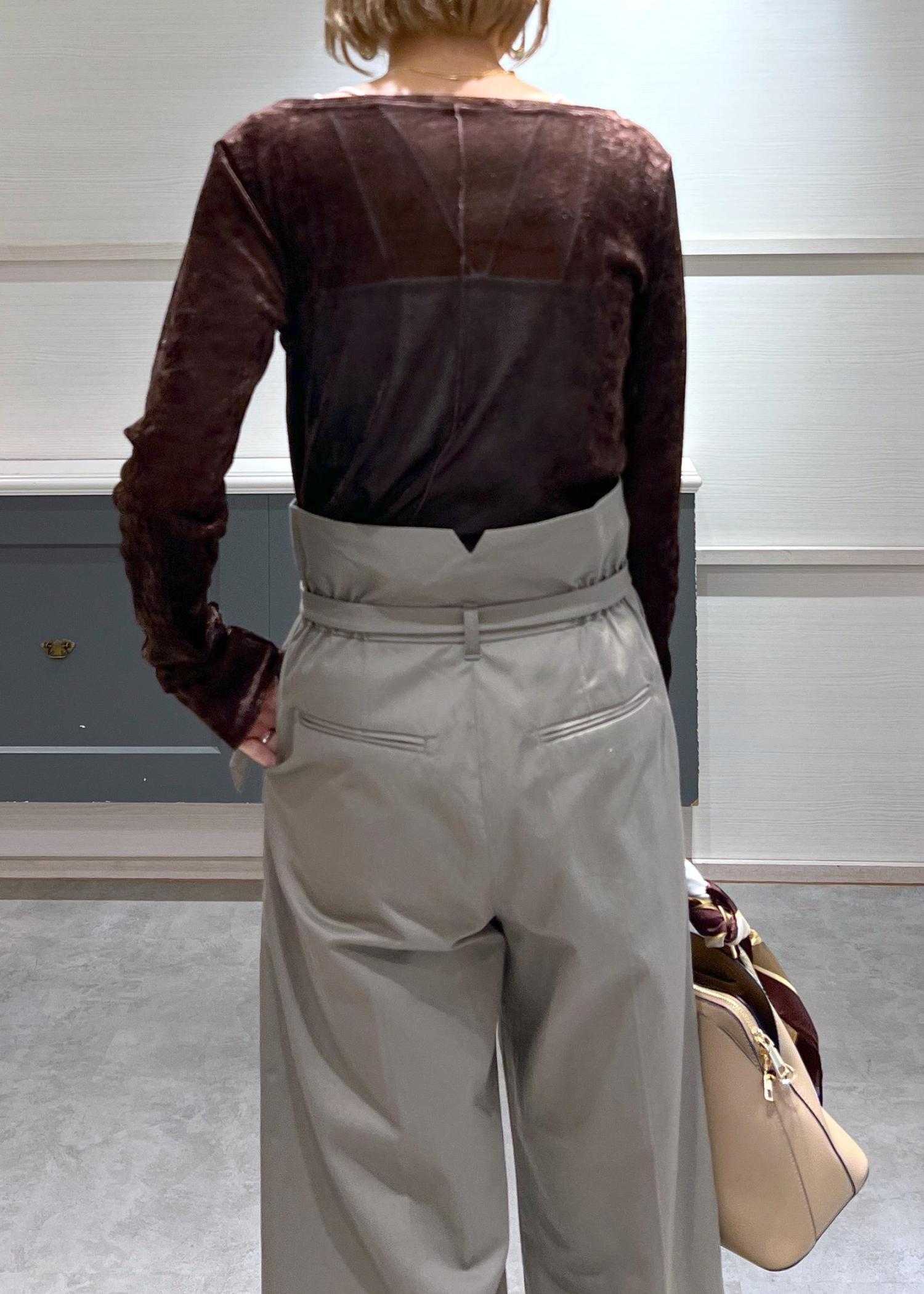ブラウンのベロアトップスにグレージュのワイドパンツで、落ち着いた大人バランス。