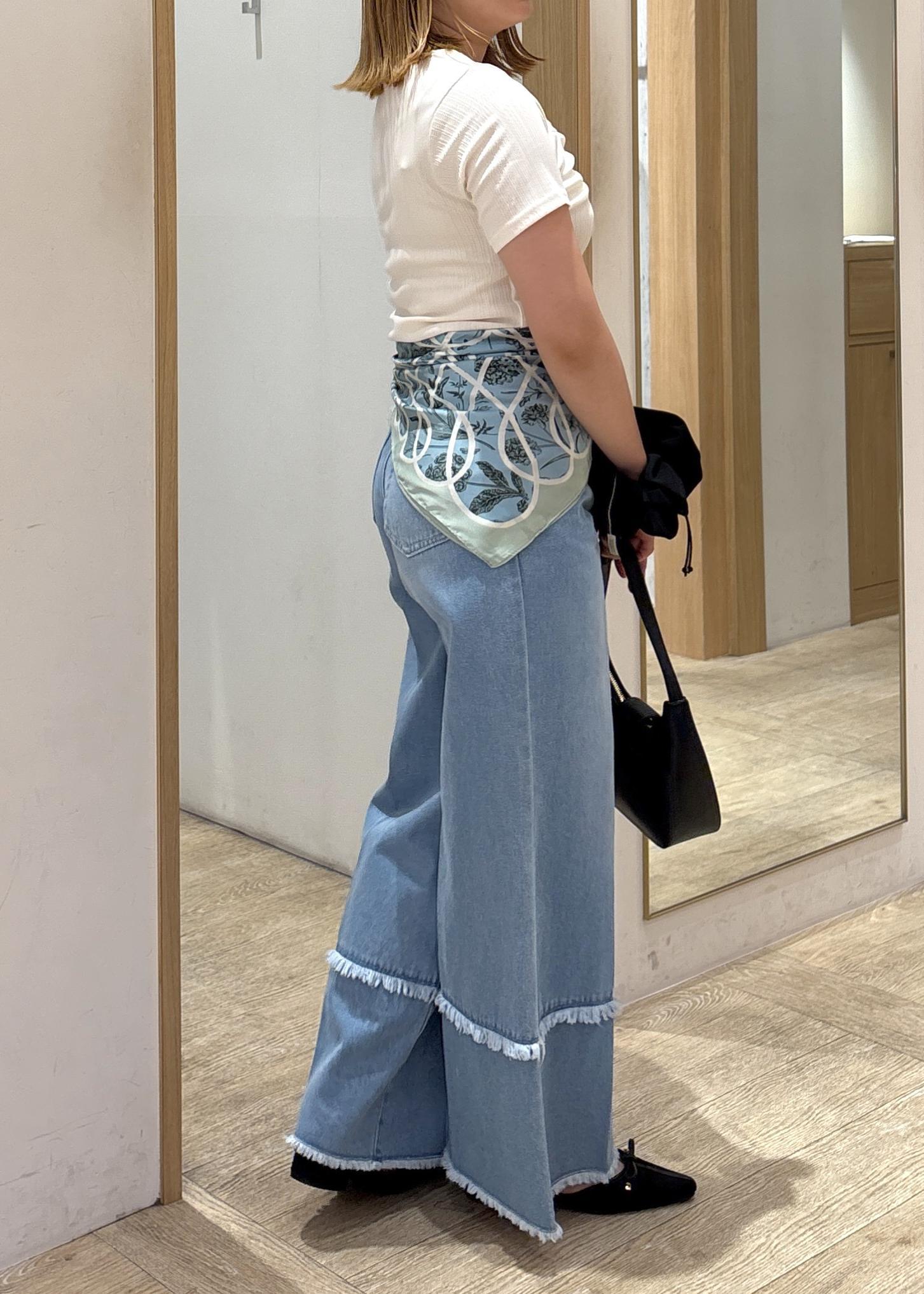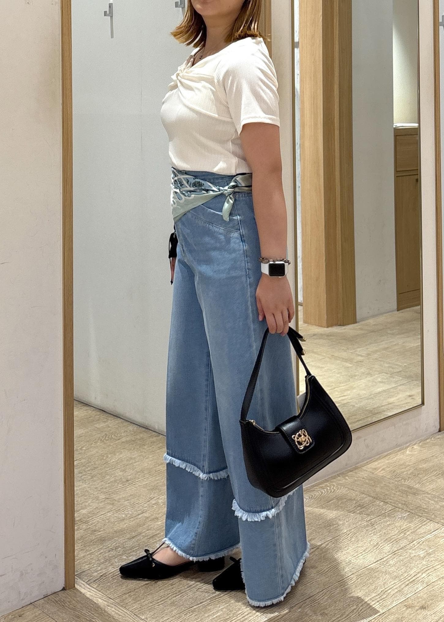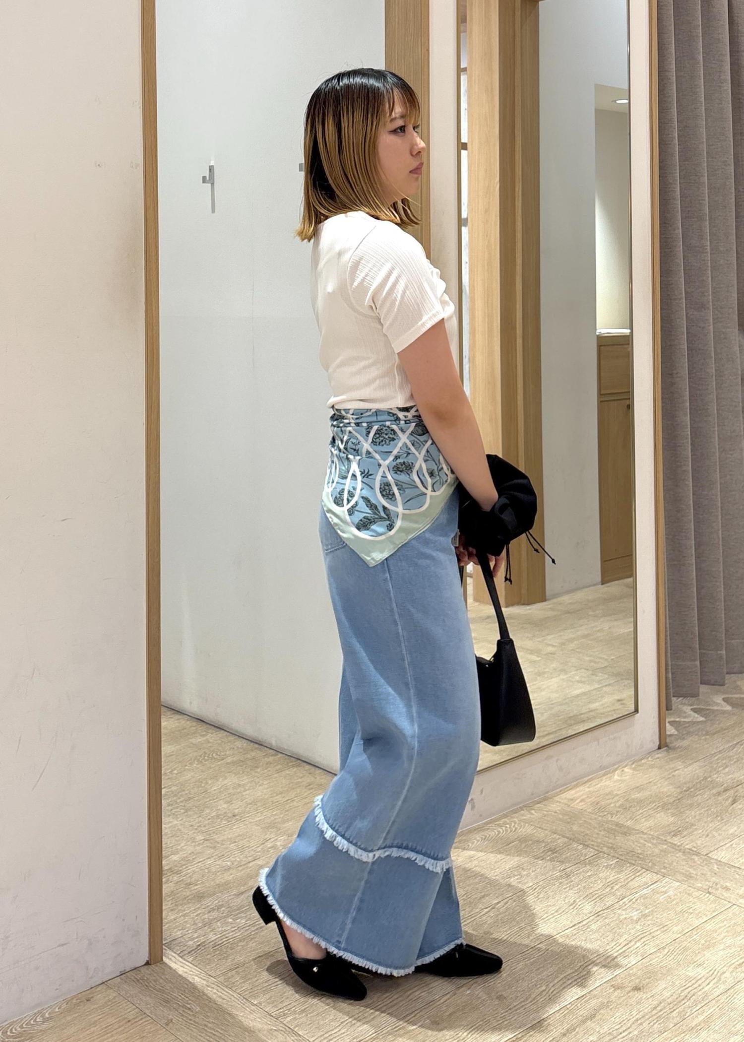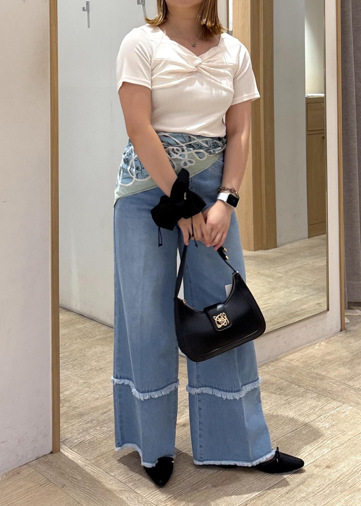いつものカジュアルの雰囲気が、スカーフ1枚でラグジュアリーでリゾート感のあるコーデに仕上がります!
