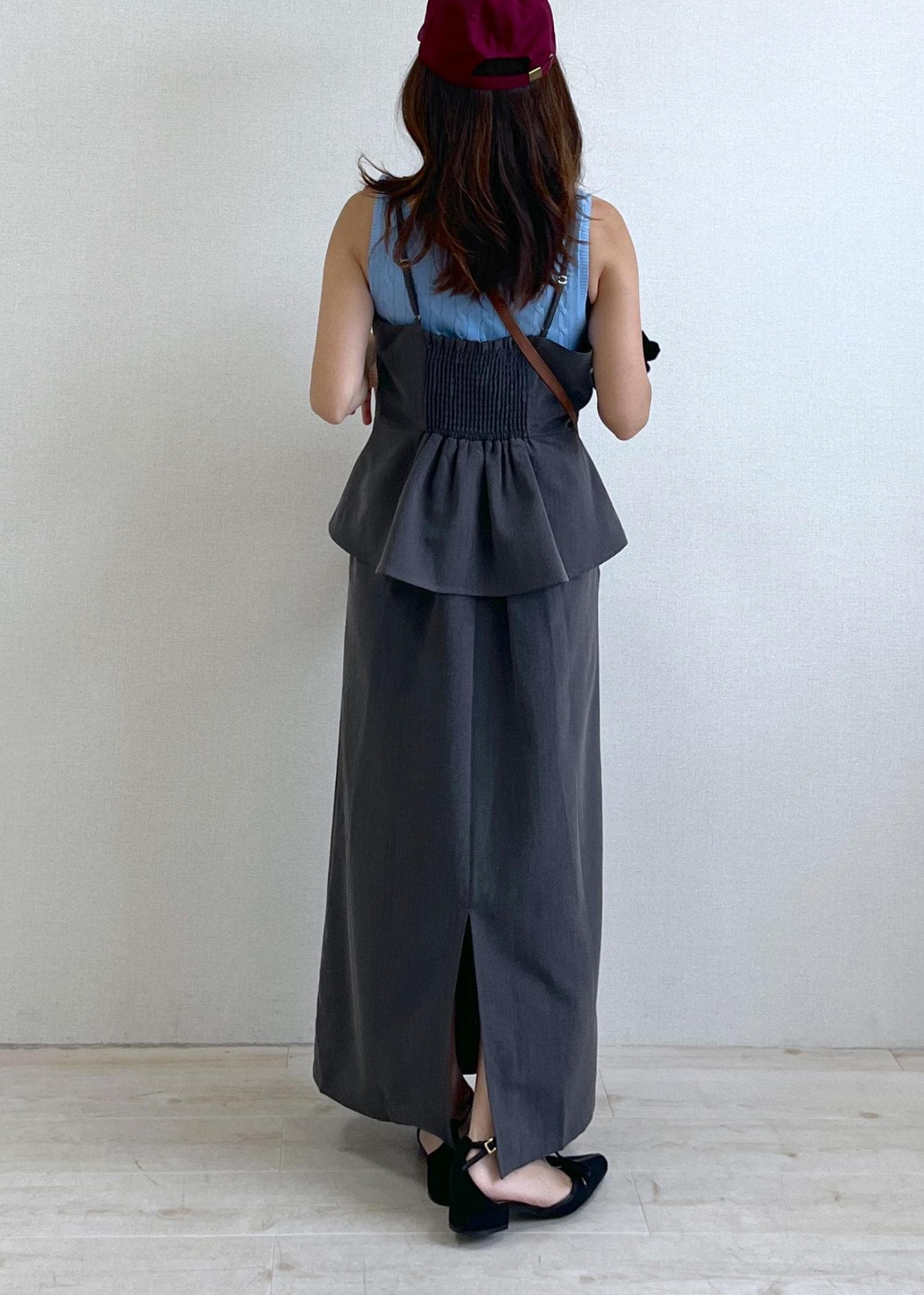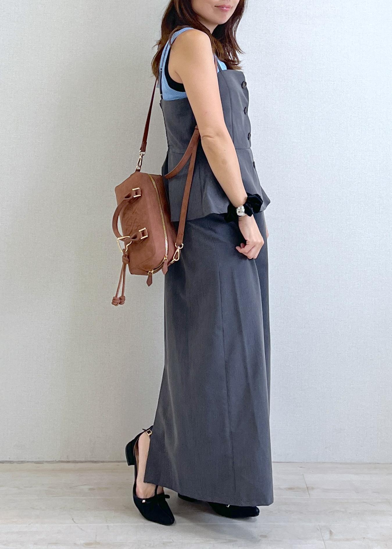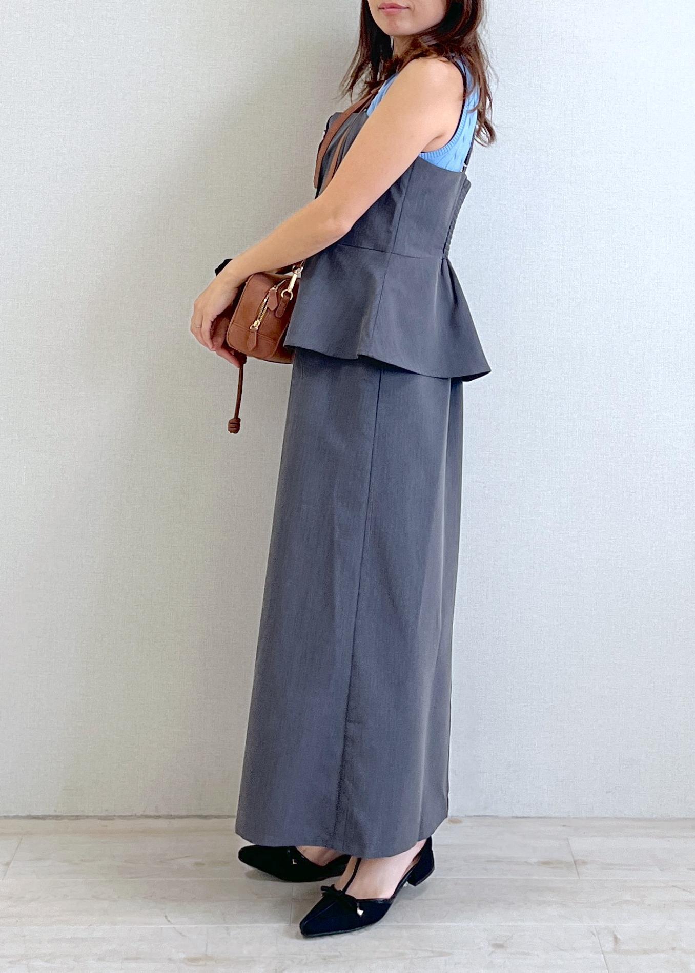 チャコールグレーのセットアップ風ワンピースに、ブルーのインナーをチラ見せして爽やかさをプラス。