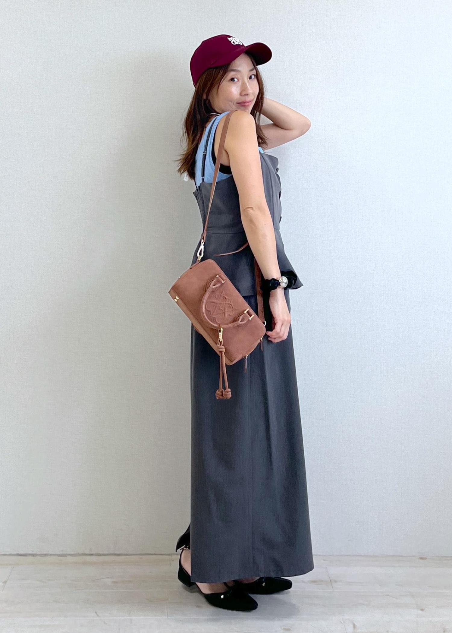 落ち着いた配色ながら、キャップとブラウンバッグで程よくカジュアルダウンすることで“気取らない大人のお出かけスタイル”に仕上がります。