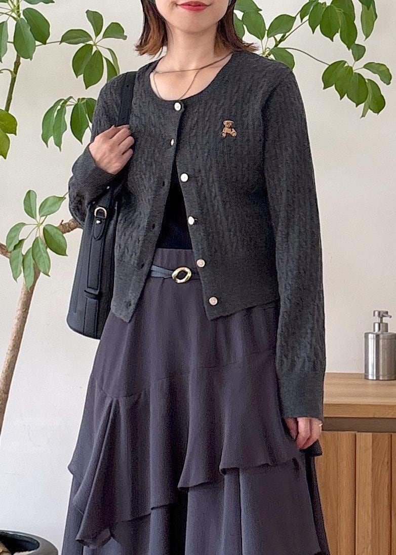 毎シーズン人気のPOLO BCS | VIS別注のカーディガン♪ミニケーブル編みで程よいフィット感のある大人可愛いカーディガンをトップス見せ、今年らしいティアードスカートでワントーンにまとめました◎小物は黒でスッキリと。秋にオススメの大人カジュアルコーデ。