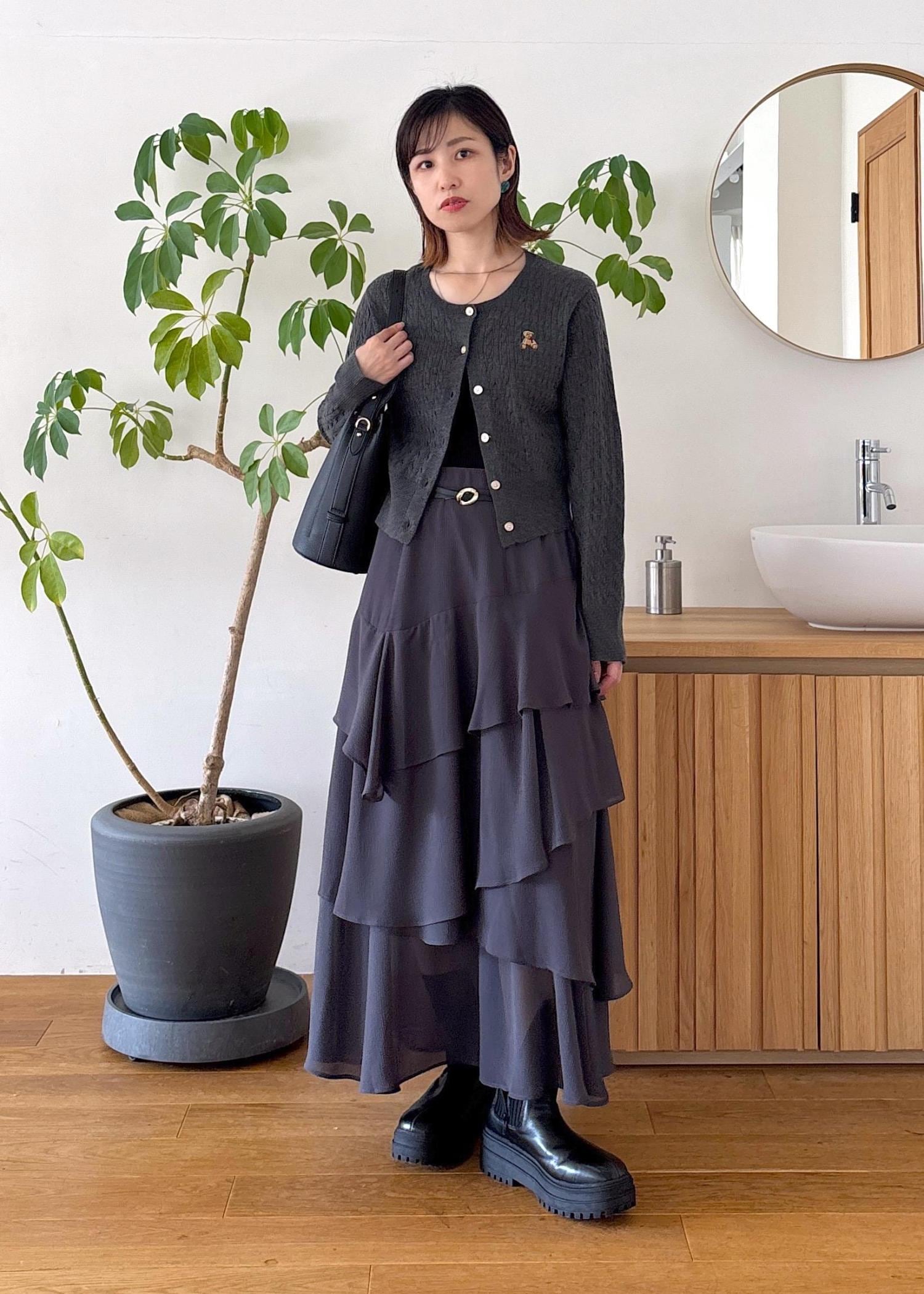 VIS花柄アソート楊柳ティアードスカートチャコール / F¥4,613レビュートレンドのティアードスカート♪4段ティアードがアシンメトリー風にあしらっている、大人可愛いデザイン。さらっとした着心地でとても軽くて着やすさ◎ウエストも半分近くゴムを使用しているためストレスフリー。全体的にほどよくゆったり、着丈は足首が少しだけ見えるくらいの長さでした。