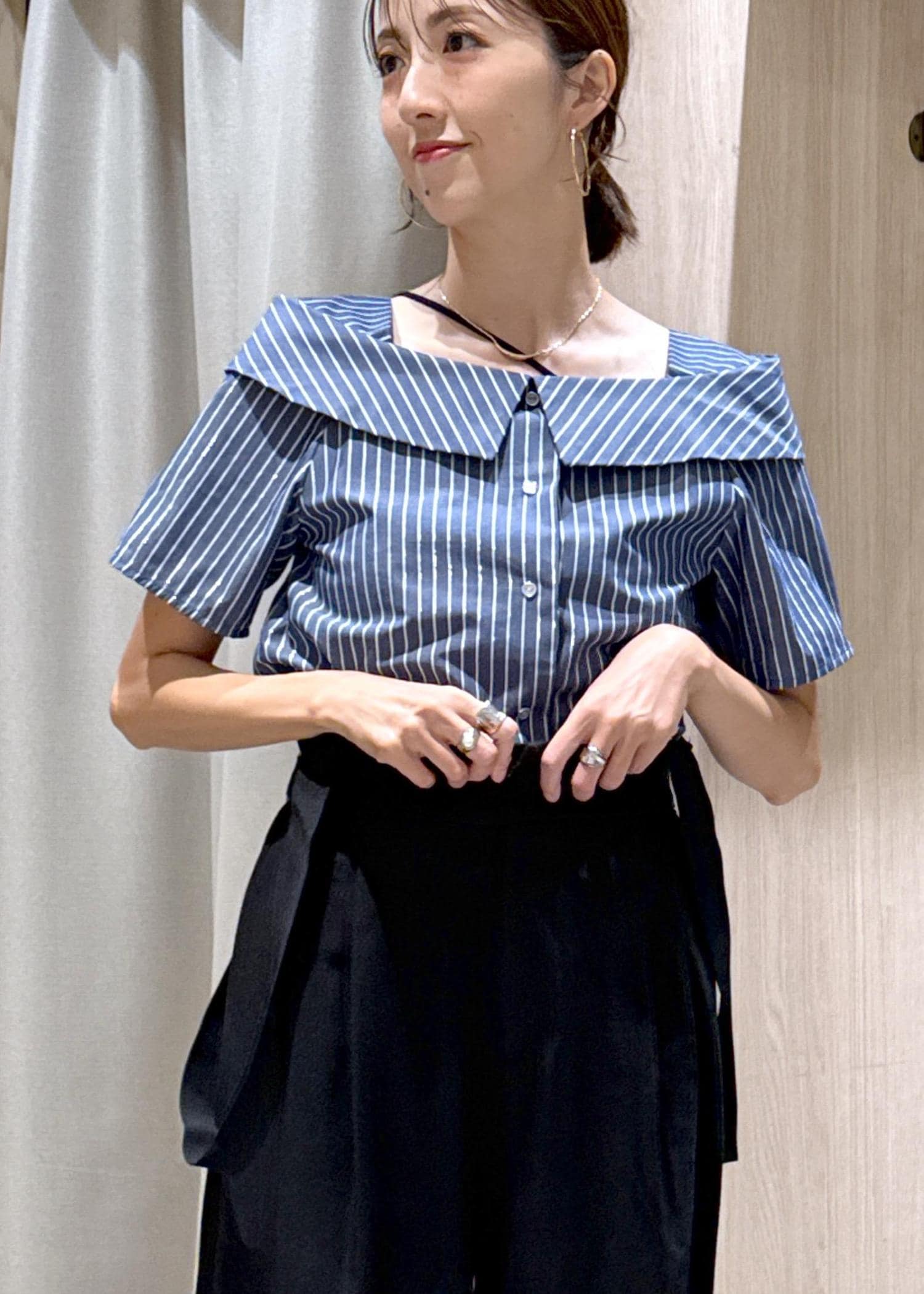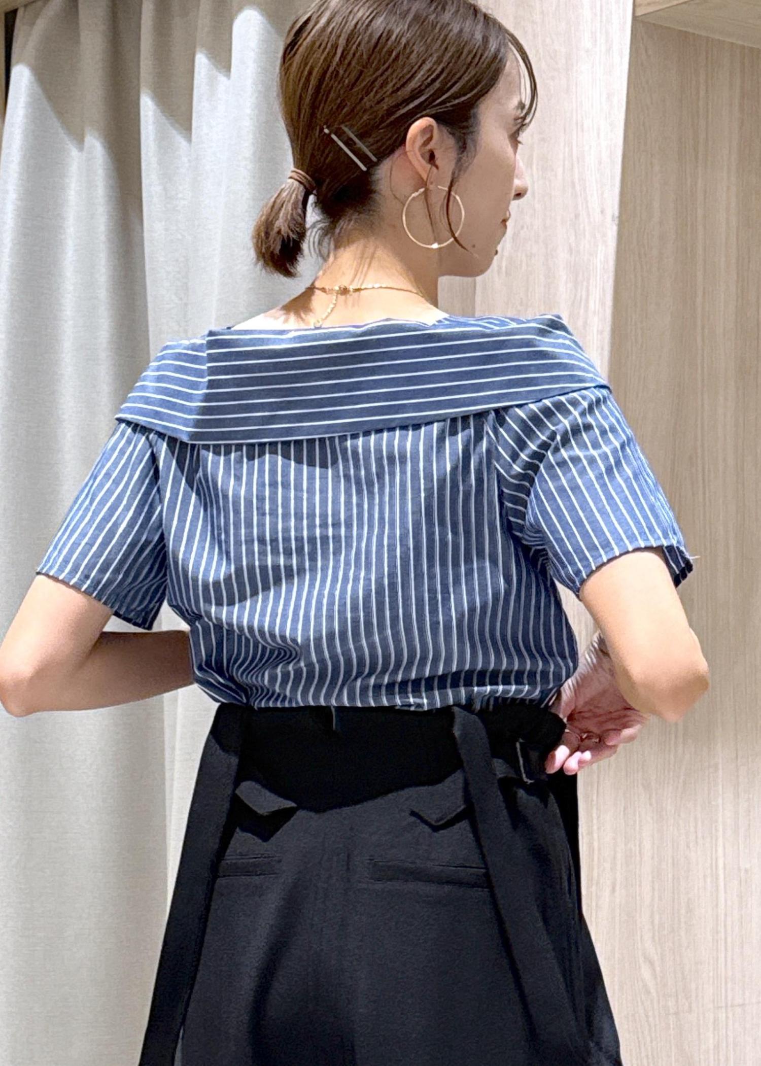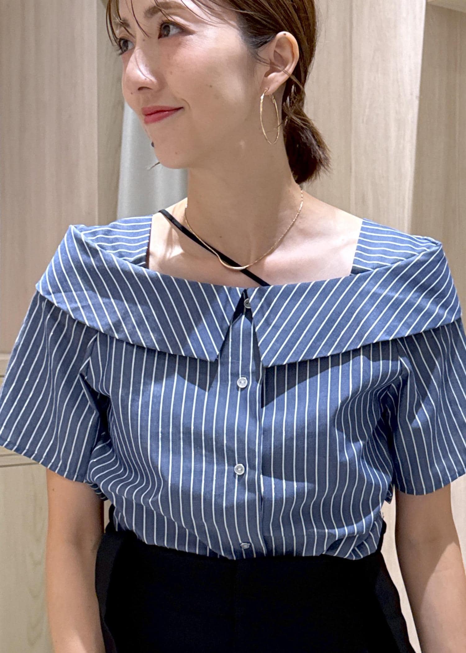 オフショルダー風のデザインで一枚でオシャレ感のあるブラウス。