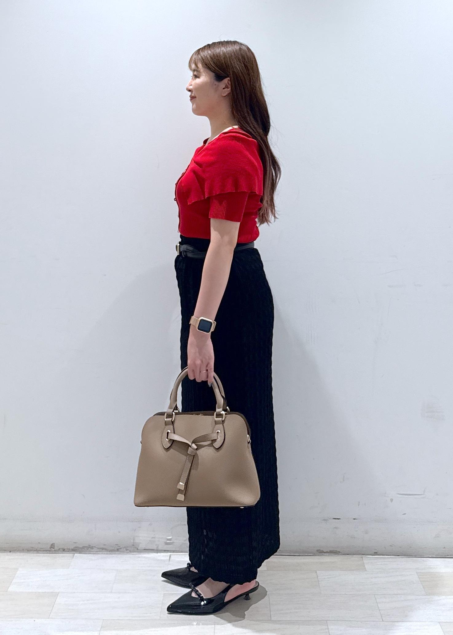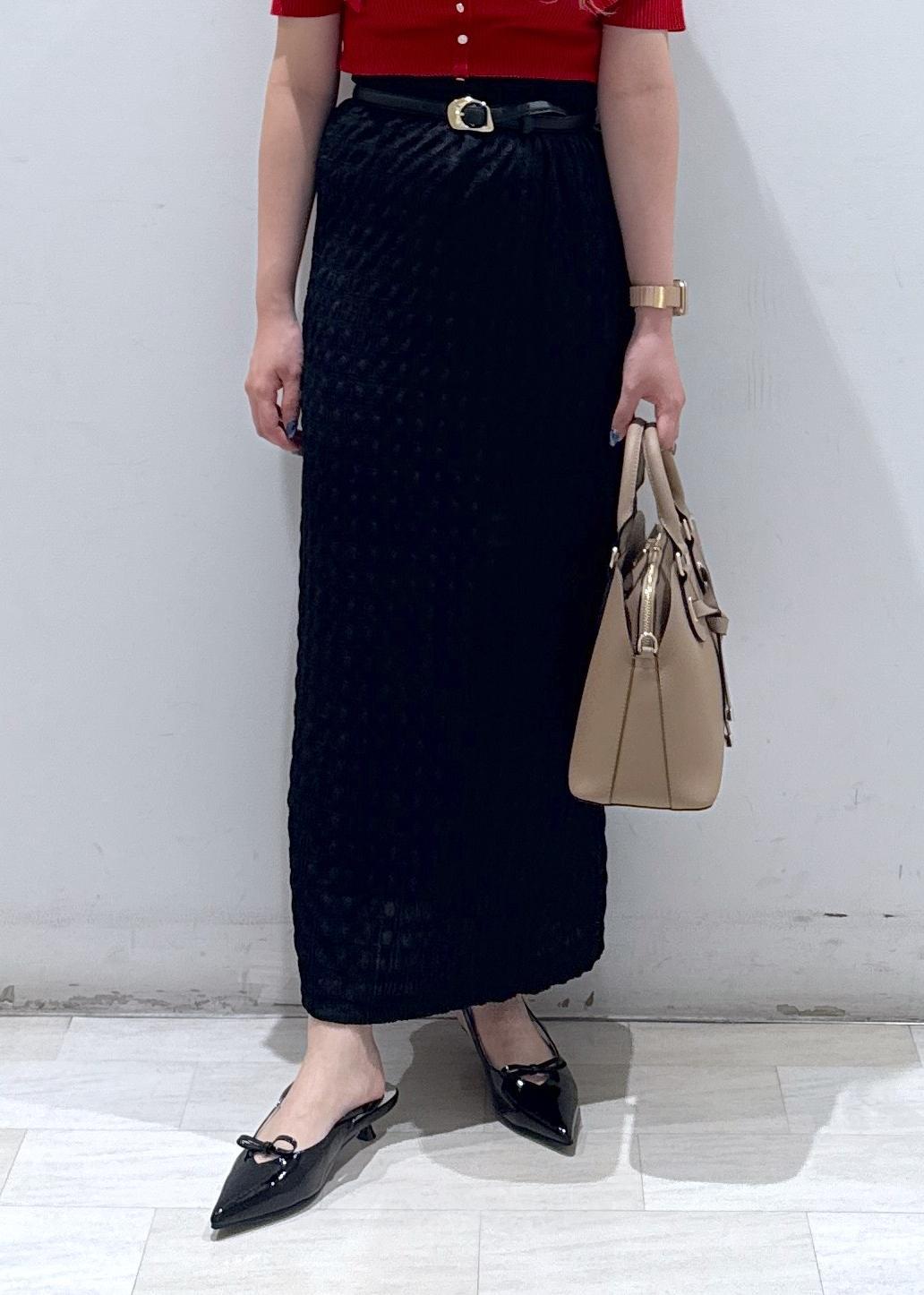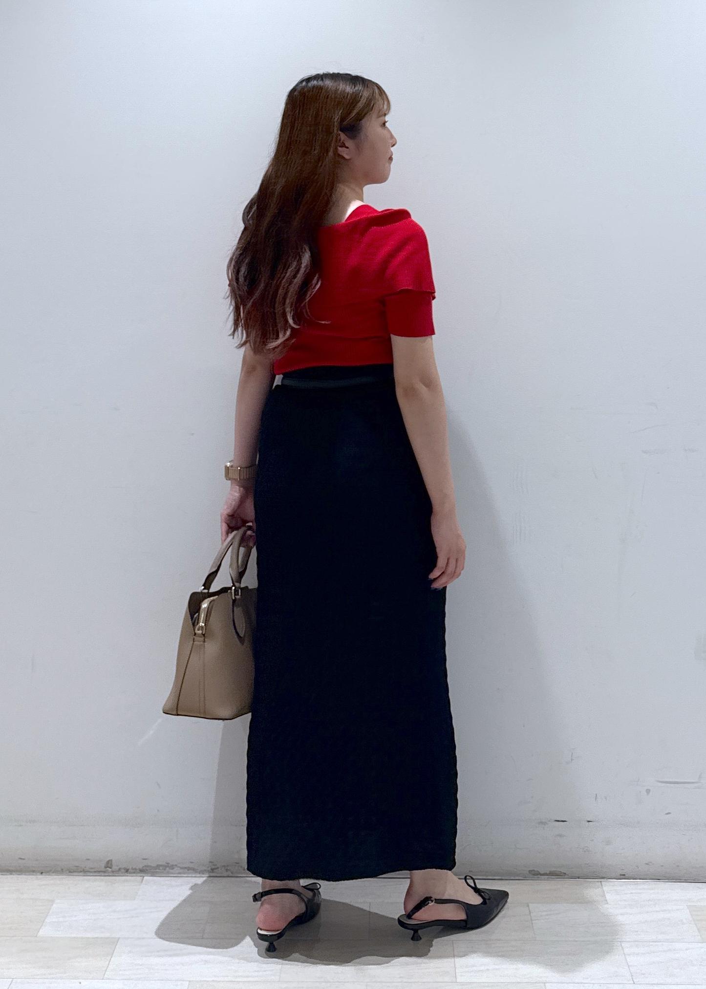 今回は新作で入ってきました大人気の赤のオフショル風ニットトップスに王道なブラックのIラインのスカートと合わせて、お仕事の通勤としても着れる綺麗めなコーディネートにしてみました。