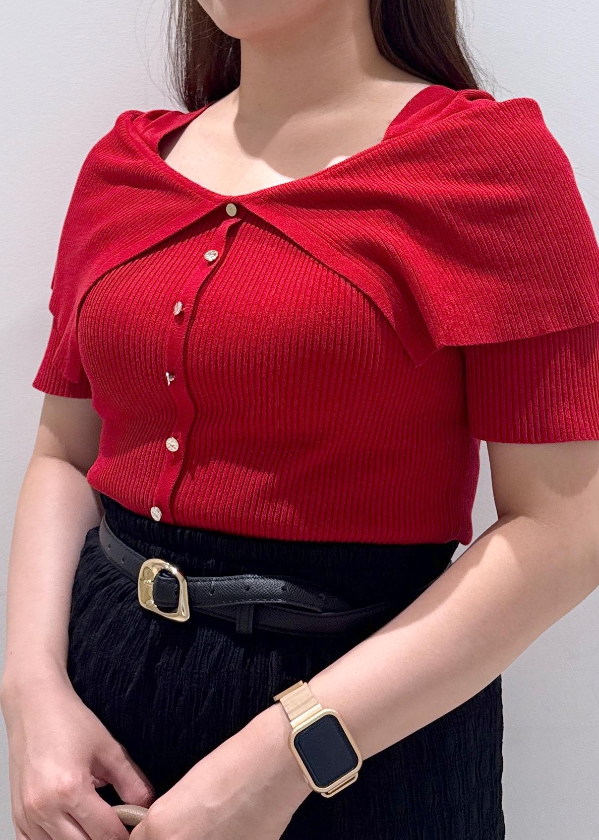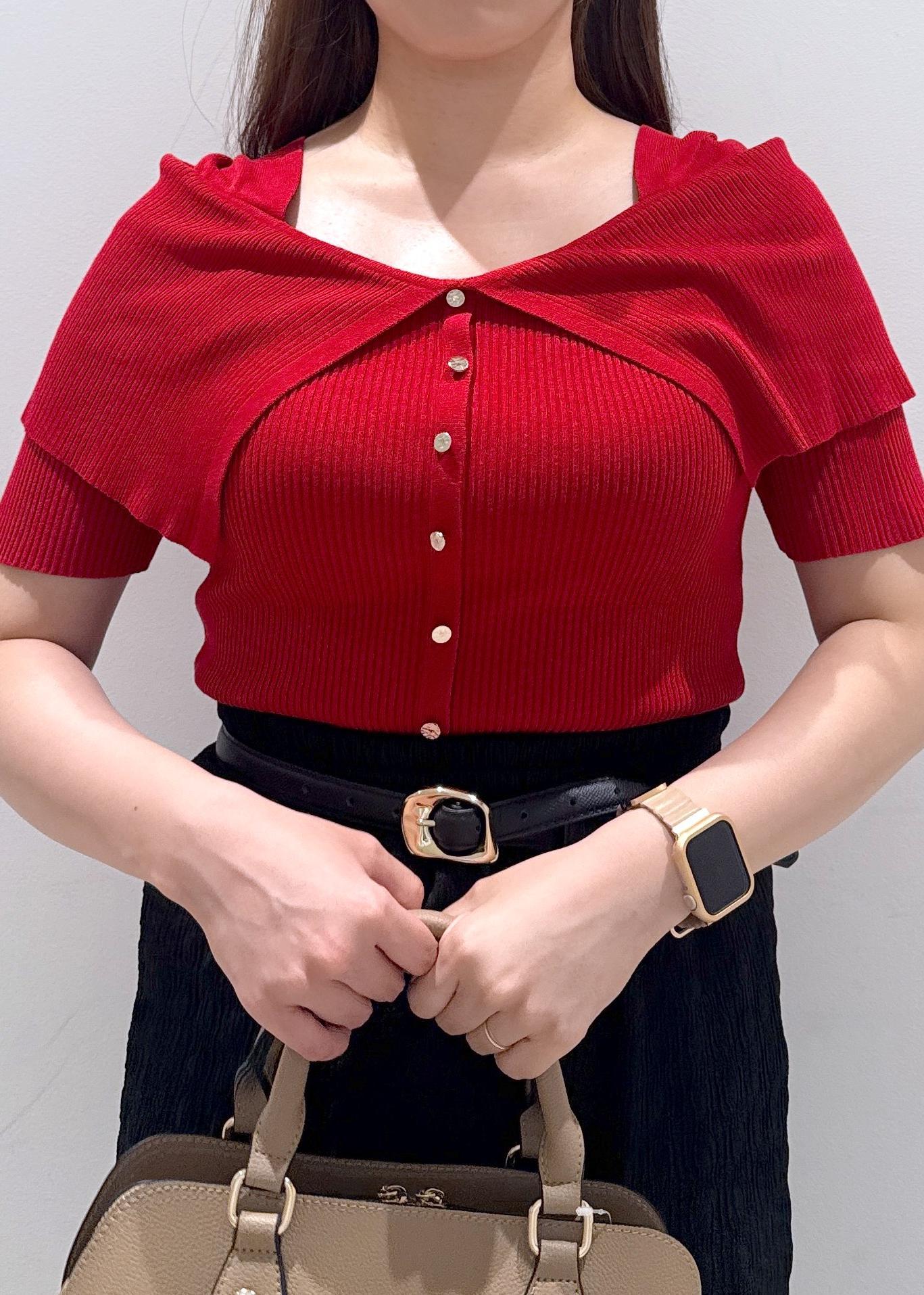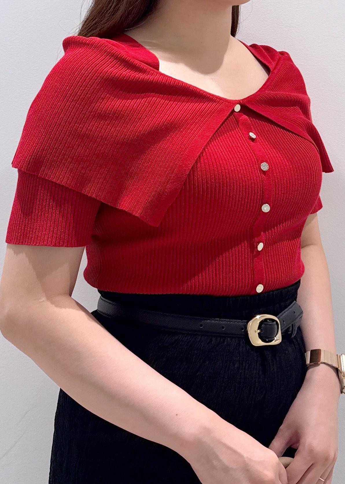 今回は新作で入ってきました大人気の赤のオフショル風ニットトップスに王道なブラックのIラインのスカートと合わせて、お仕事の通勤としても着れる綺麗めなコーディネートにしてみました。