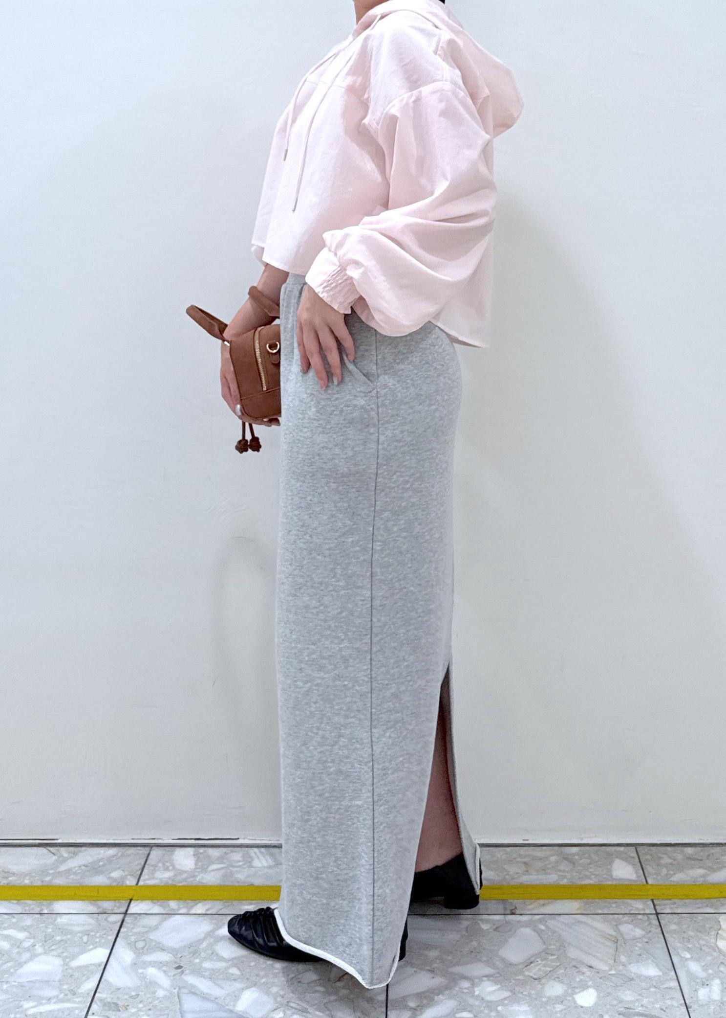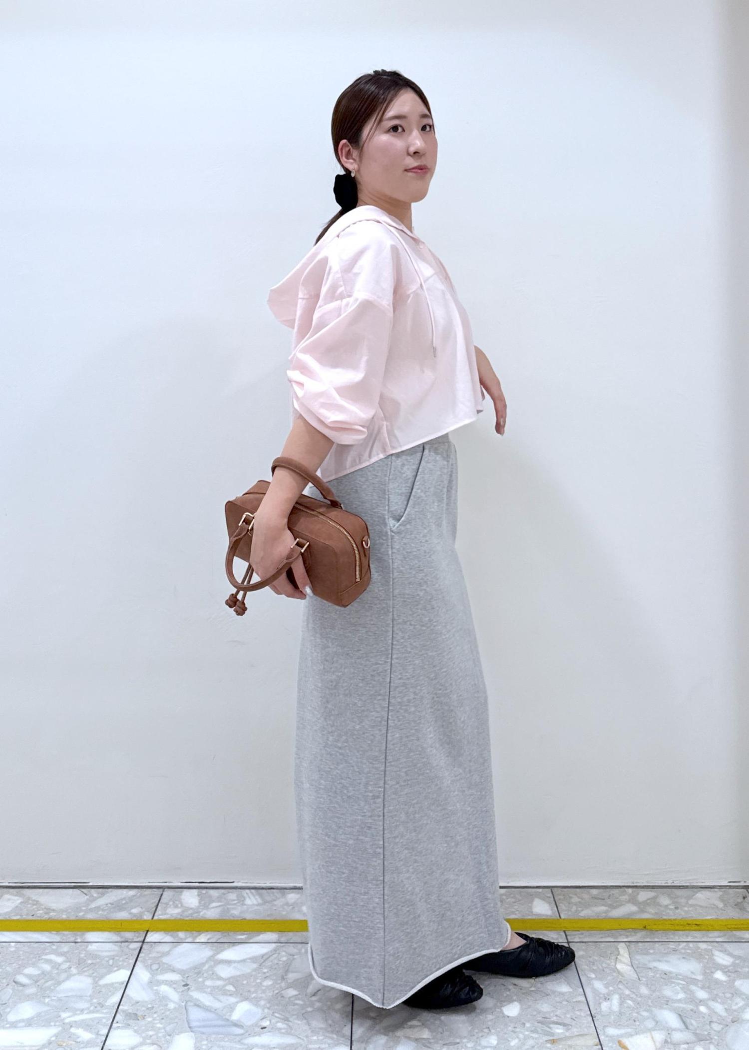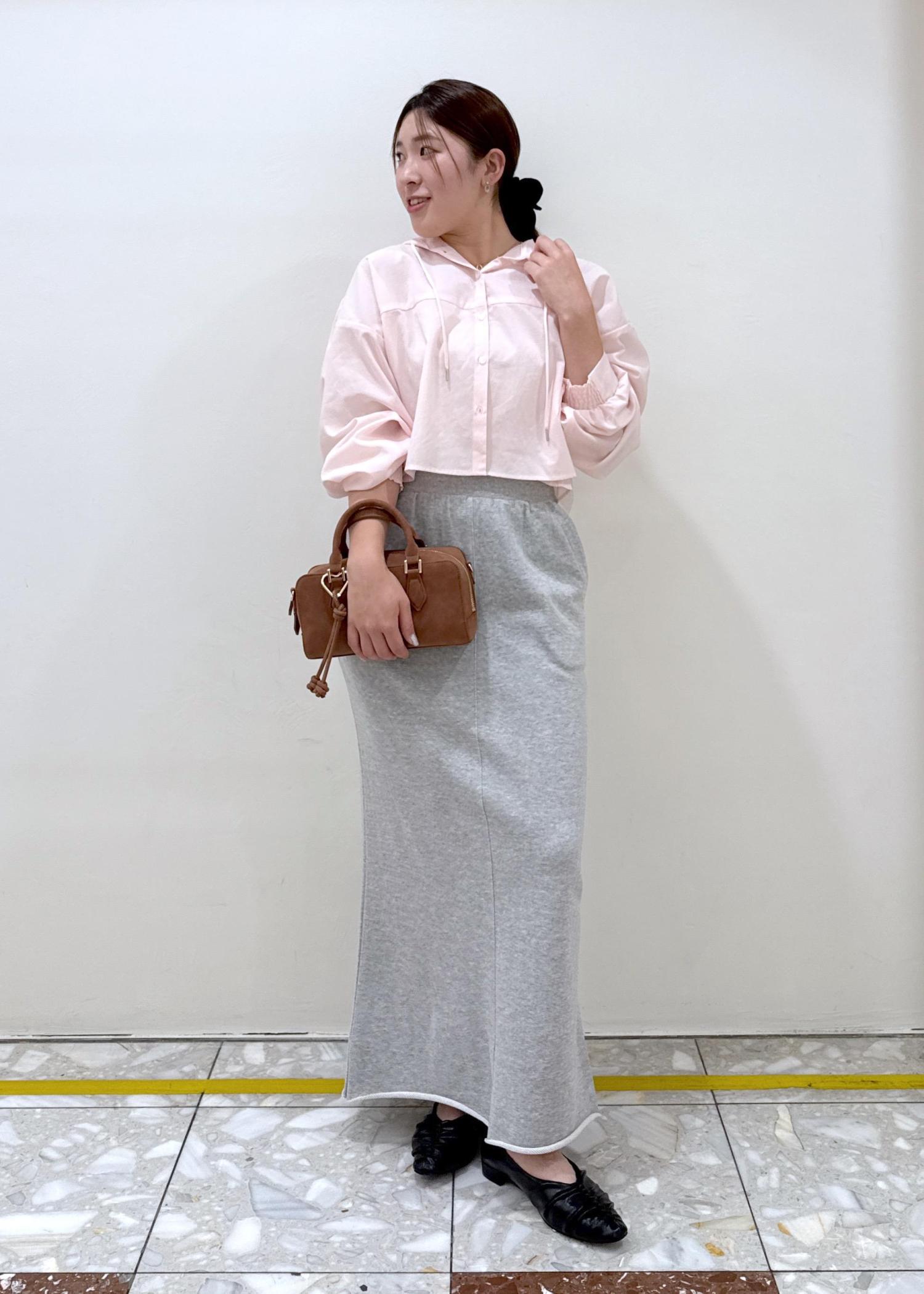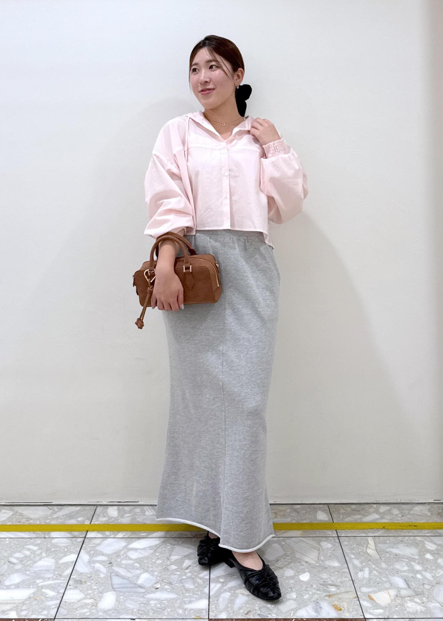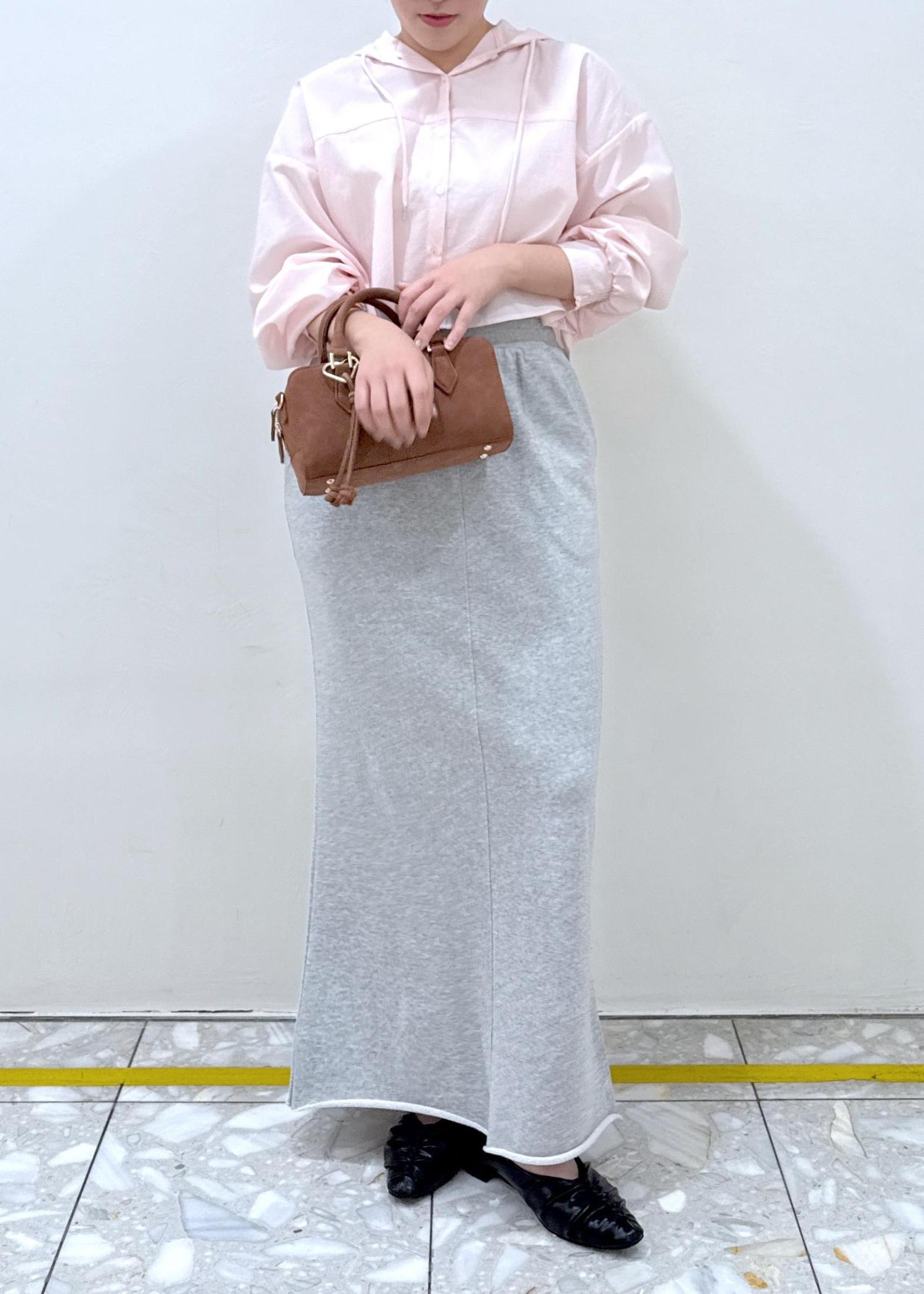 トレンド感のあるスウェットスカートにショートシャツを合わせたカジュアルコーデ!