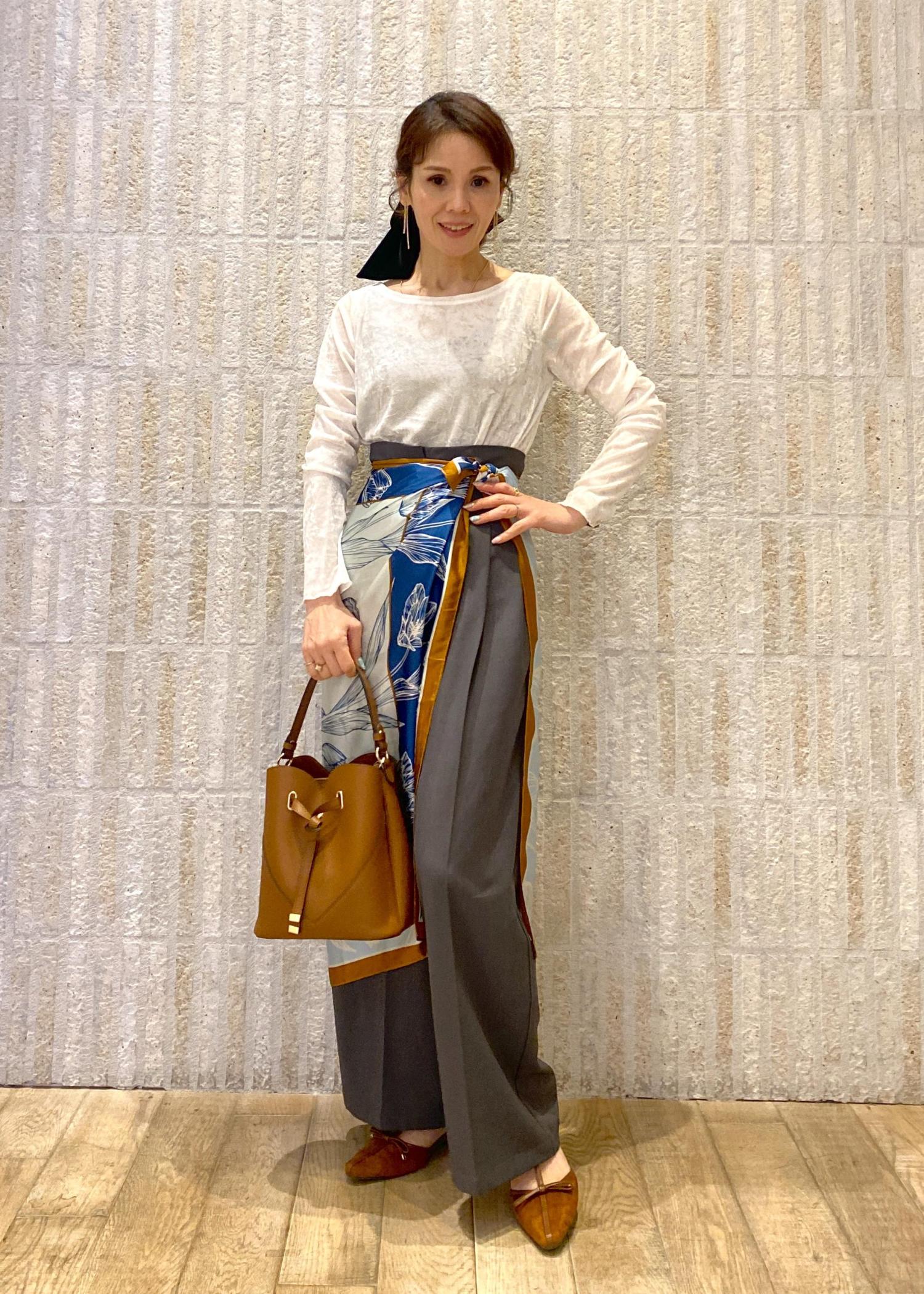 シンプルコーデにスカーフをアクセントに使用したコーデでちょっとこなれ感♡