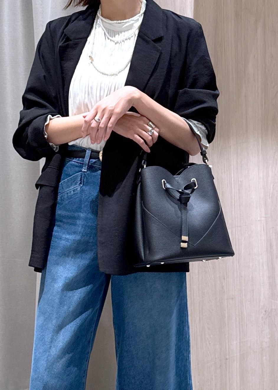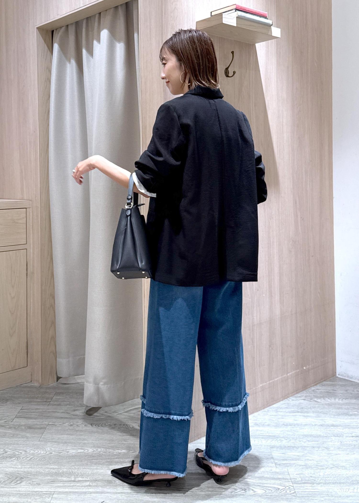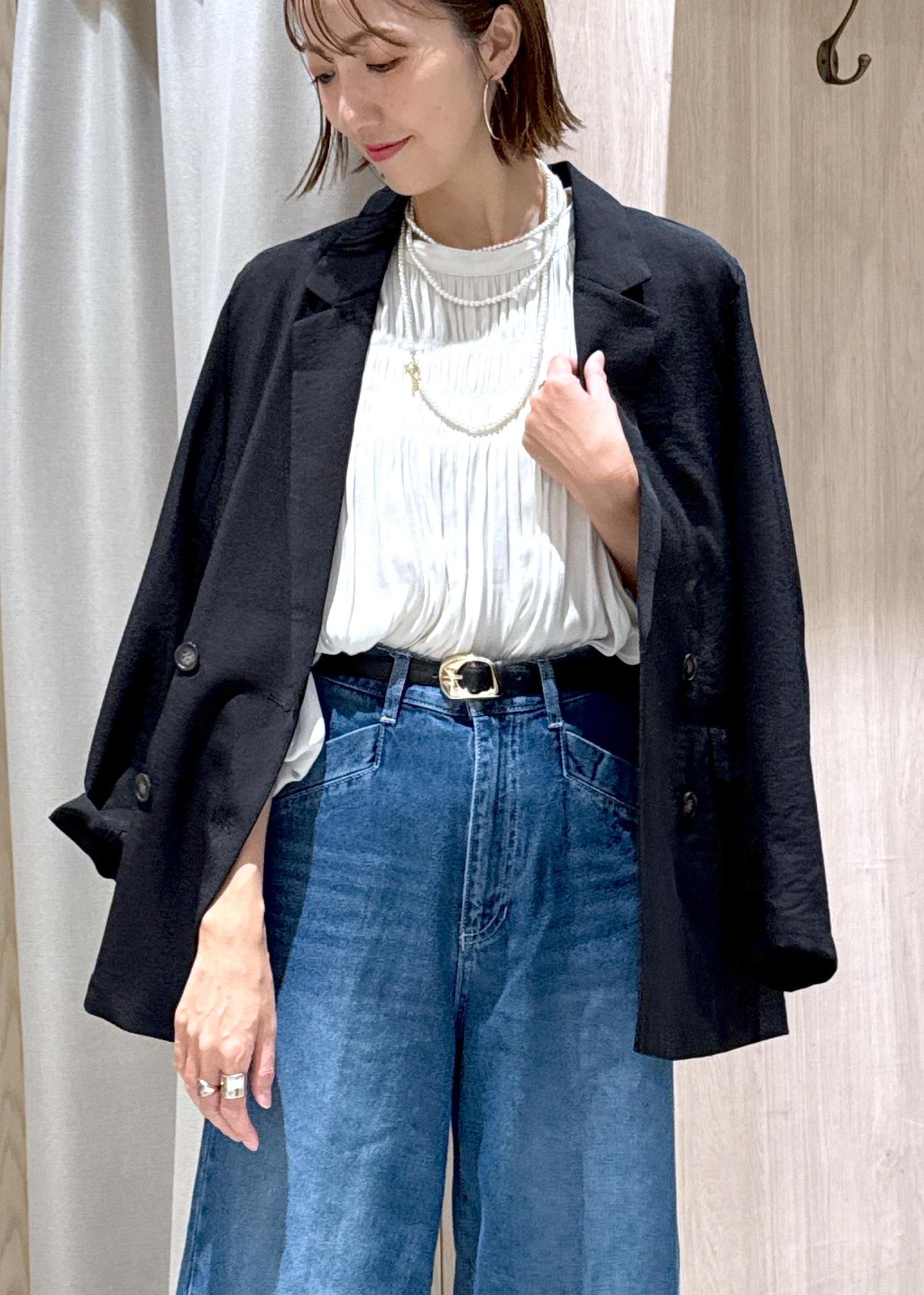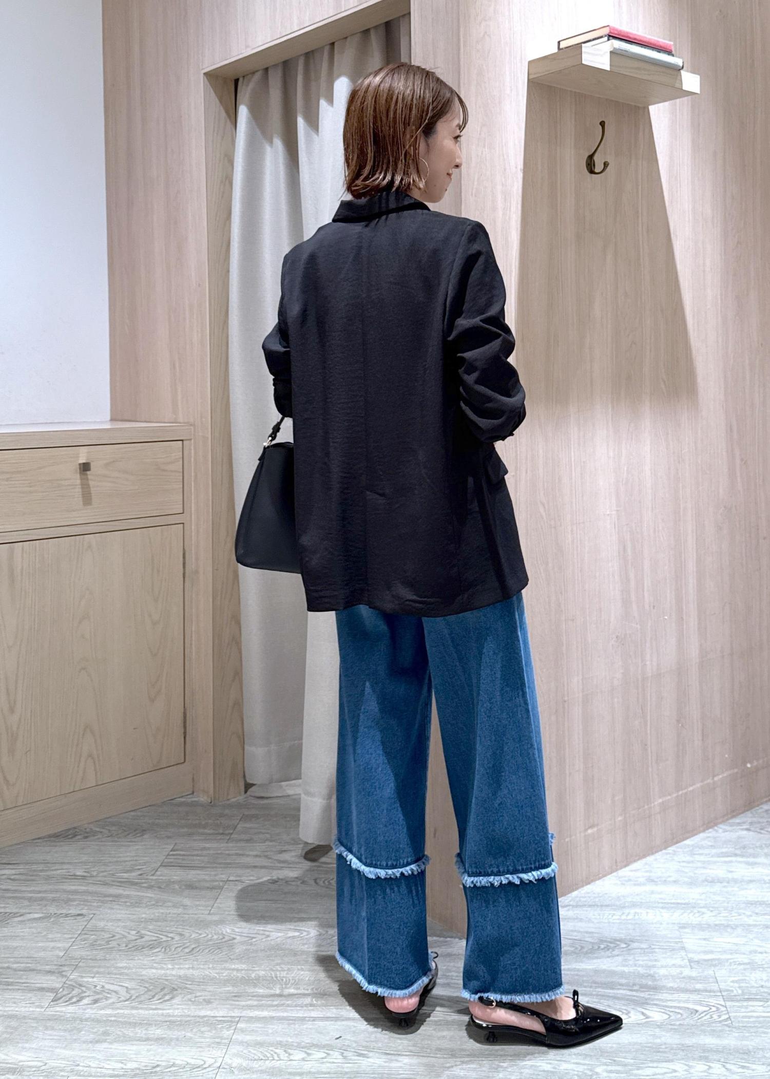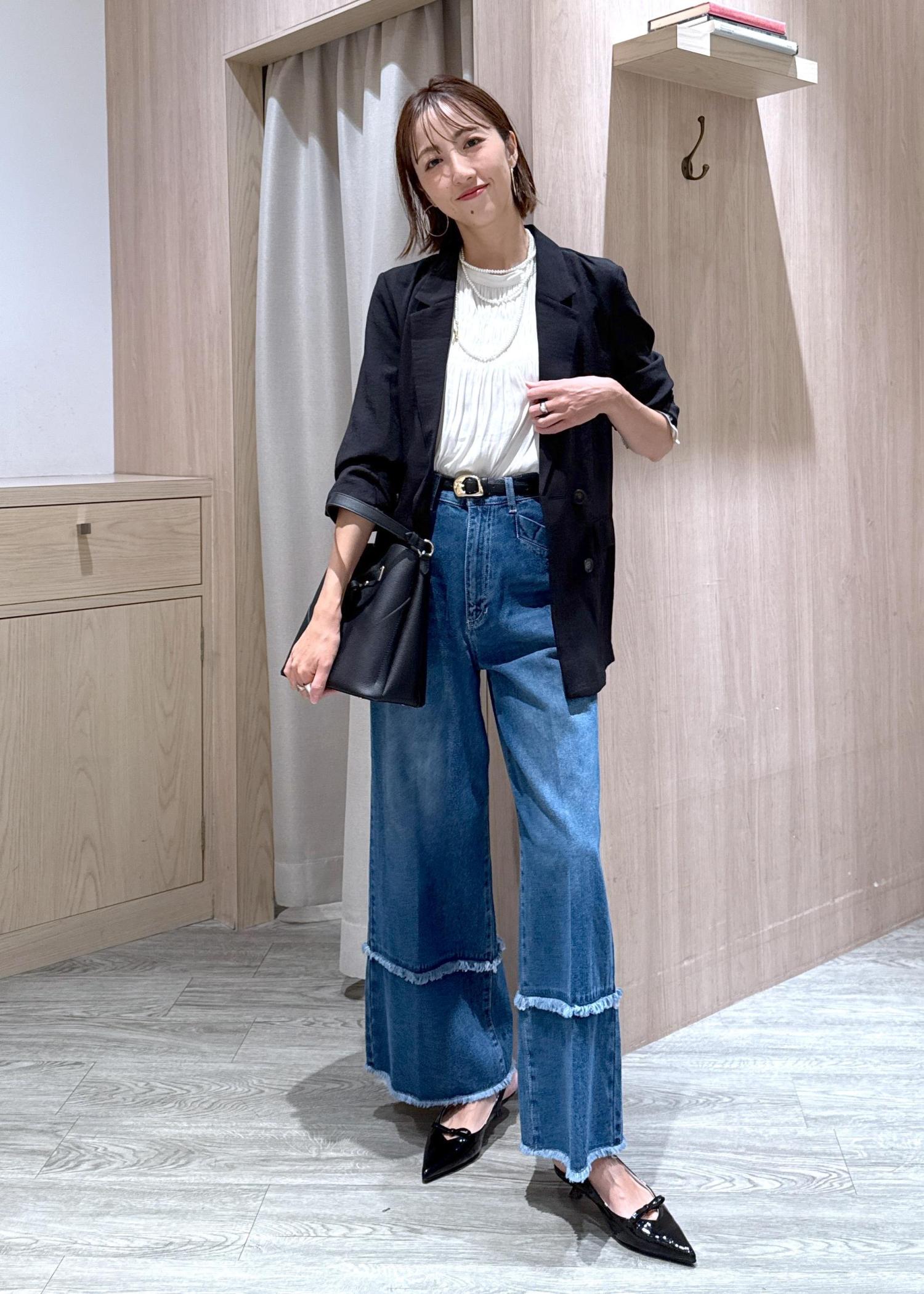 フレアデニムに女性らしいブラウス、blackのジャケットを合わせた秋のキレイめカジュアルスタイルです!