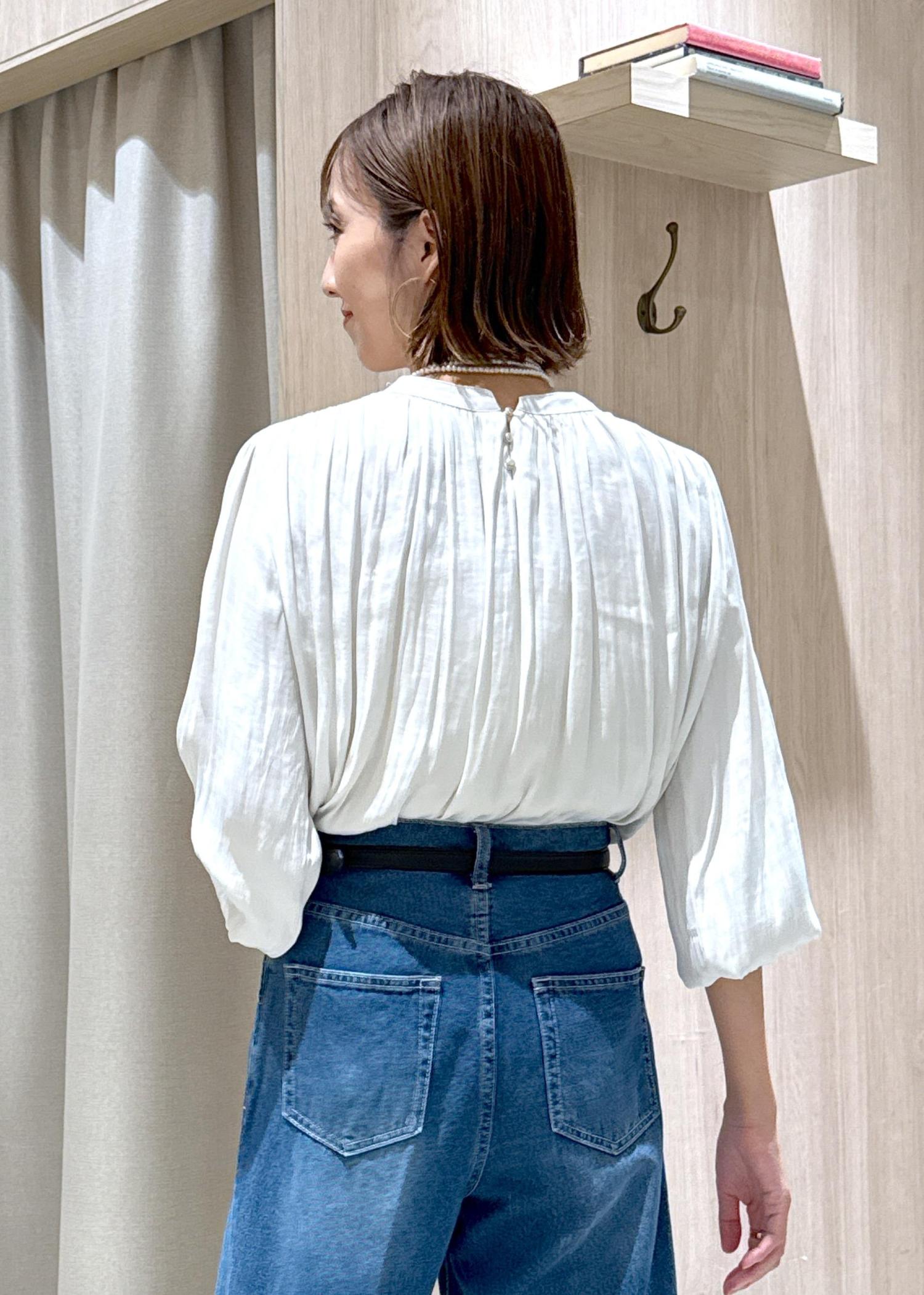 袖口がシャーリングになっていて手首で止まってくれるので、オフィスでも使いやすいです◎ -