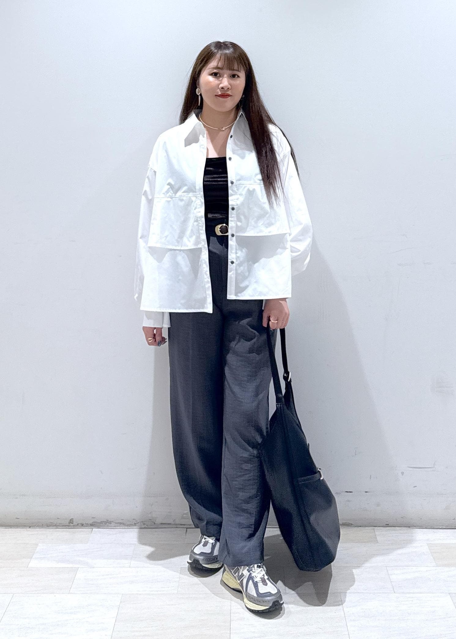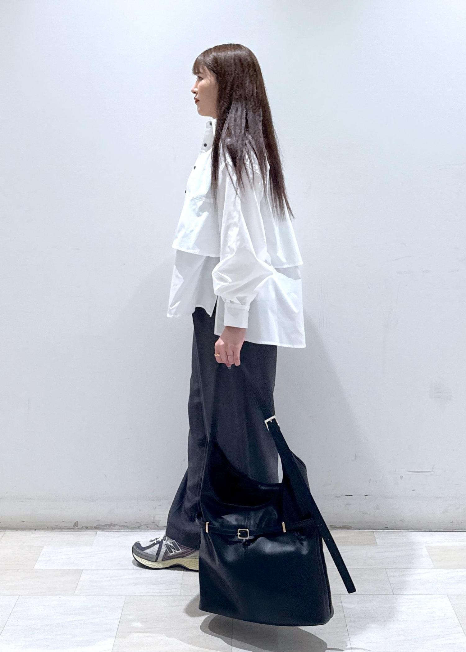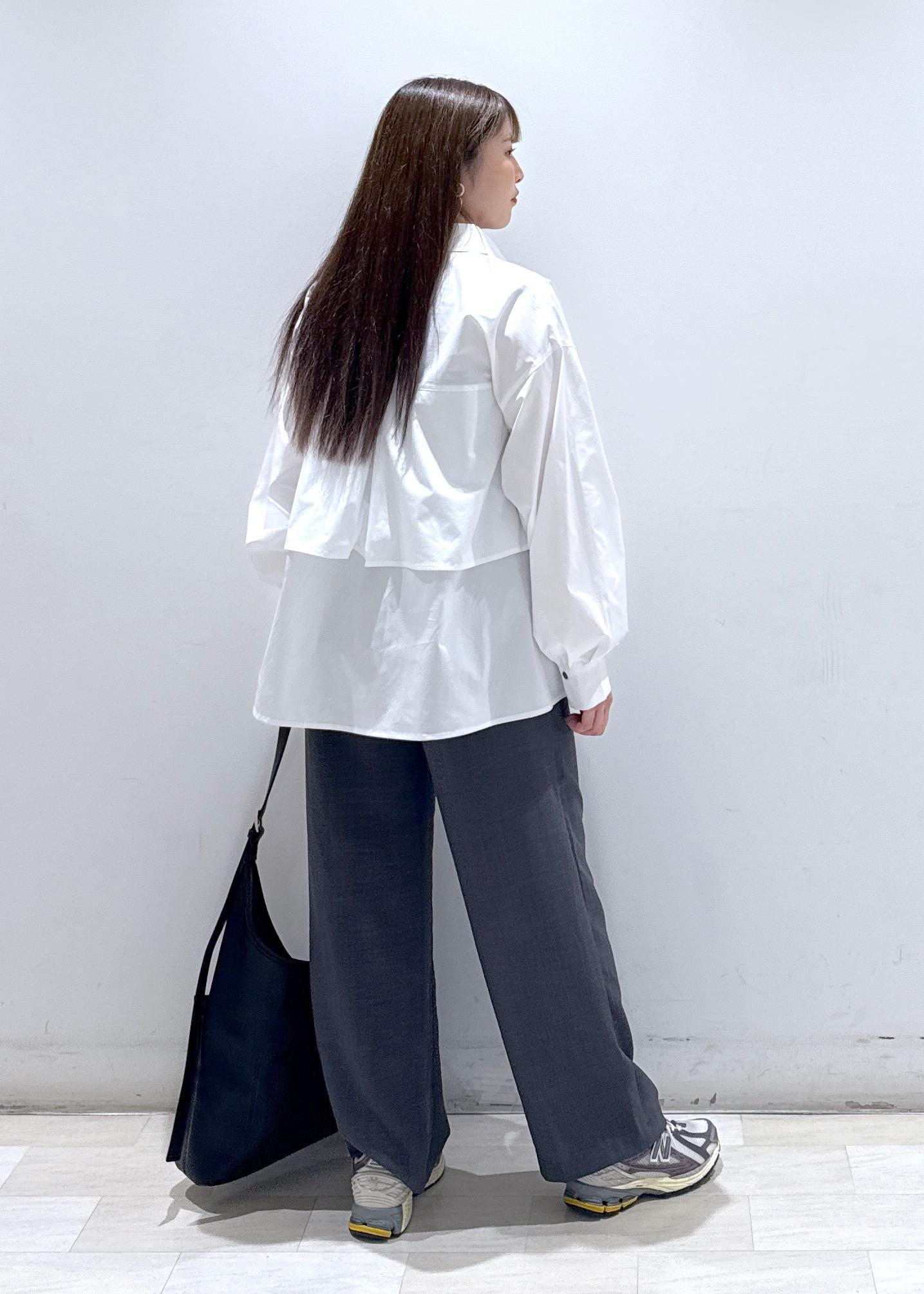 今回はティアードデザインのオーバーサイズのシャツに、グレーの美easyシリーズのワイドパンツと合わせてカジュアルなスタイリングにしてみました。