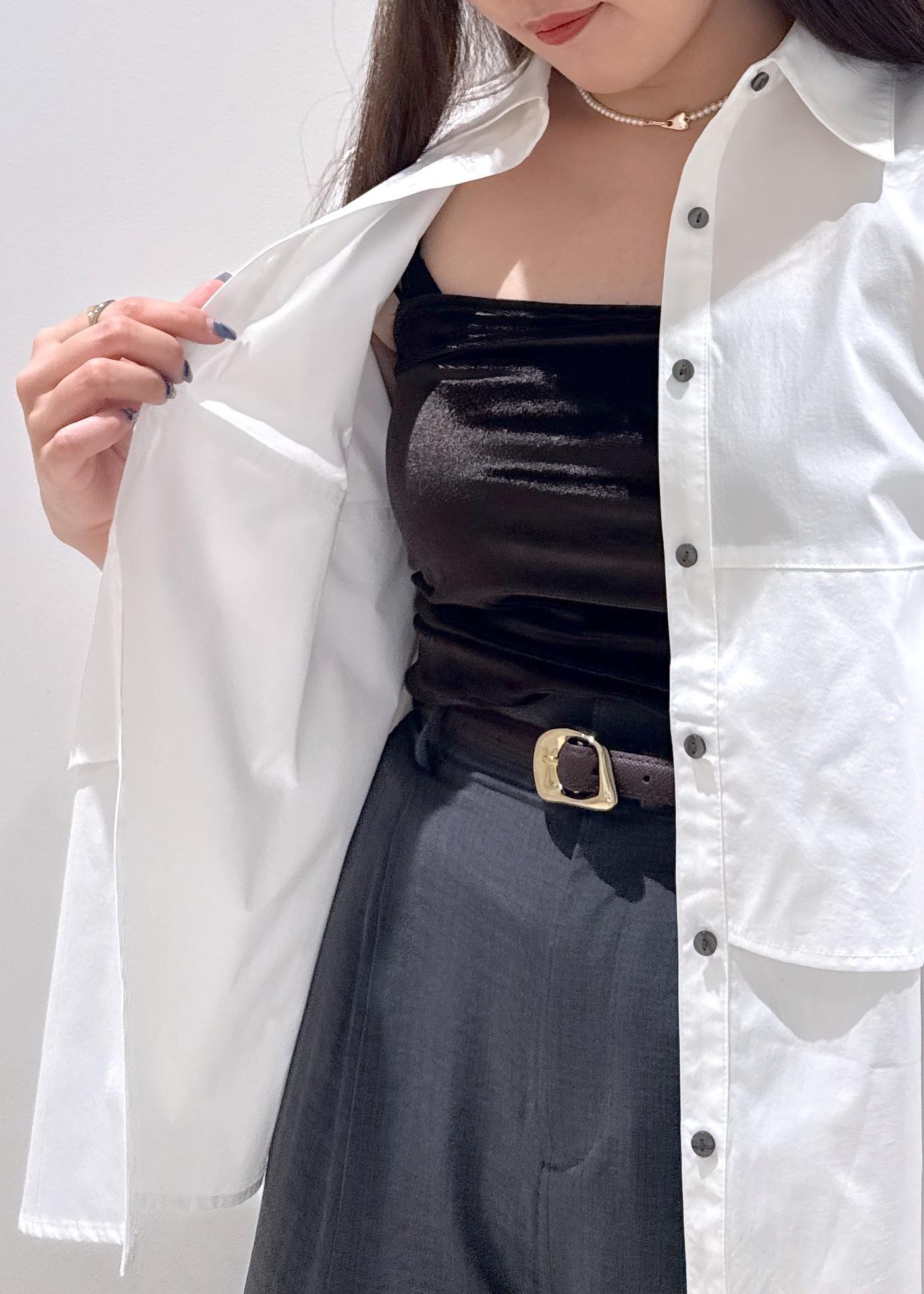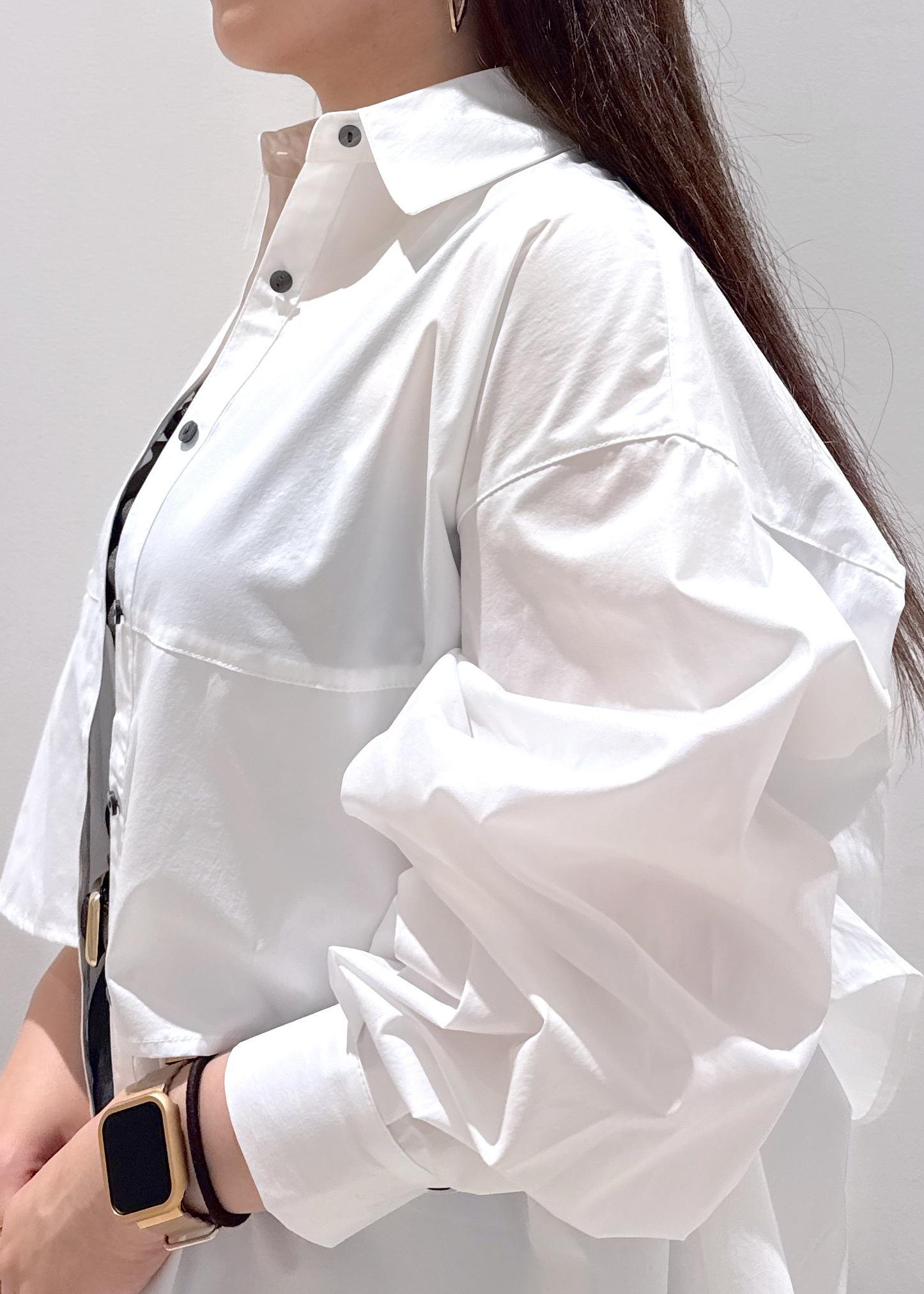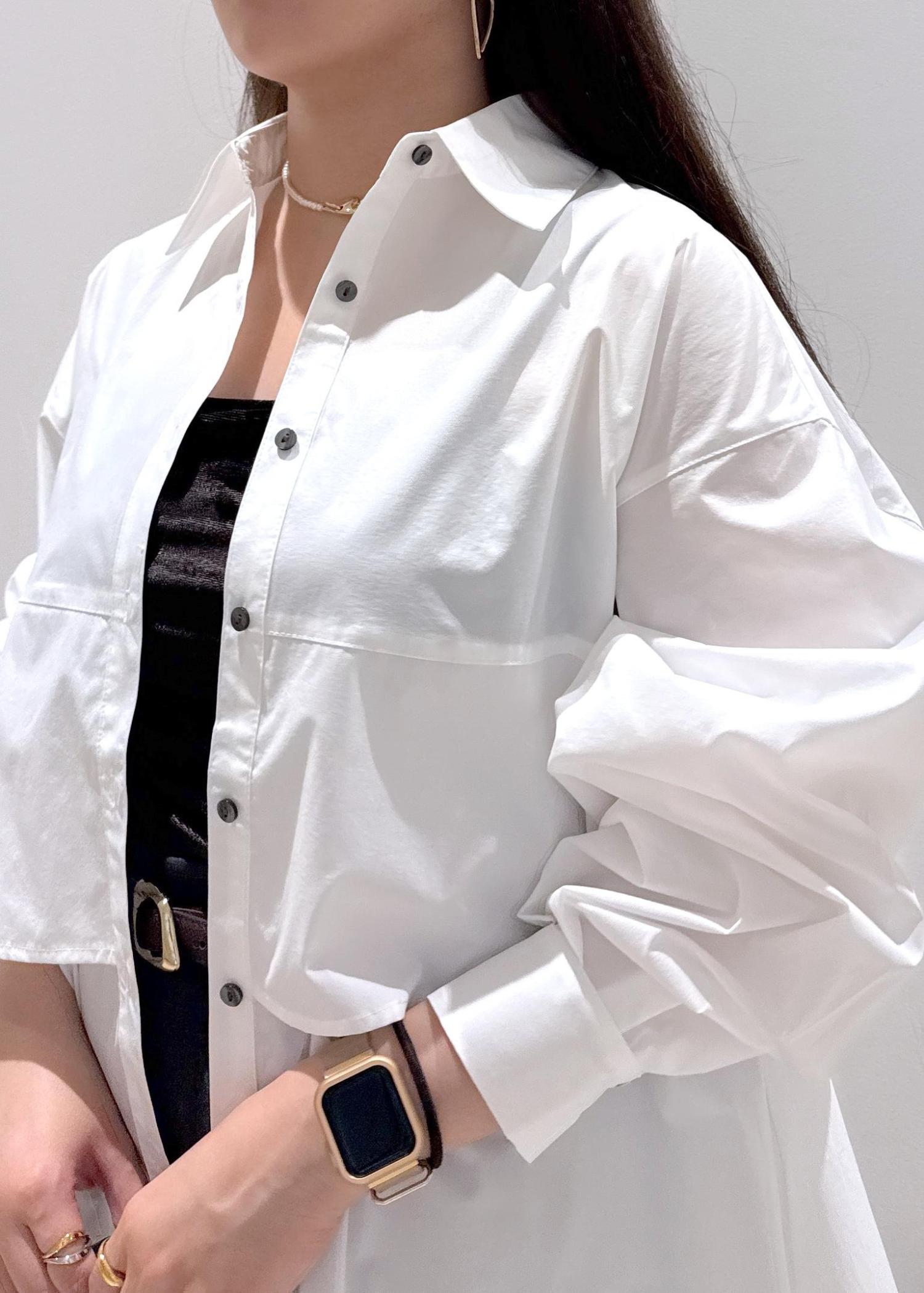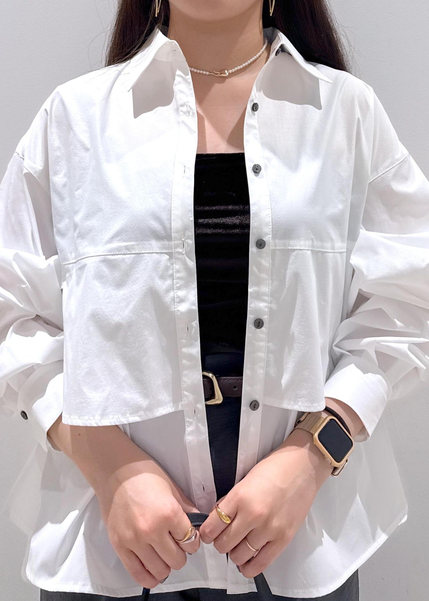 ベーシックなホワイトのシャツではありますが、前後にティアードのデザインがあるのでおしゃれに着こなすことができます。