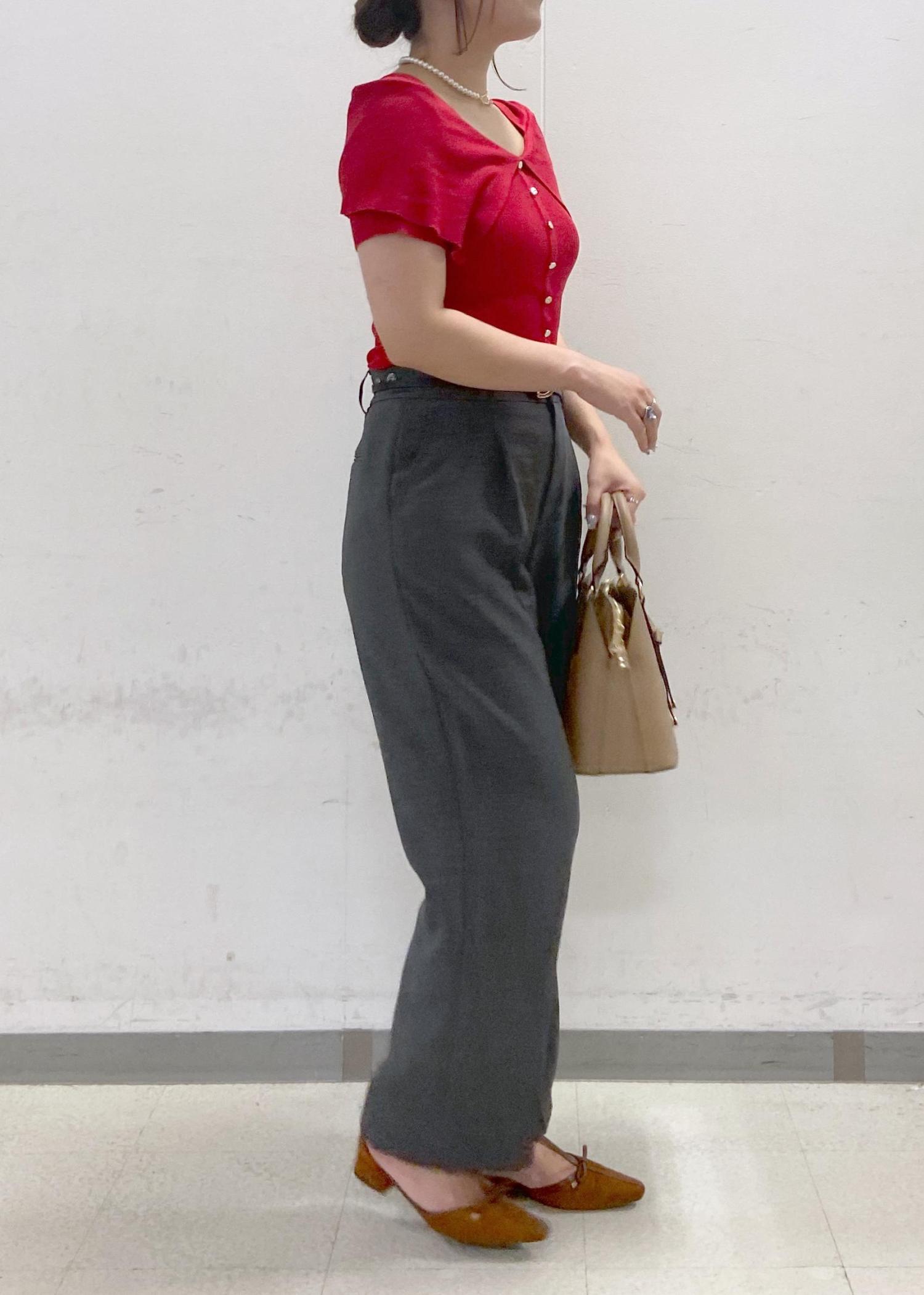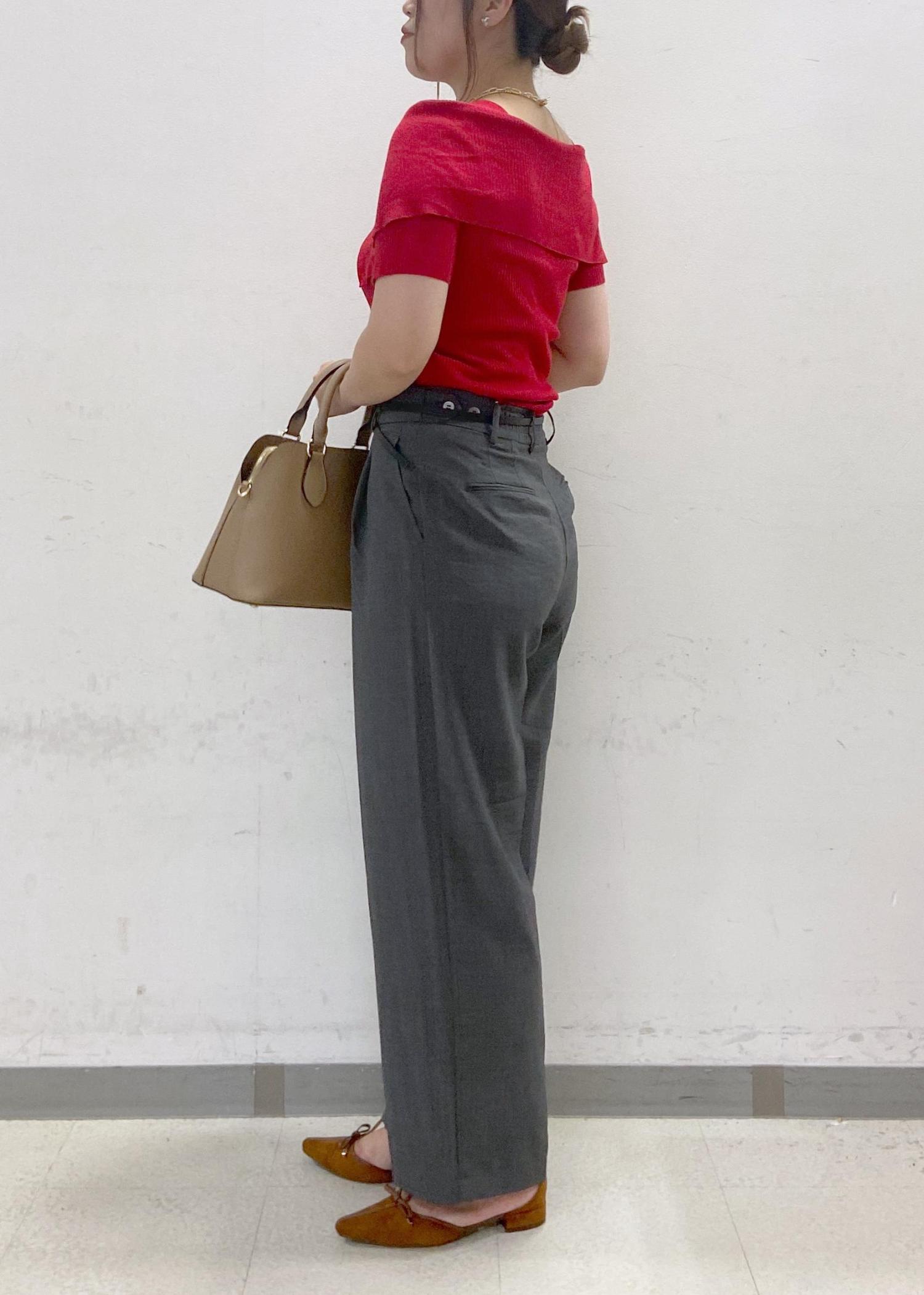 骨格ストレートなので、ピッタリすぎるシルエットは苦手なのですが首元の開きと大きめな襟元で、上半身がスッキリ見えやすいです。 -
