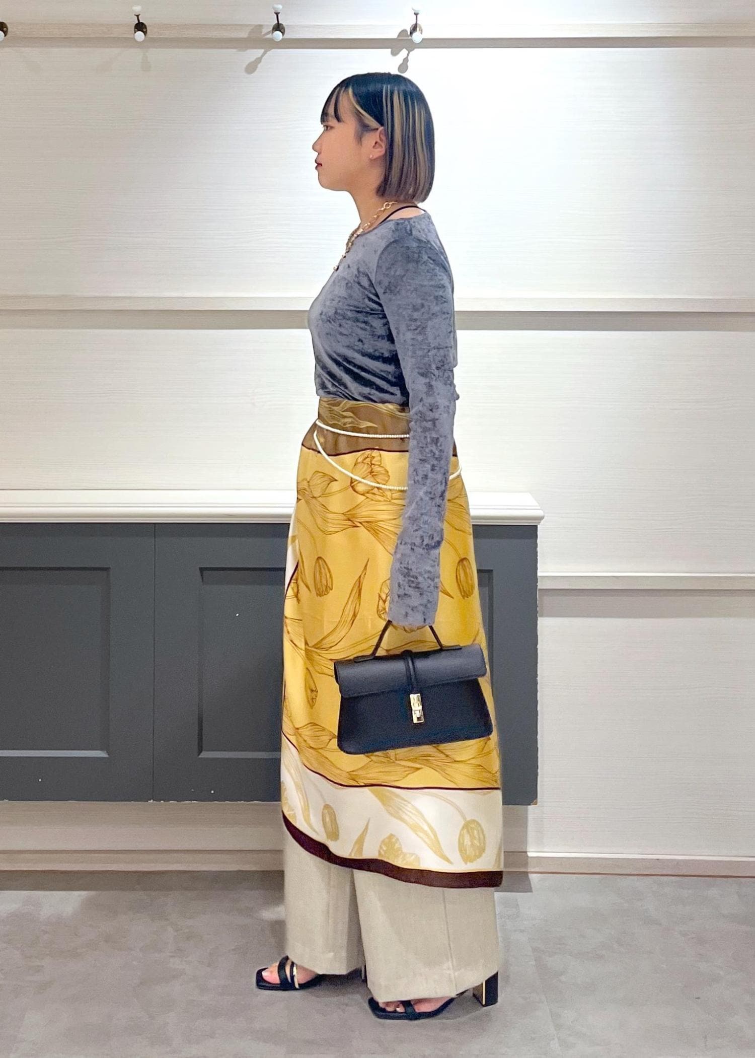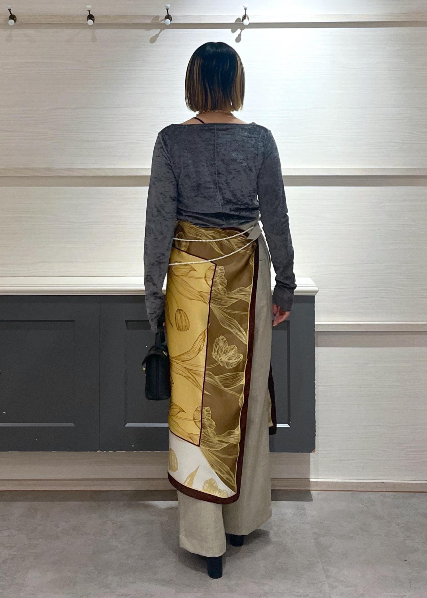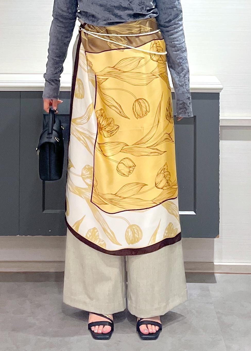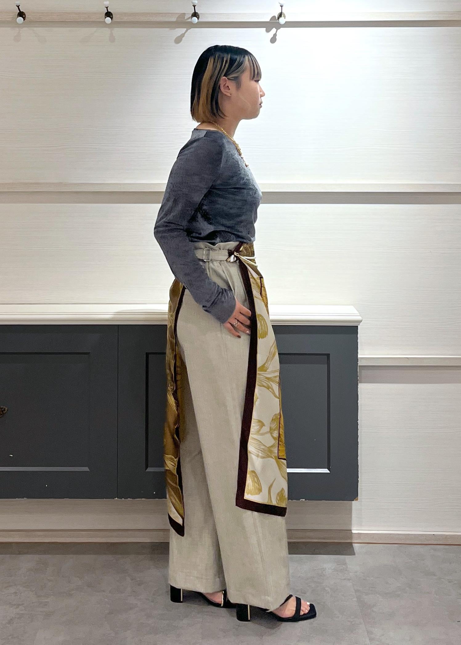 ベージュのワイドパンツを合わせ、スカーフを巻くことでシンプルすぎないオシャレなコーディネートになります☆