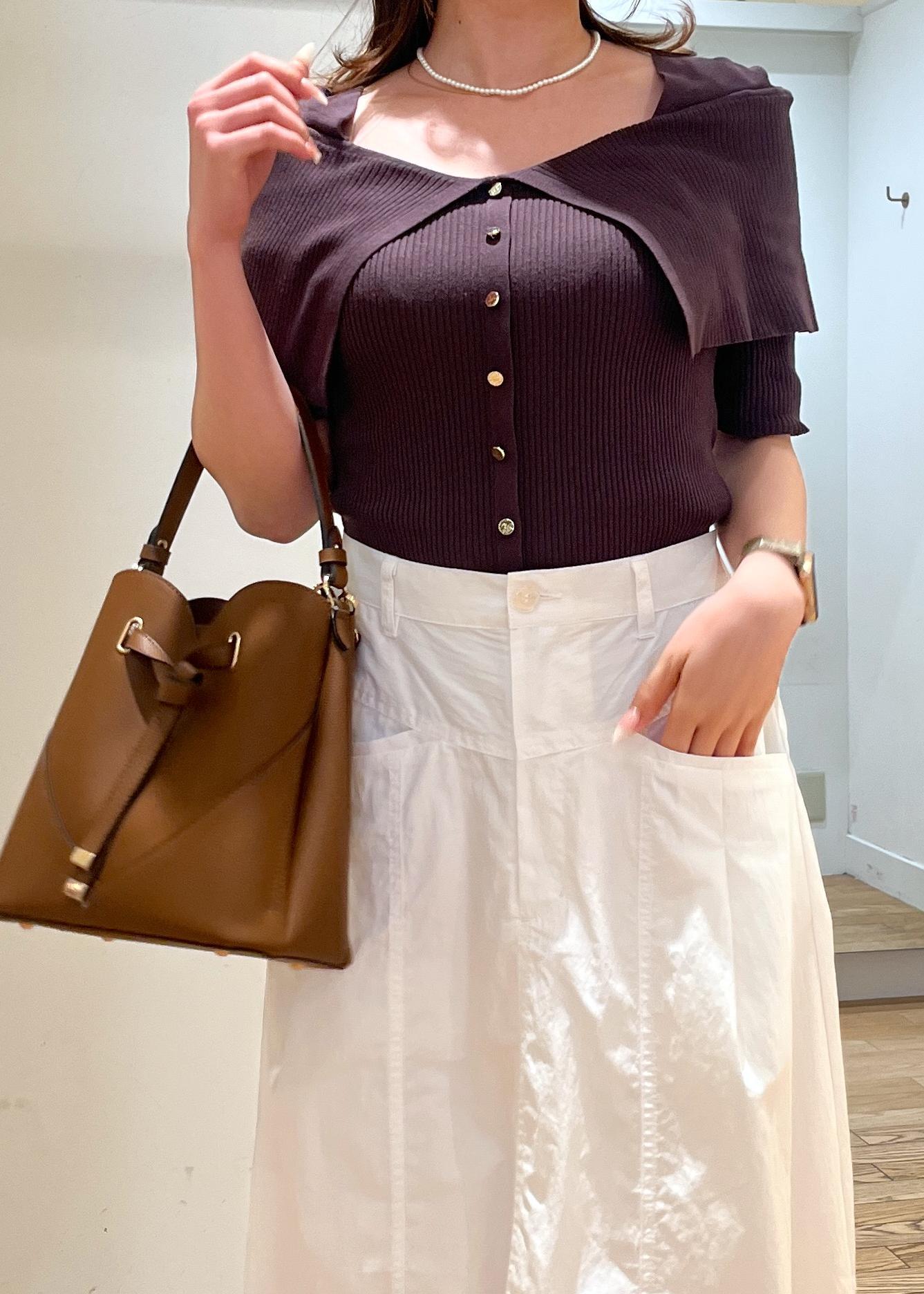 ブラウン×ホワイトの色合わせと、オフショル風ニットの程よい肌見せで大人カジュアルに。