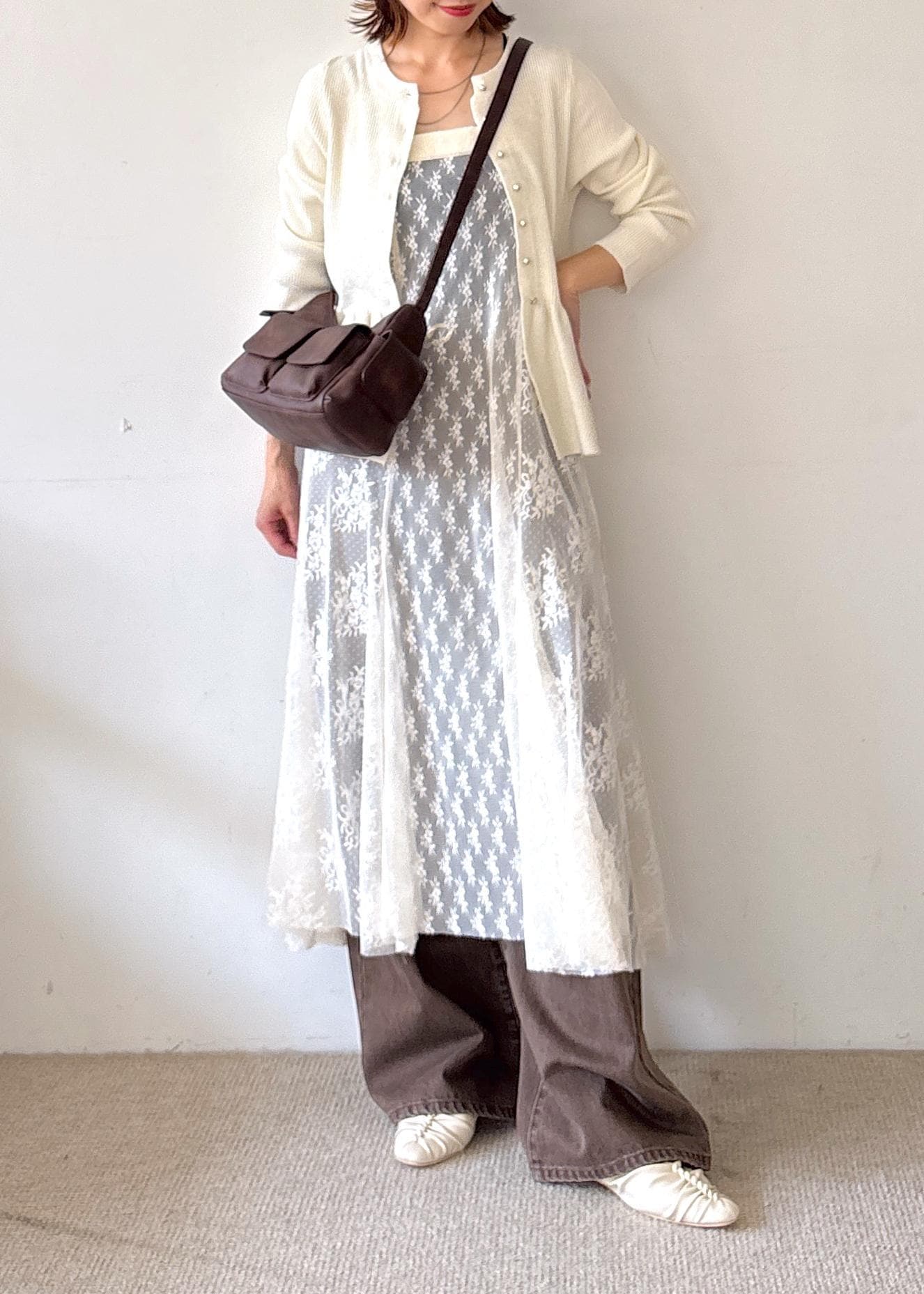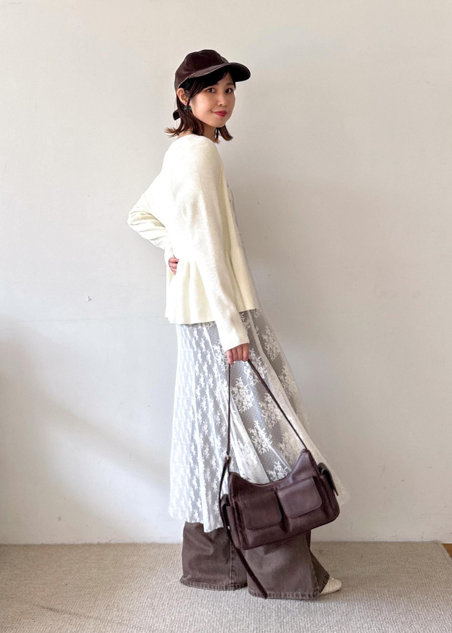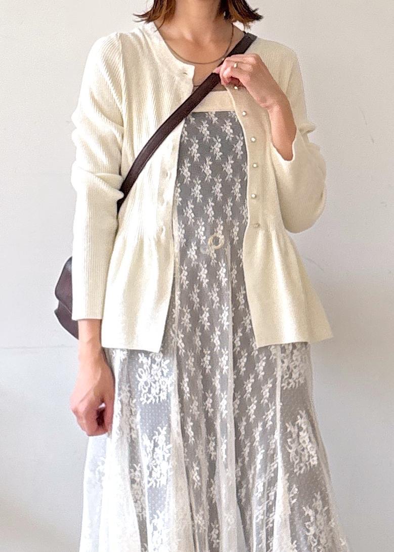 ふわっと柔らかなペプラムカーディガンとレースのスカートをワンピース風に、デニムとレイヤードした秋のカジュアルスタイル♪まだ汗ばむ季節だけど、カラーや小物で秋要素を入れると季節の変わり目に印象が変えられてオススメです。秋に向けてお出かけにぴったりな大人カジュアルコーデ。