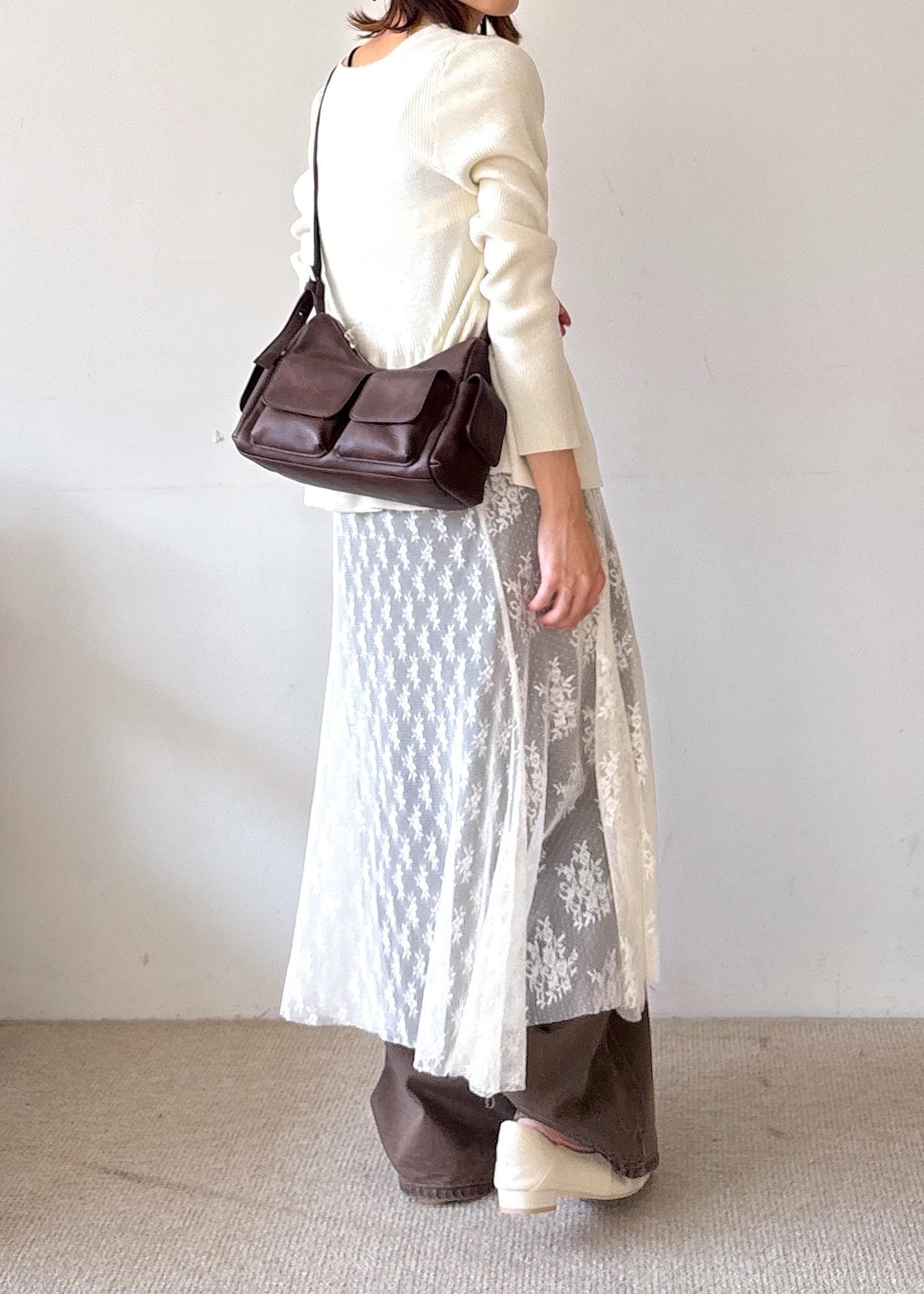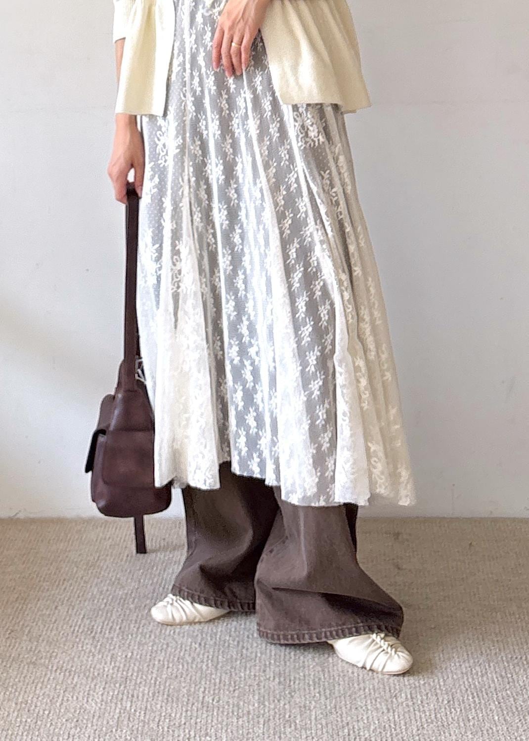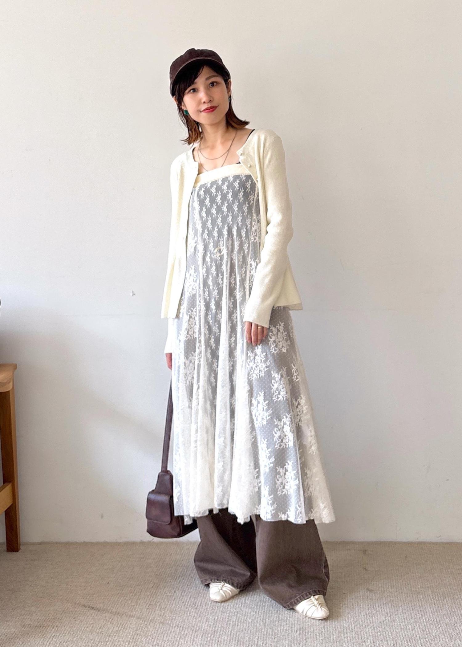 ふわっと柔らかなペプラムカーディガンとレースのスカートをワンピース風に、デニムとレイヤードした秋のカジュアルスタイル♪まだ汗ばむ季節だけど、カラーや小物で秋要素を入れると季節の変わり目に印象が変えられてオススメです。秋に向けてお出かけにぴったりな大人カジュアルコーデ。