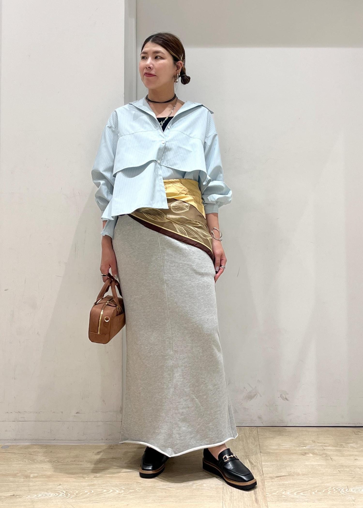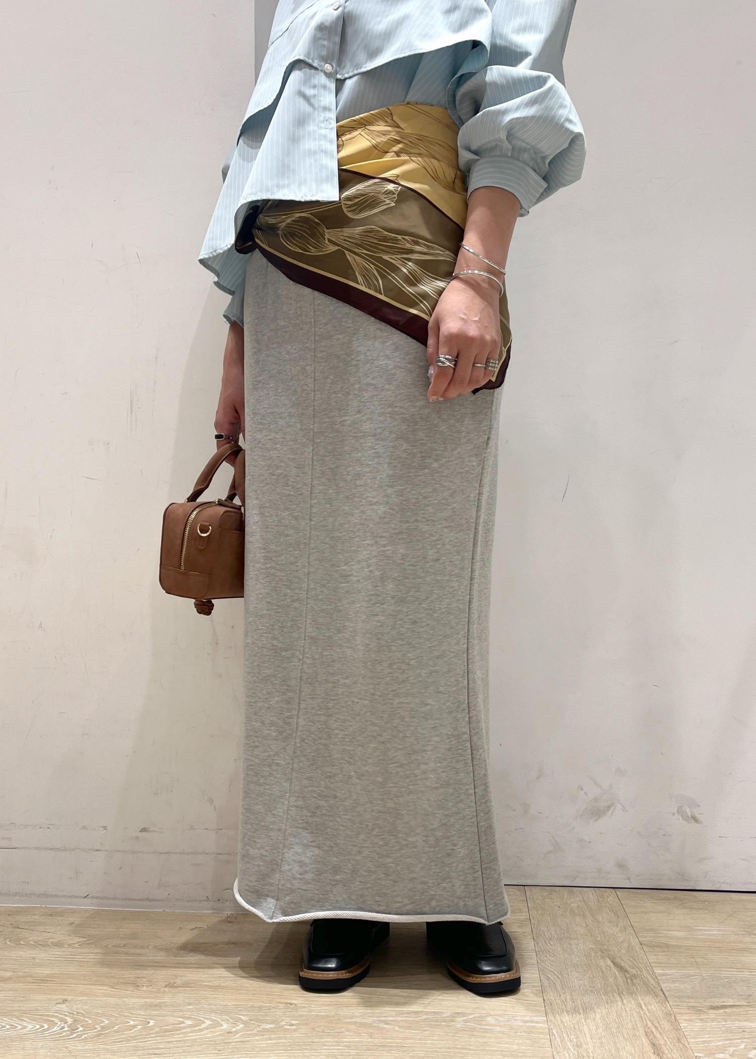 裏毛スカート合わせでラフ感もありつつカジュアルすぎないのもポイントです◎スカーフをアクセントに巻くとおしゃれ感がグッと出ますよ!
