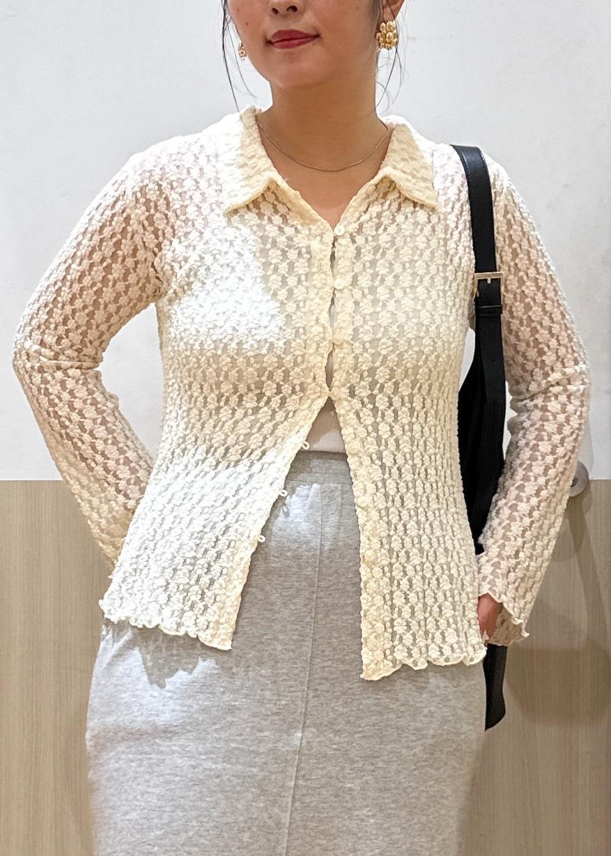 VISレースポロ襟カーディガンキナリ / F¥3,842レビュー157センチ、骨格ウェーブ、ヒップが半分以上隠れる着丈です。