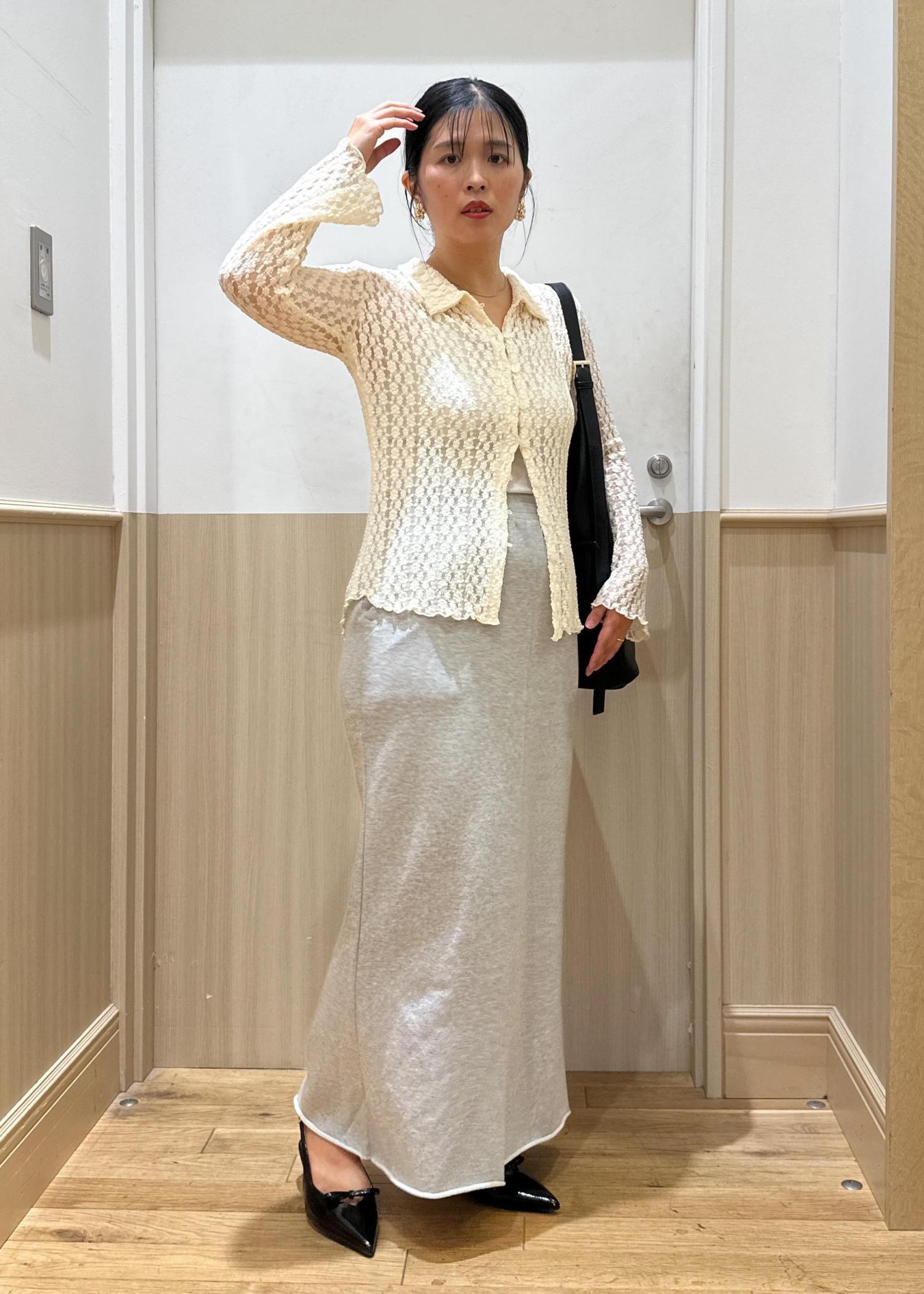 カーデはボタンを開けることで、ハイウェストに見せてスタイルアップ。