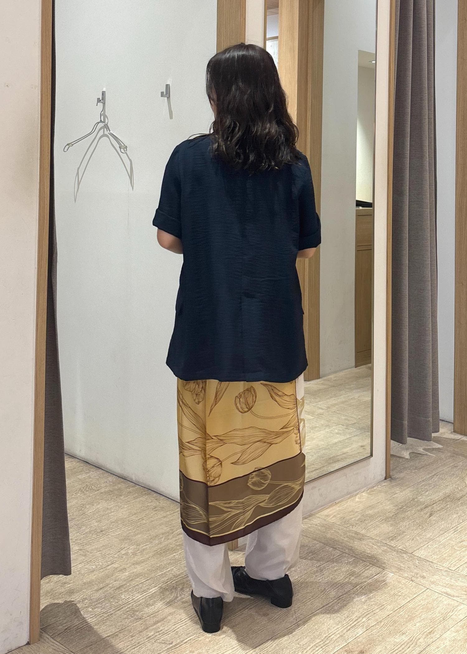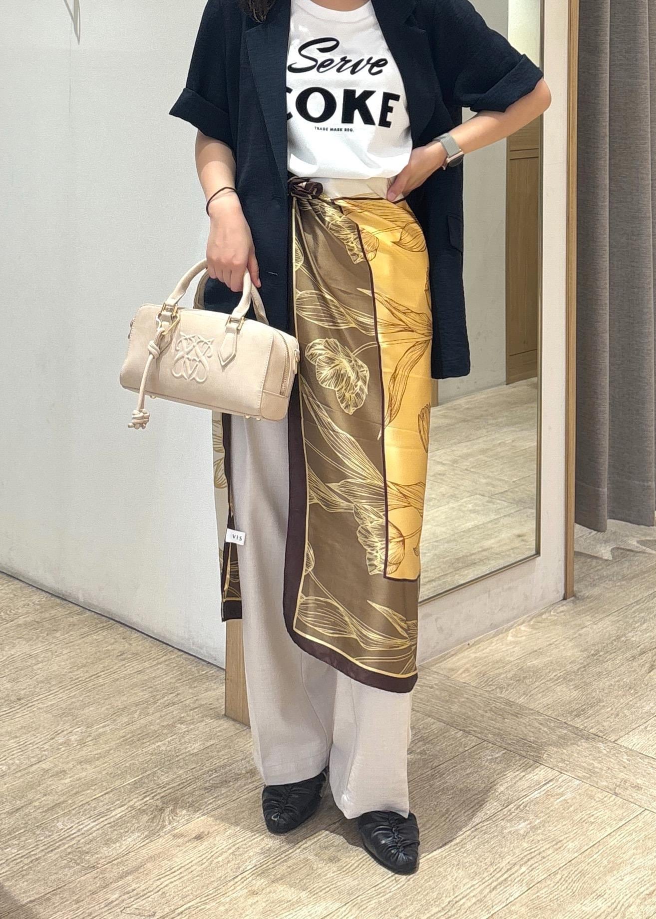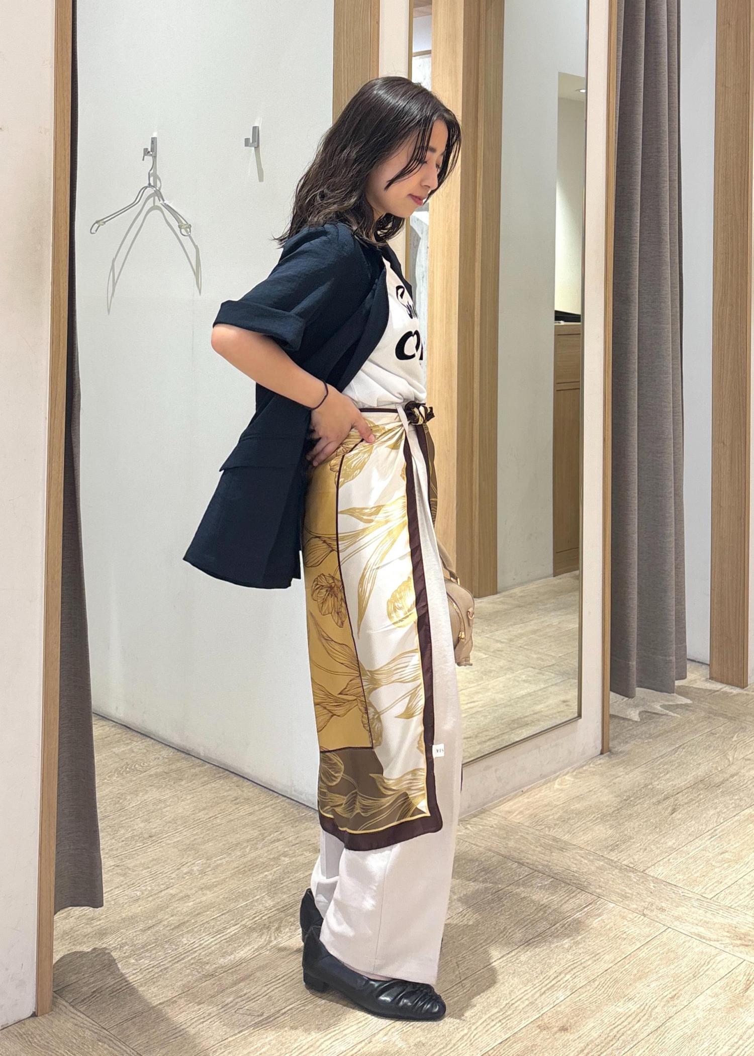 長めのスカーフを腰に巻くことで脚が長く見えて、低身長もスタイルアップ間違いなし◎