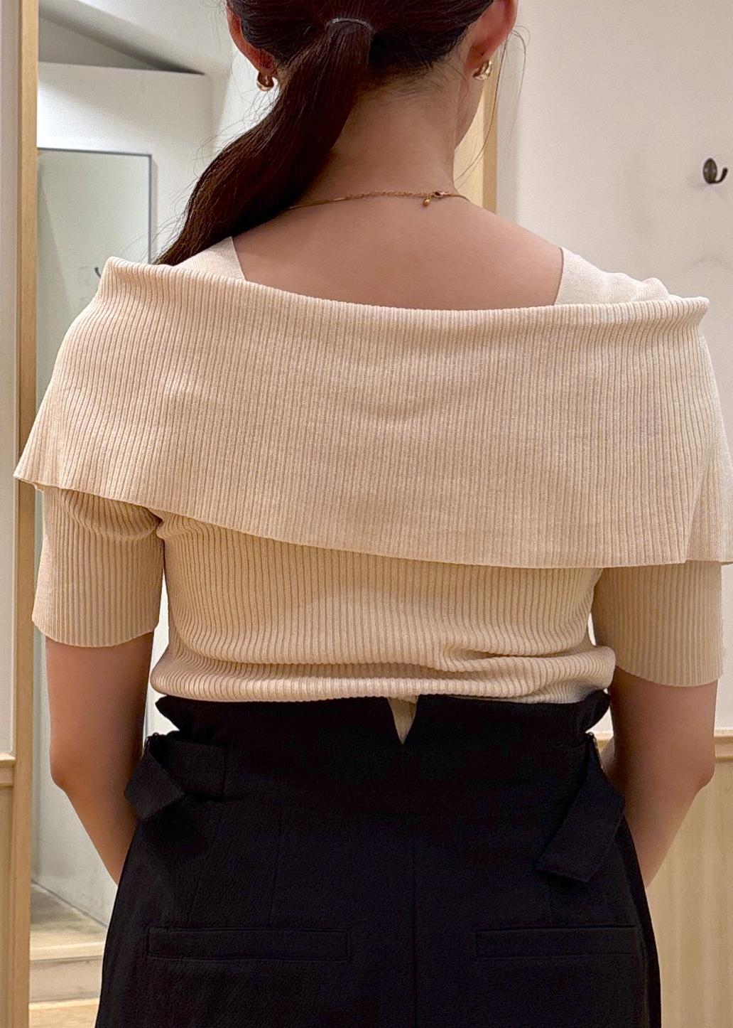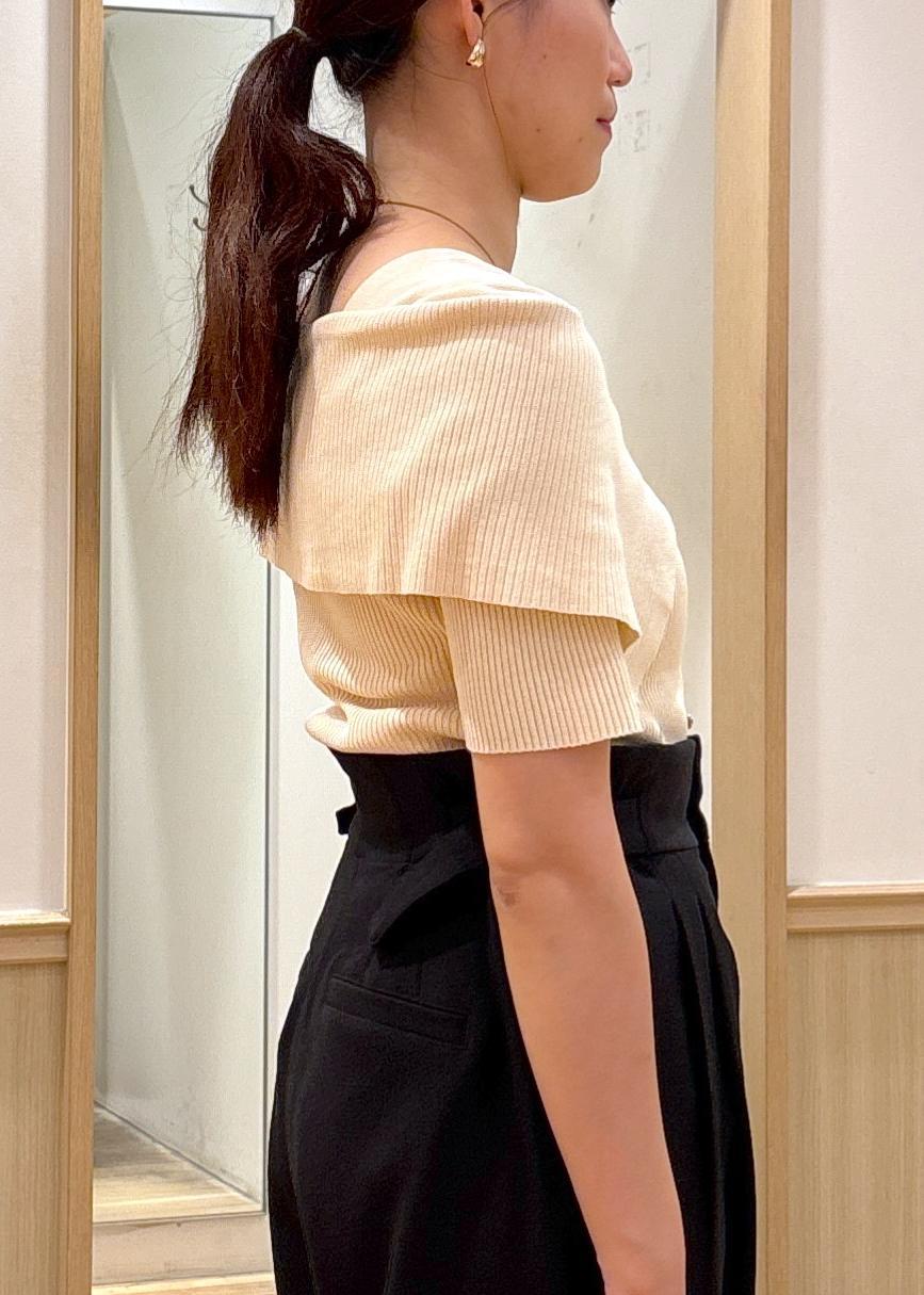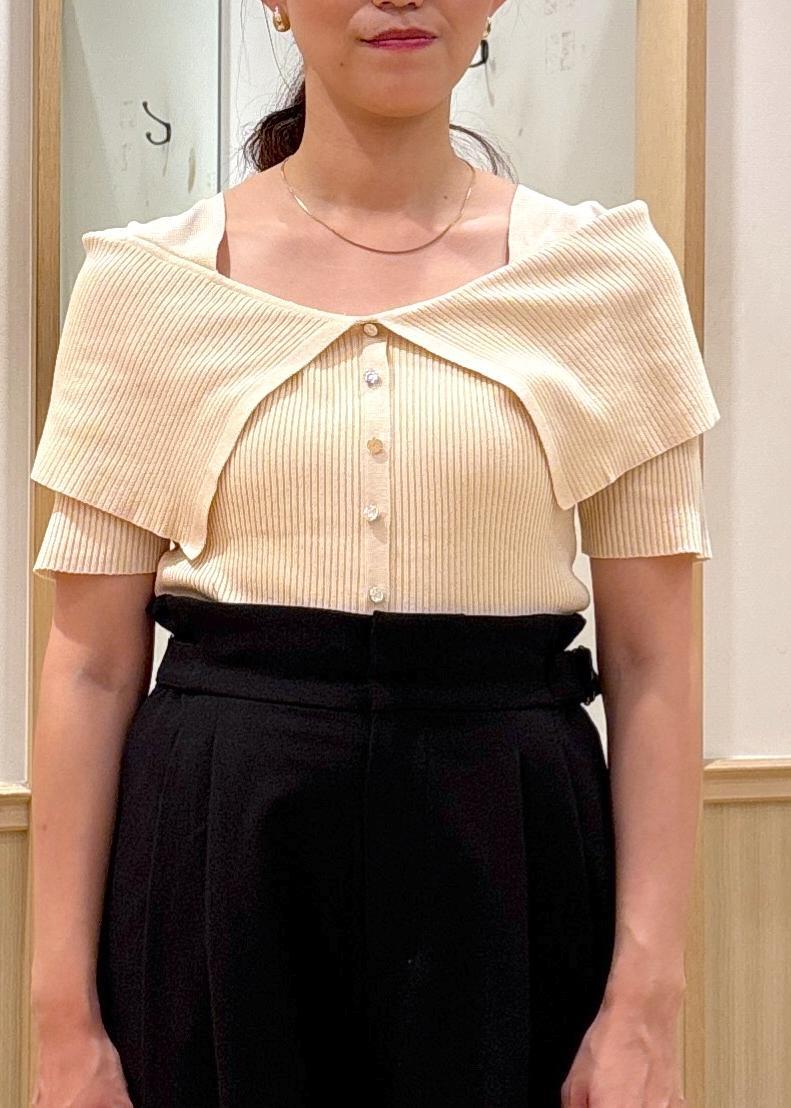 VISビックカラーオフショルハーフスリーブニットベージュ / F¥2,963レビューデコルテが綺麗に見えるトップスです。襟が大きめなのもポイントになっていて、アクセサリー感覚で着れます。