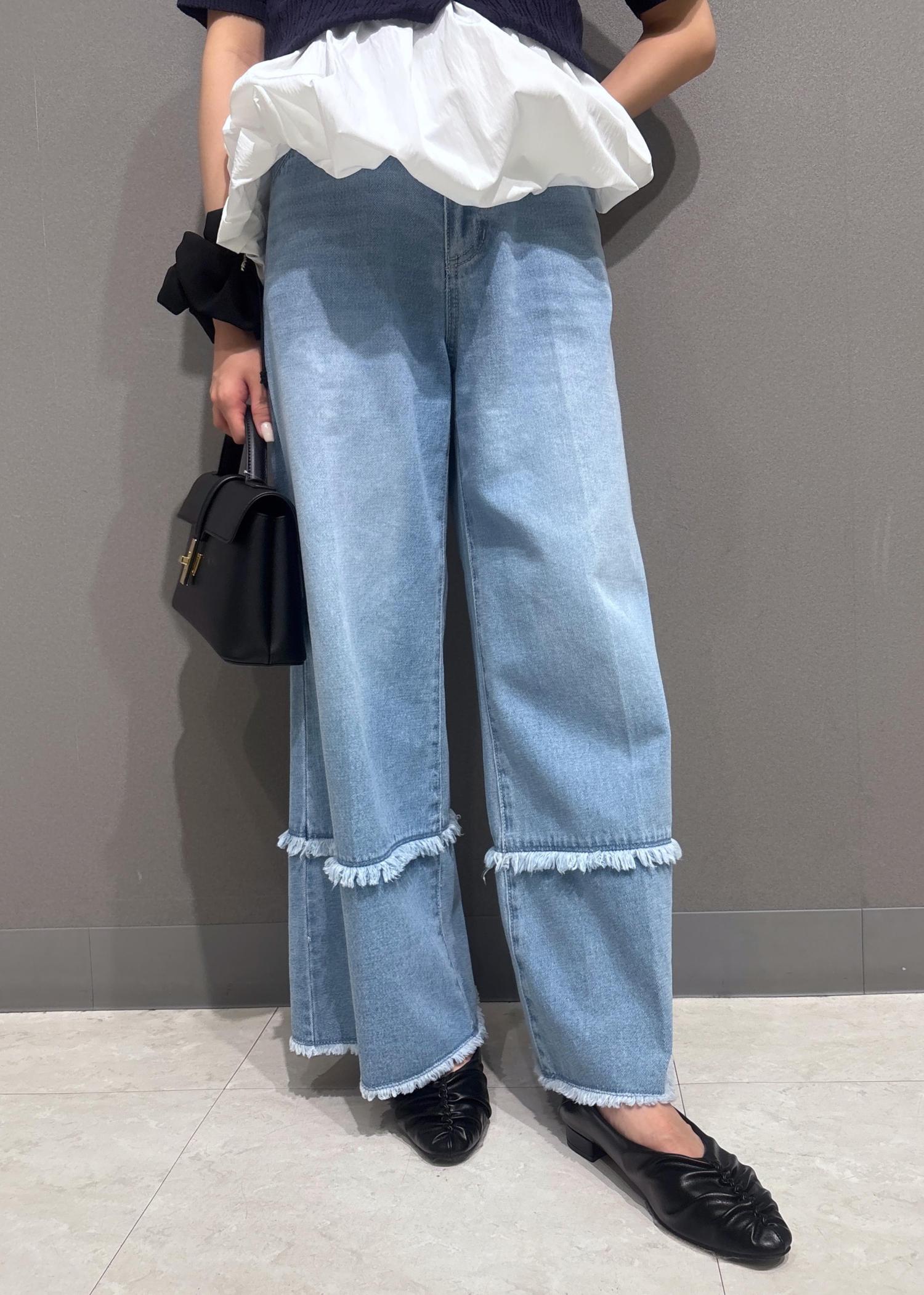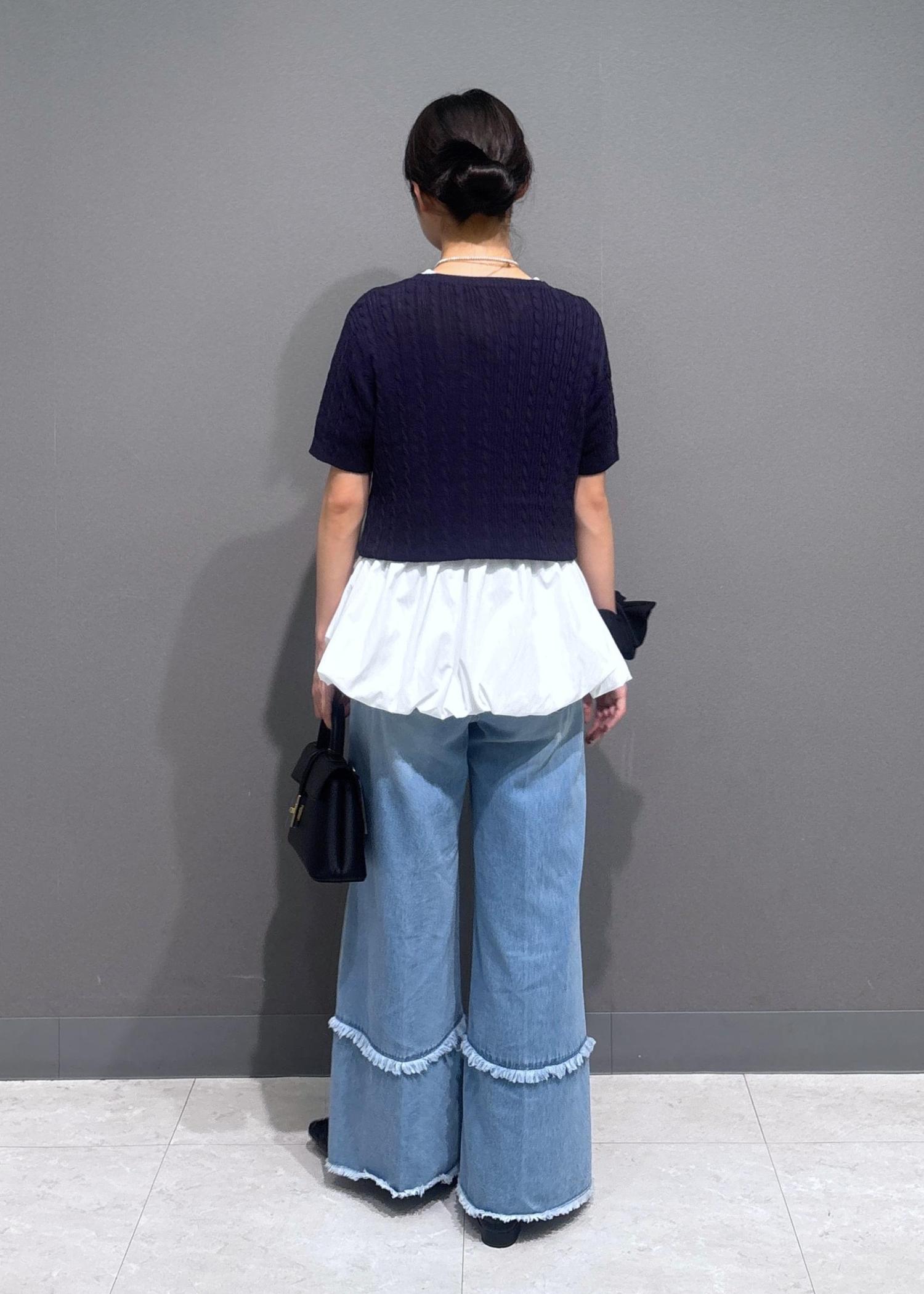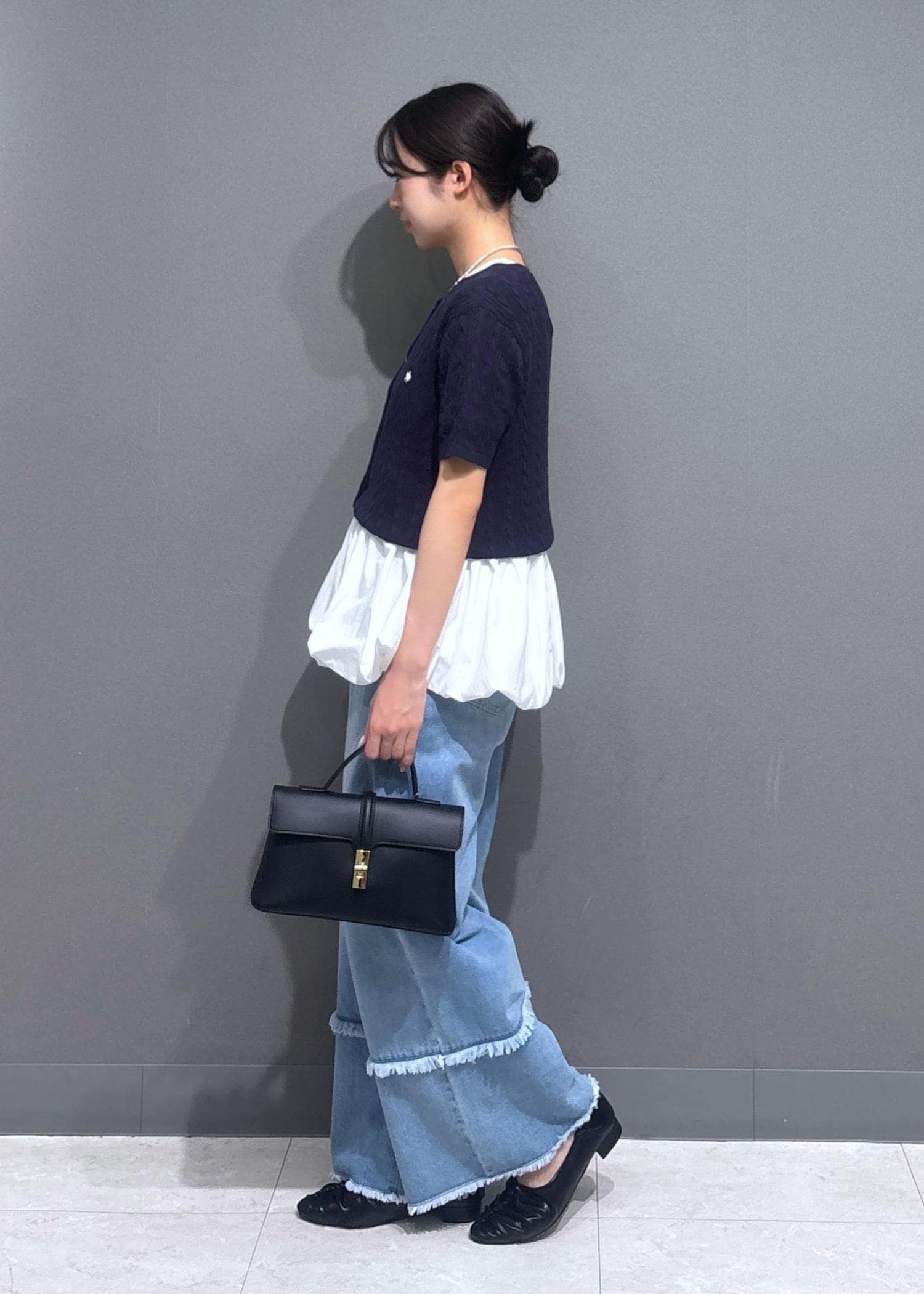 ネイビーのショート丈カーディガンに、ふんわり広がるトップスをレイヤード!トップスのボリューム感を、ワイドデニムのストレートシルエットでバランス良くまとめてみました(๑˃̵ᴗ˂̵)デニムの裾や切り替え部分のフリンジが、遊び心をプラスしてカジュアルダウンです!