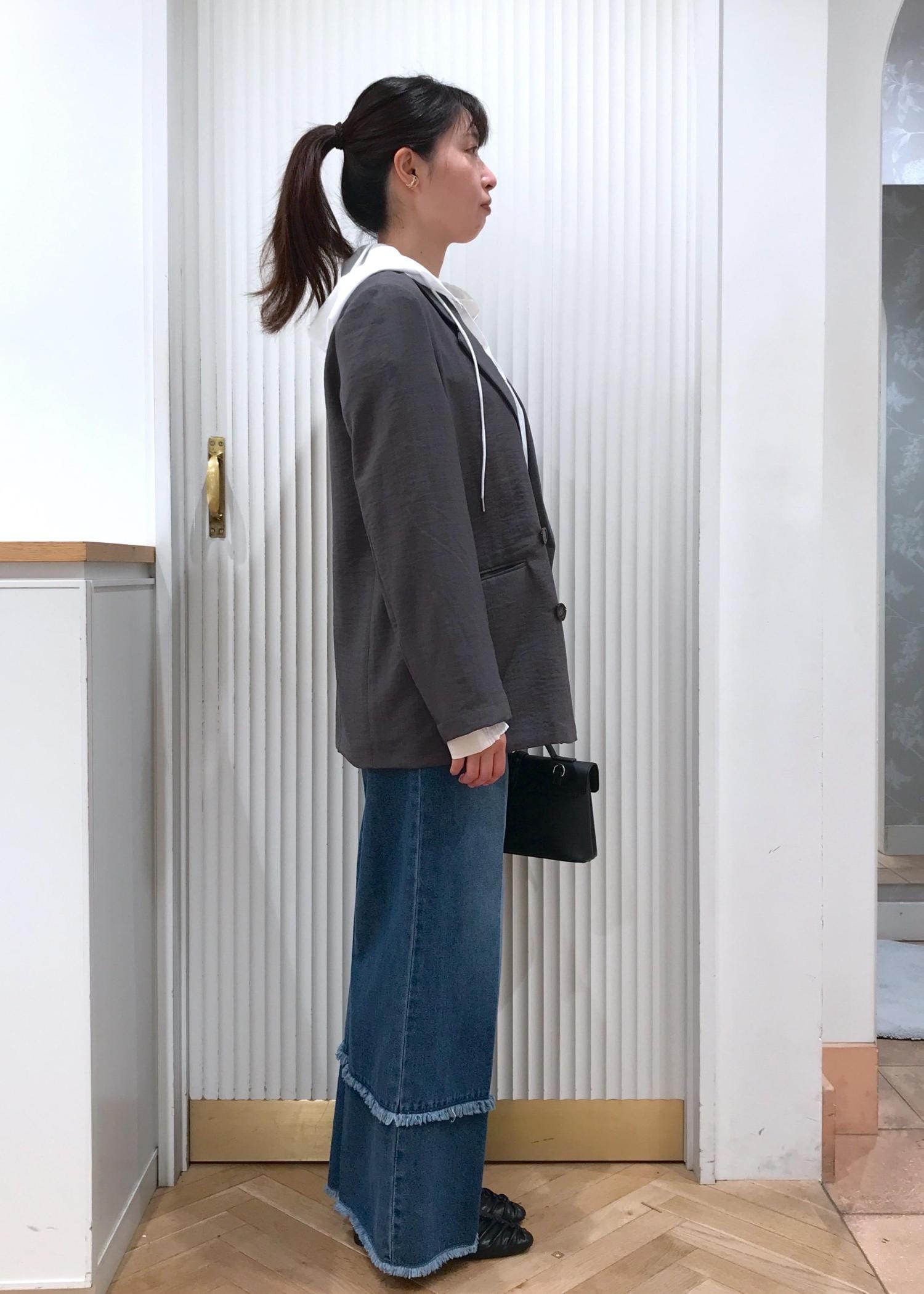 身幅はゆったりしていて、裏地は付いていないのでこれからの暖かい季節にも長く着られます。 -