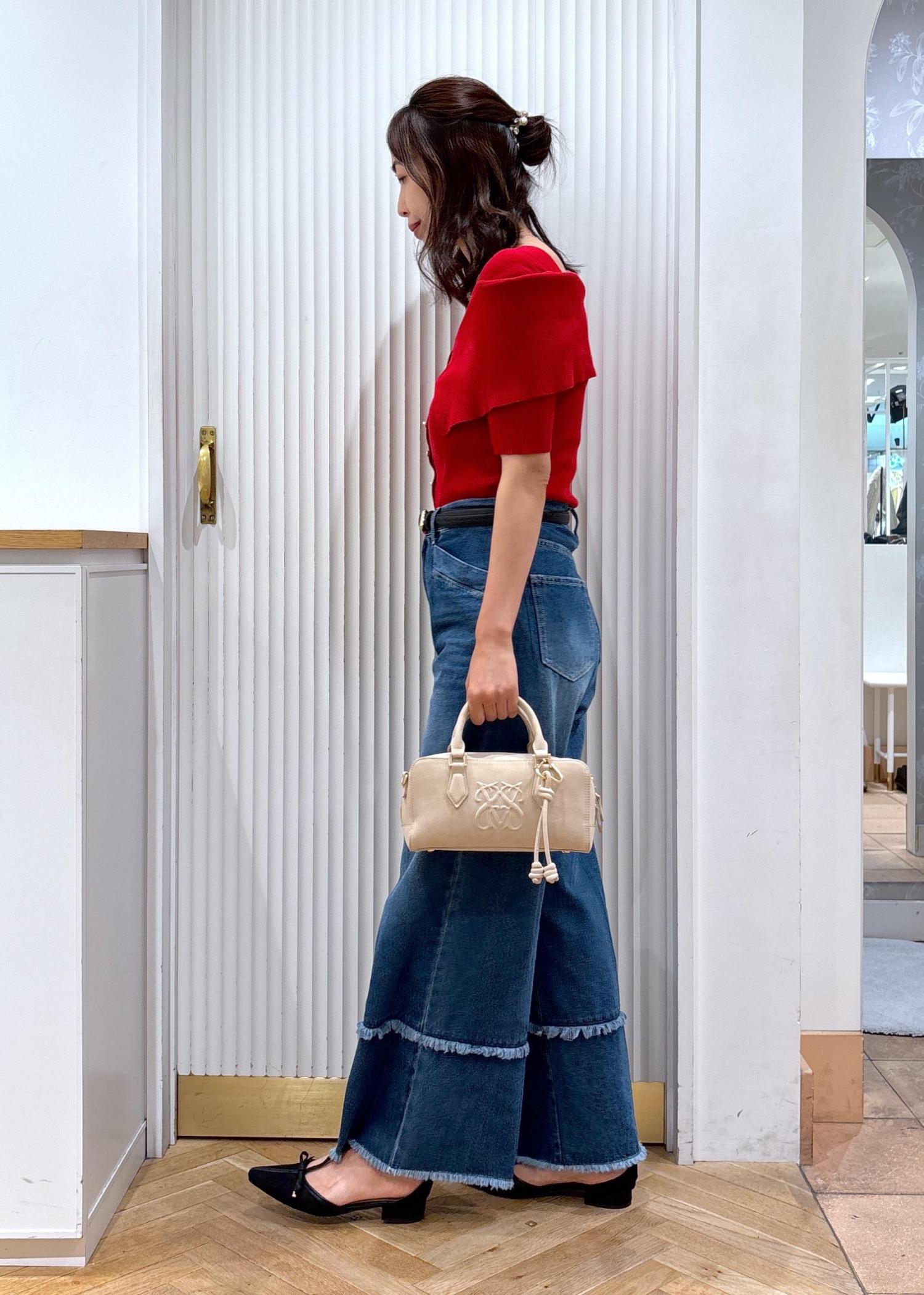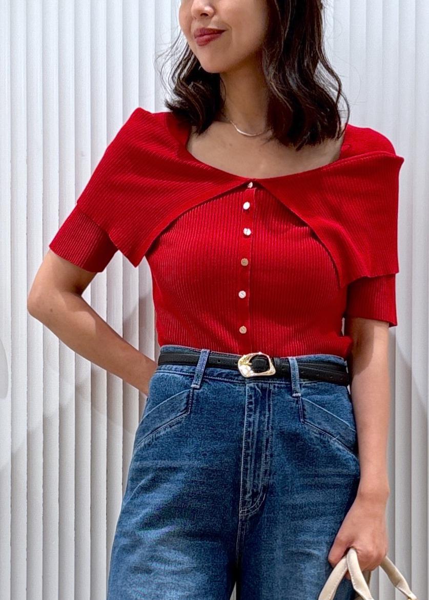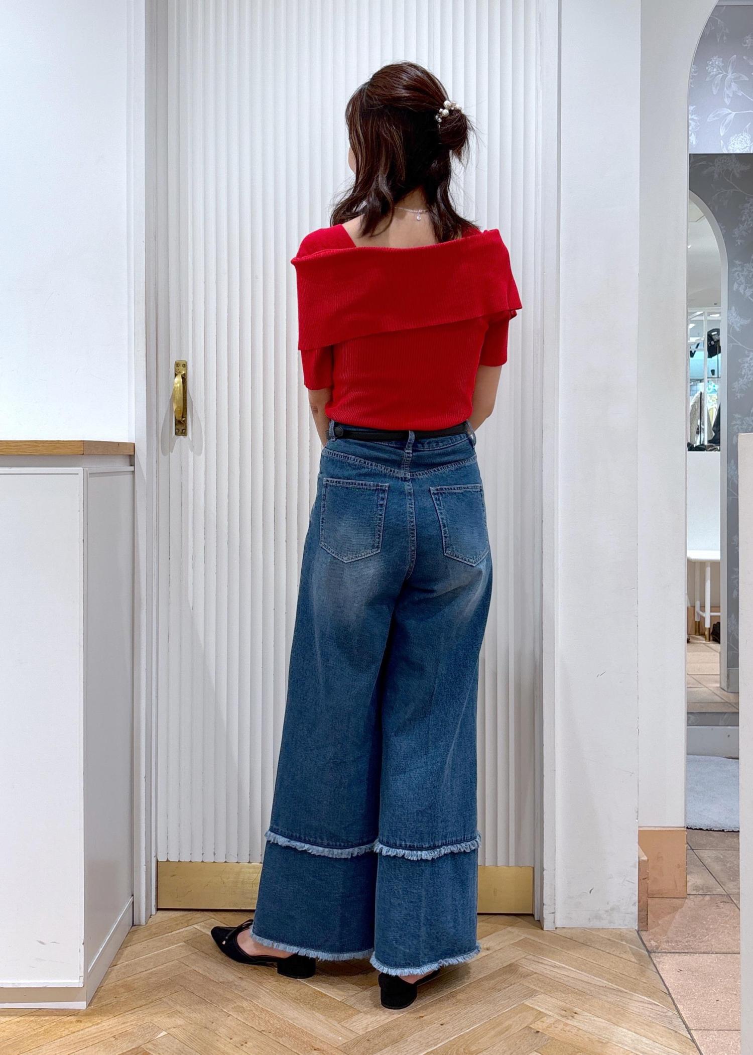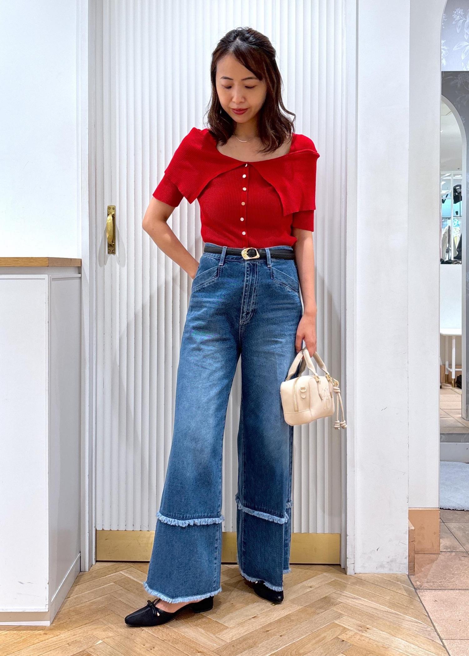 赤の色味が可愛いトップスにデニムを合わせたスタイリングです。