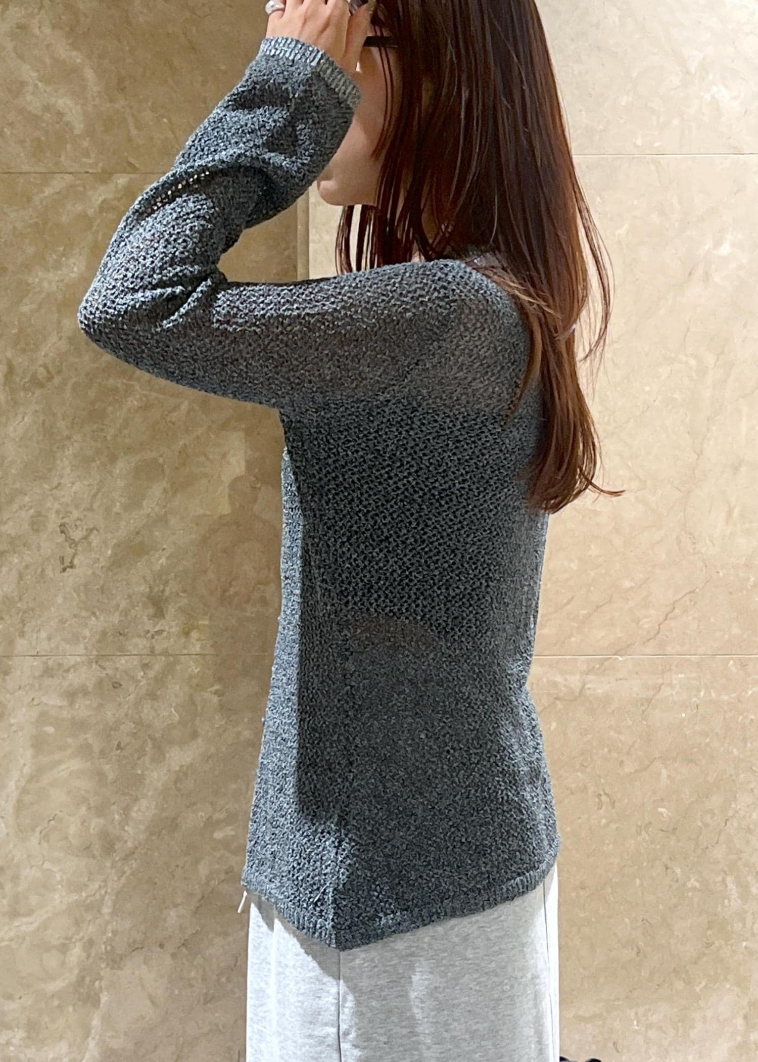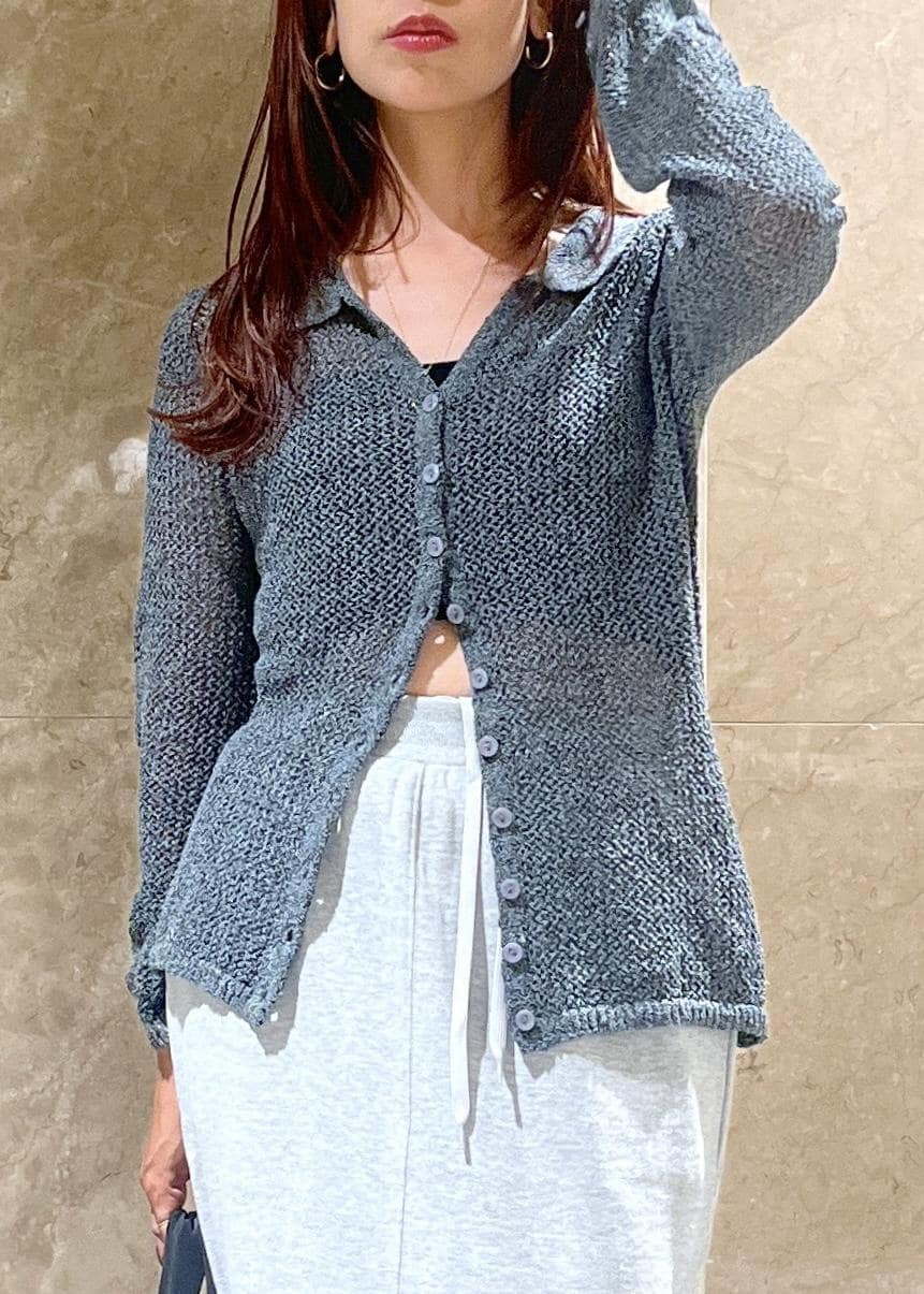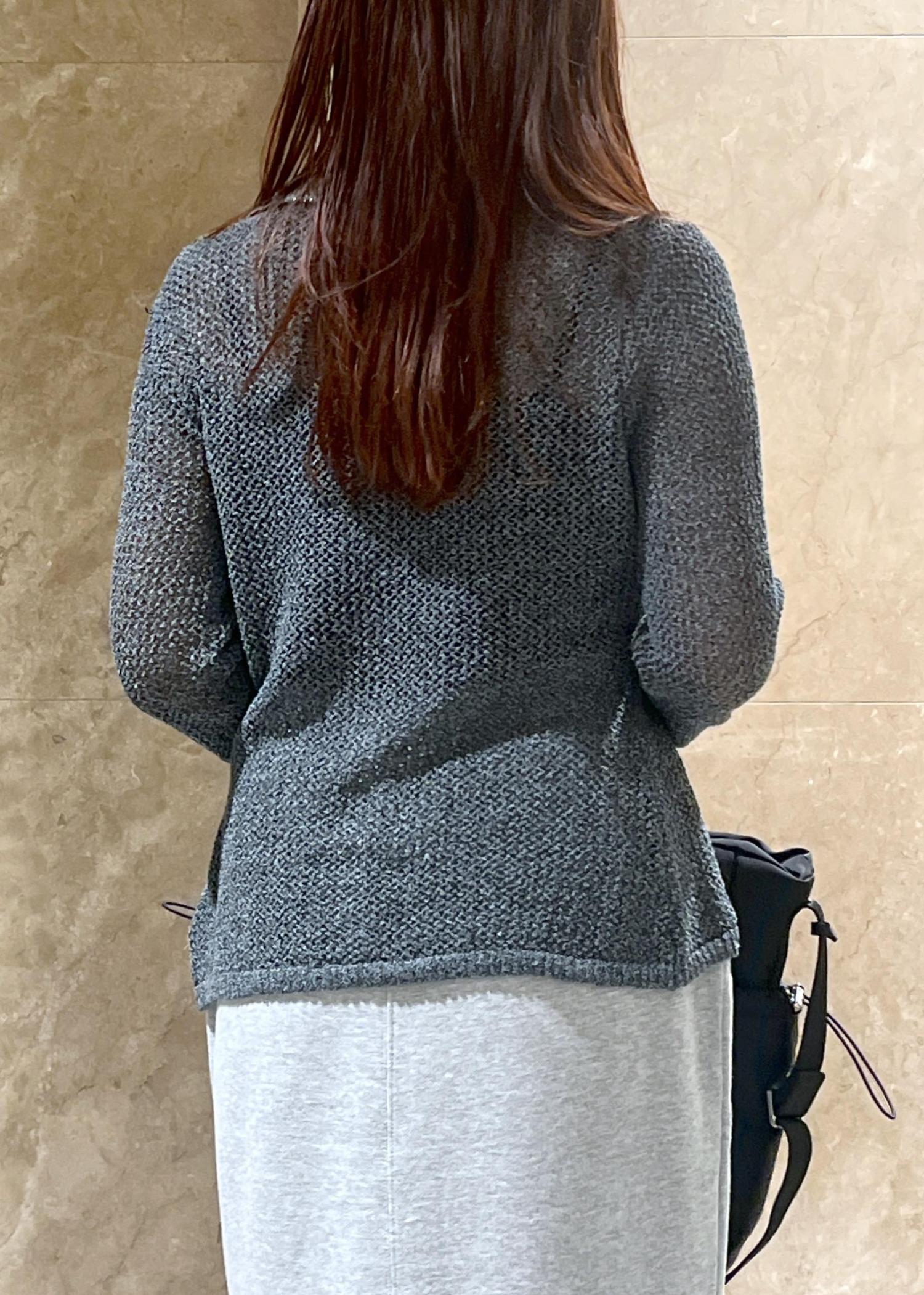 さらっとした肌あたりで、ざっくりと編み地の透けもあるため、まだまだ暑い今の時期でもちょっとした冷房対策にも重宝しそう!
