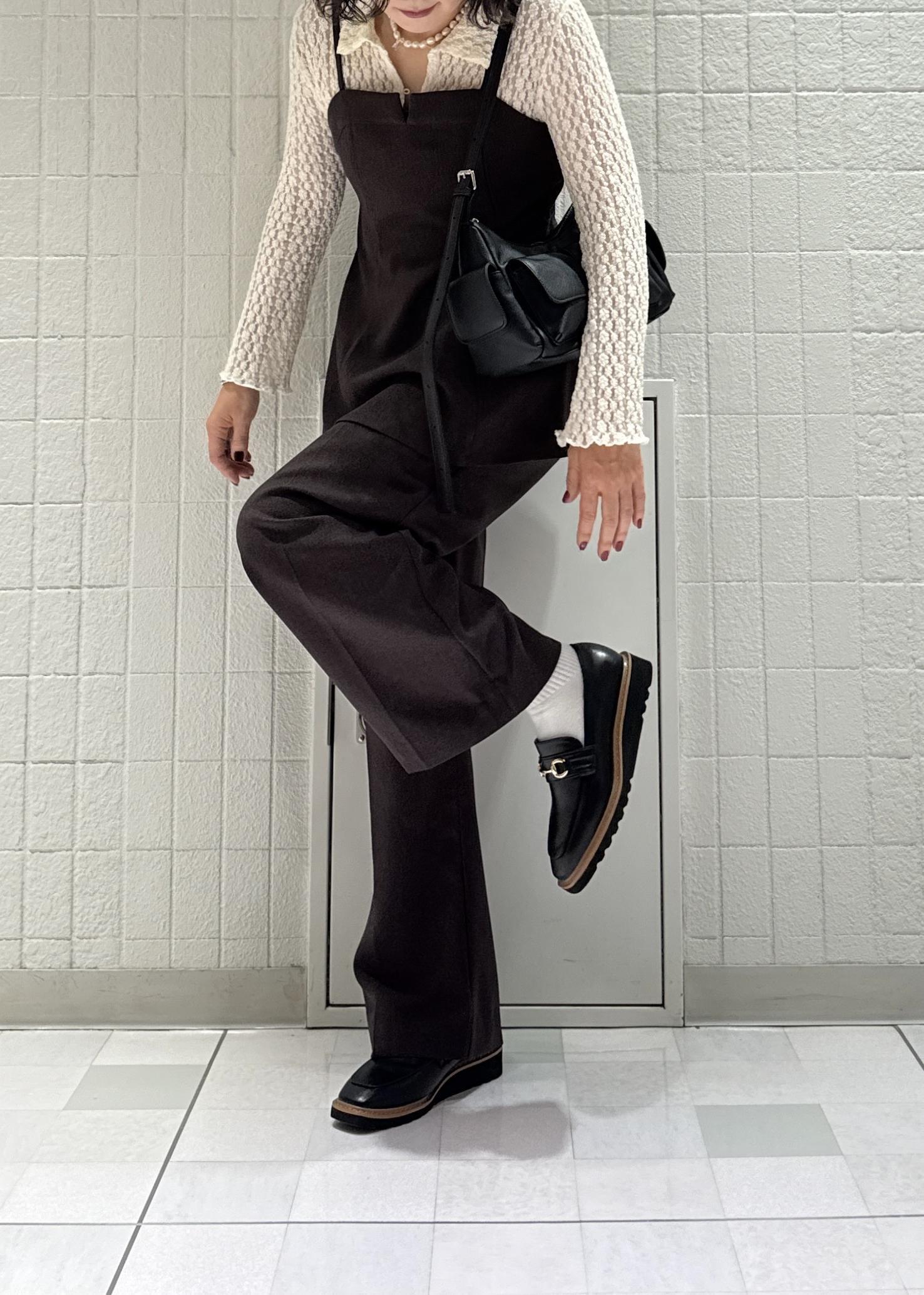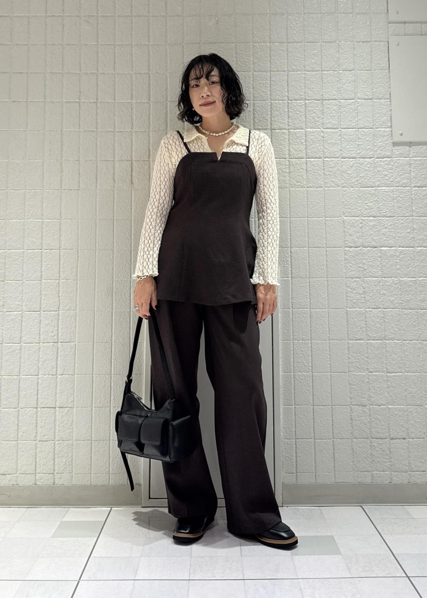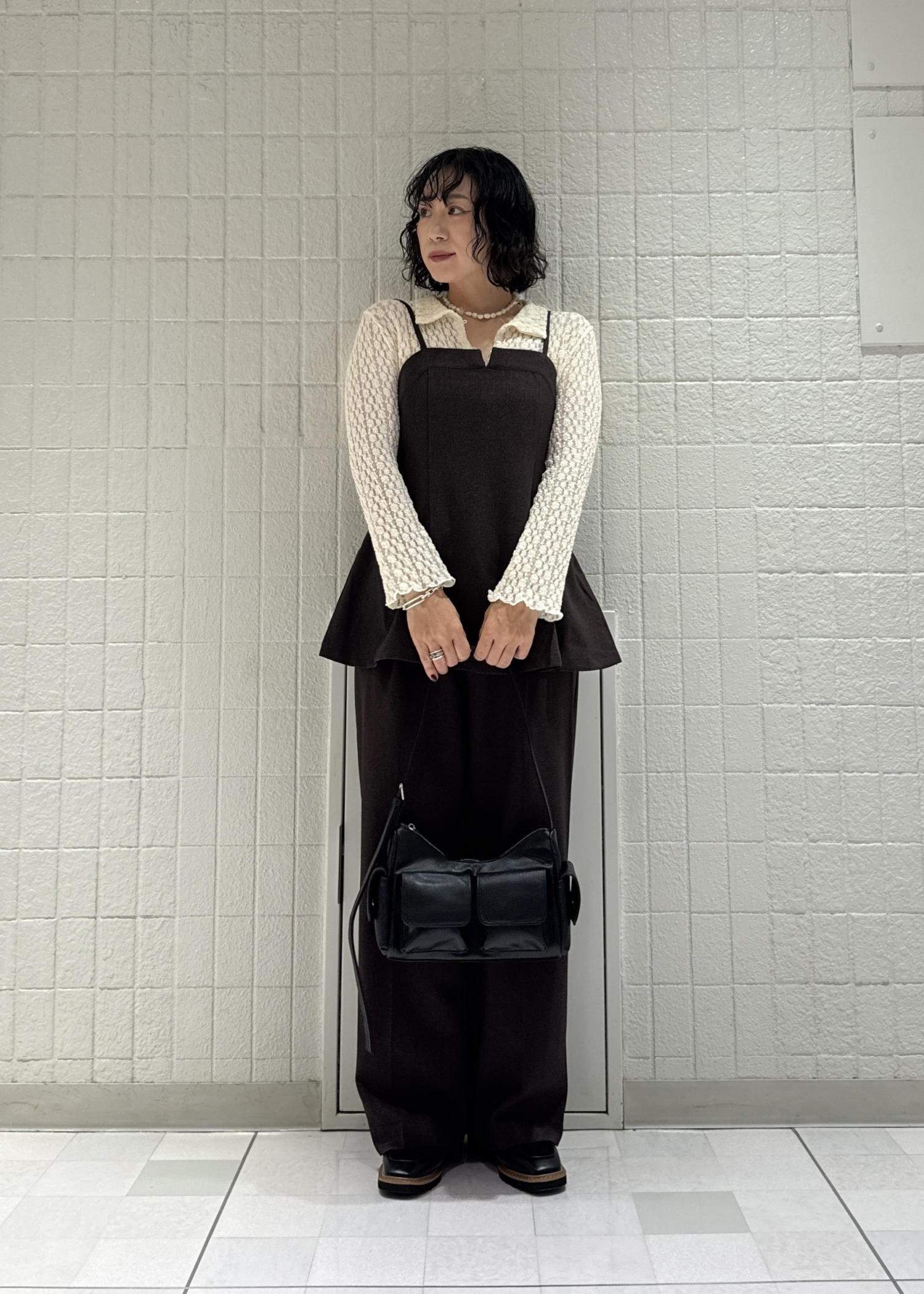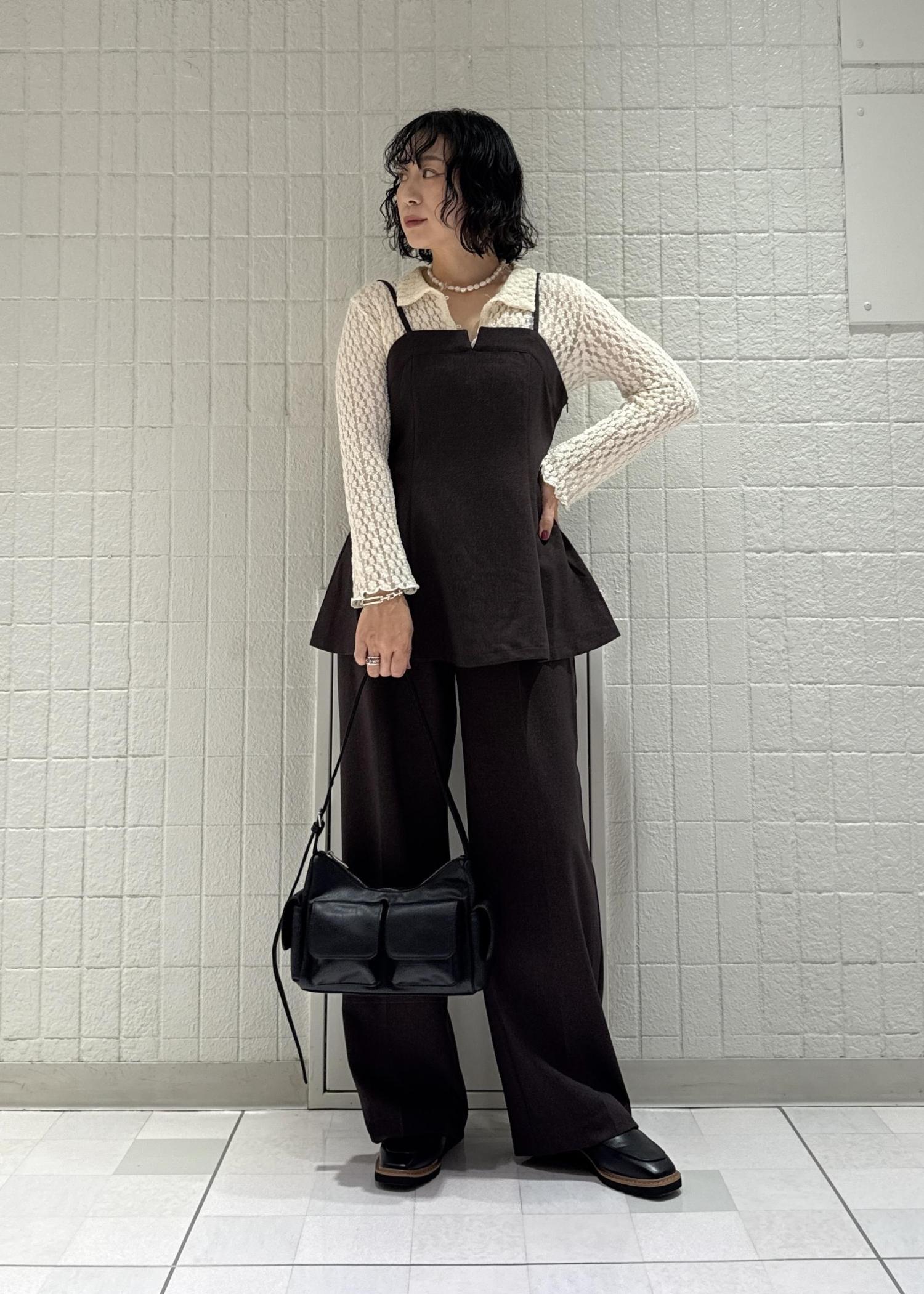 しっかりした生地なので1枚の着用はもちろんの事、ニットの重ね着も可愛いです!後ろはゴムで少しゆとりのあるサイズ感で楽な着心地。