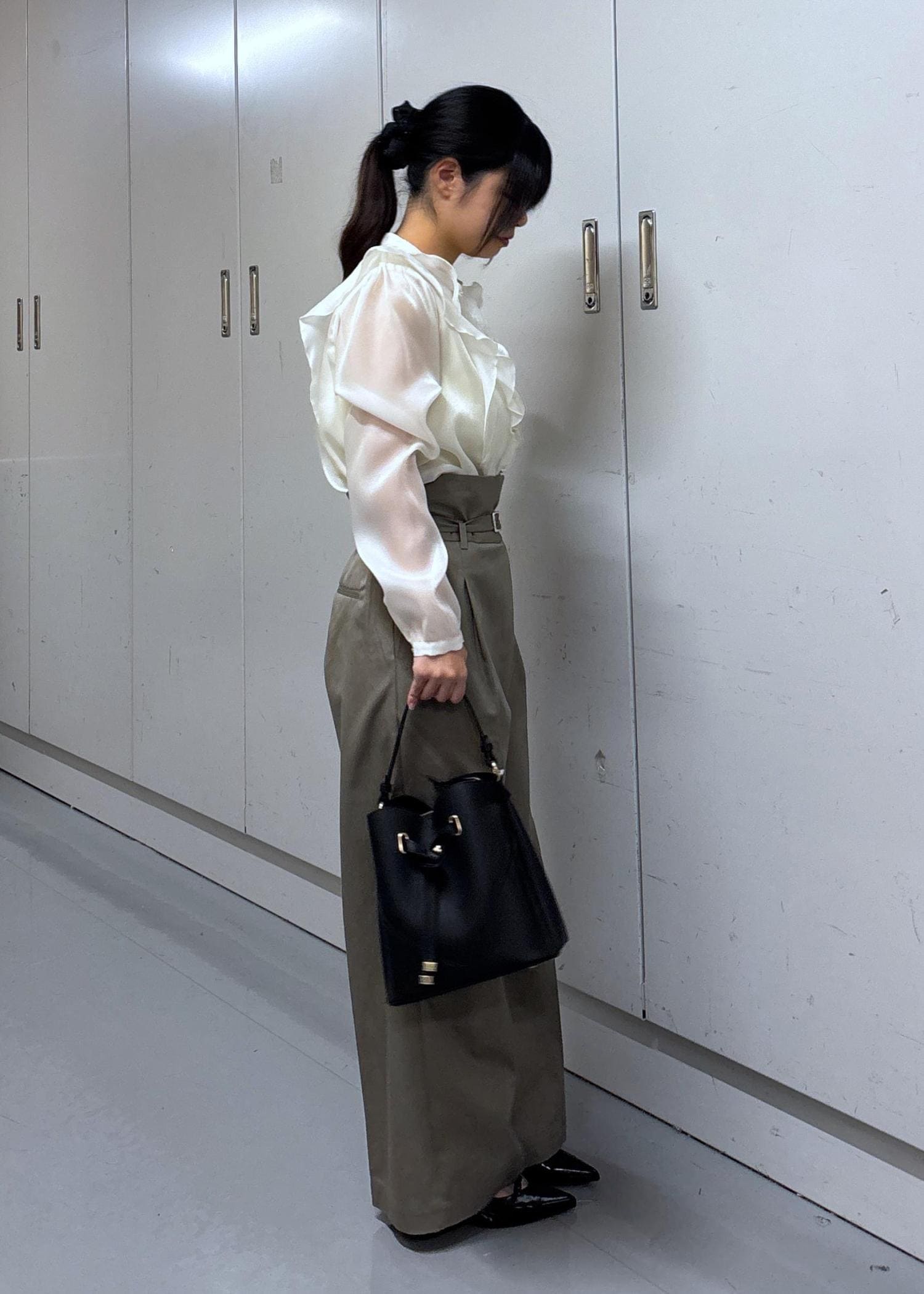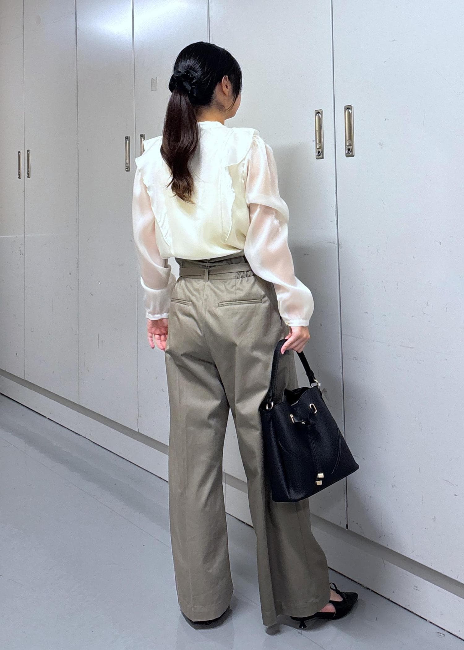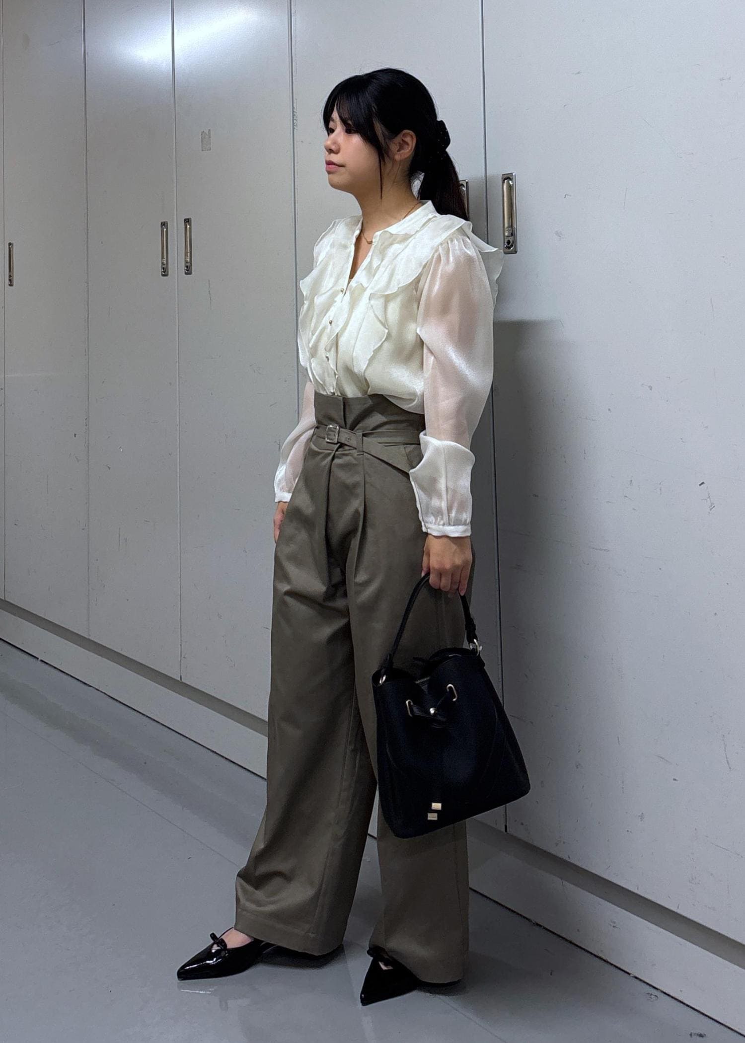 好評だったシアーラッフルブラウスの秋バージョンにウエストベルトがポイントになるワイドパンツを合わせました♪