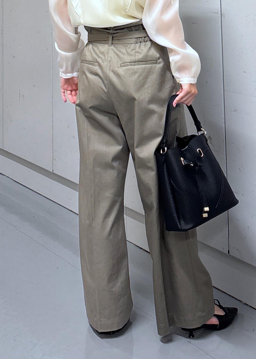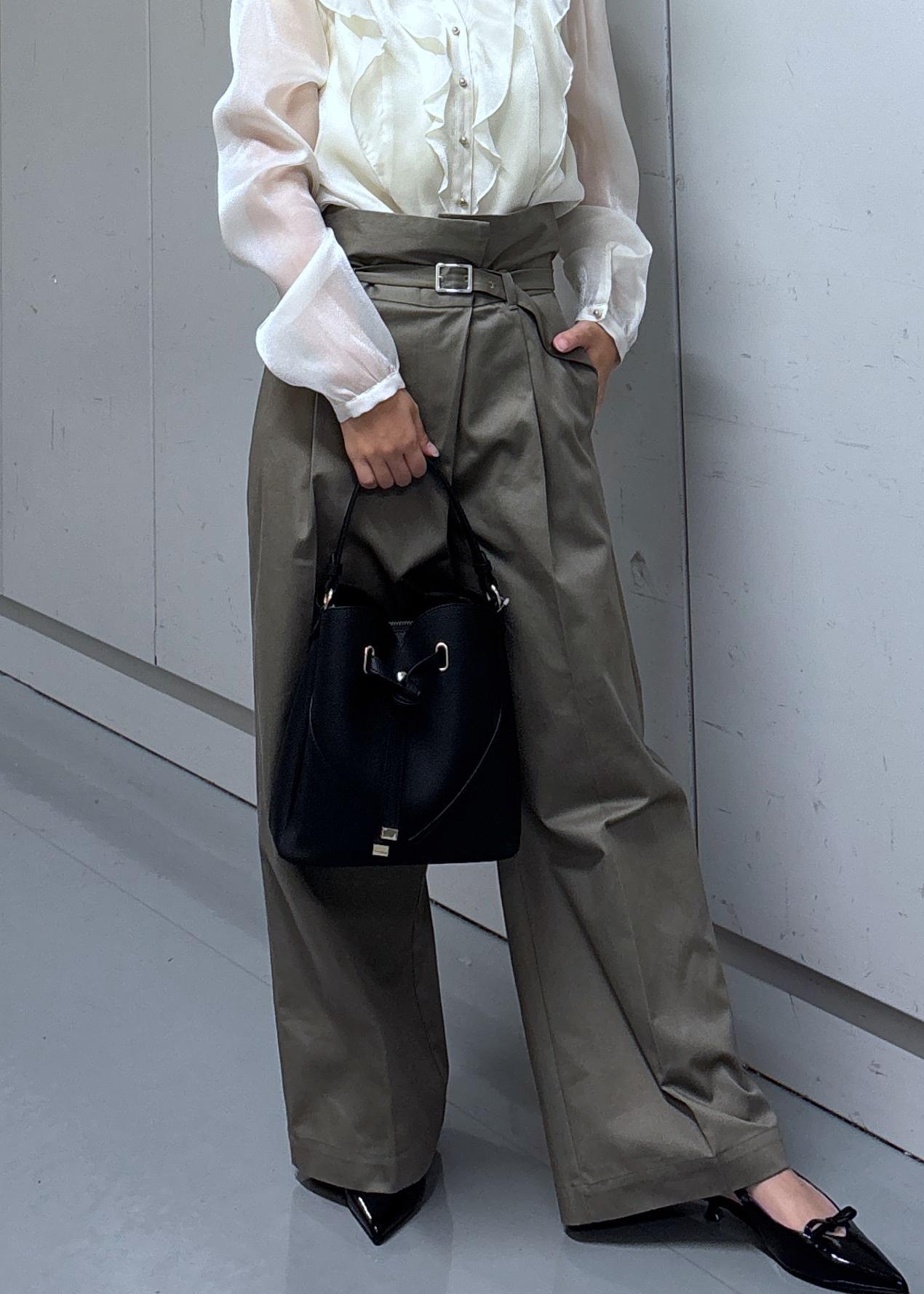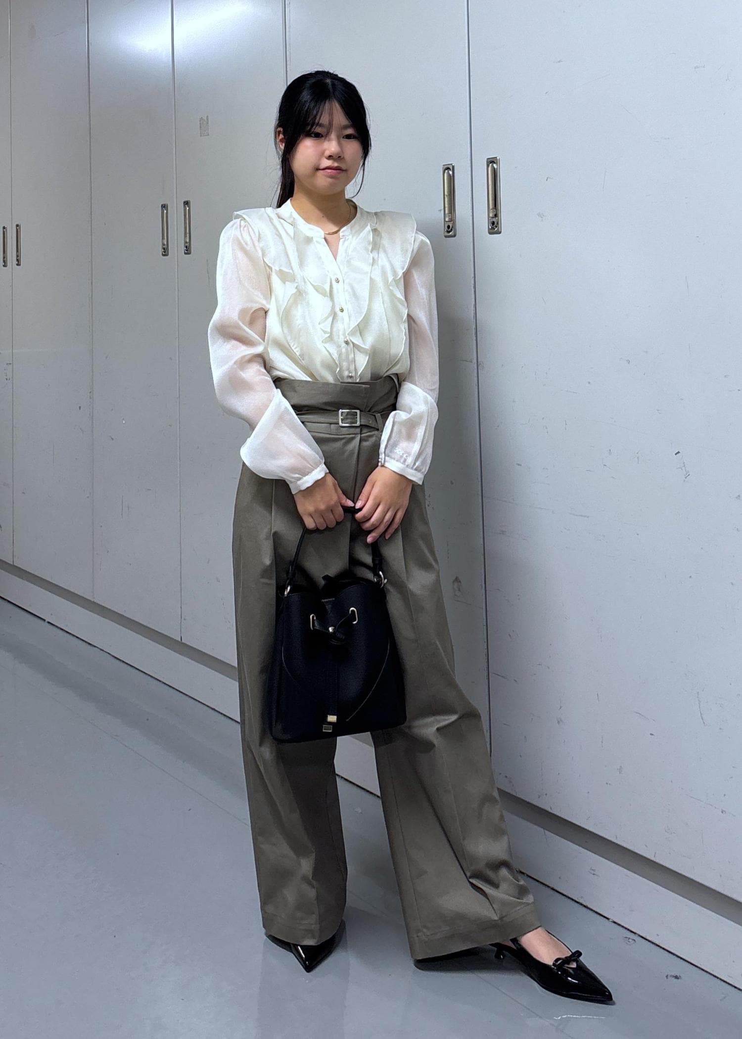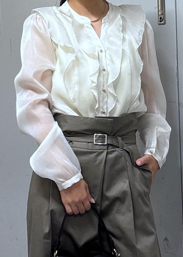 好評だったシアーラッフルブラウスの秋バージョンにウエストベルトがポイントになるワイドパンツを合わせました♪