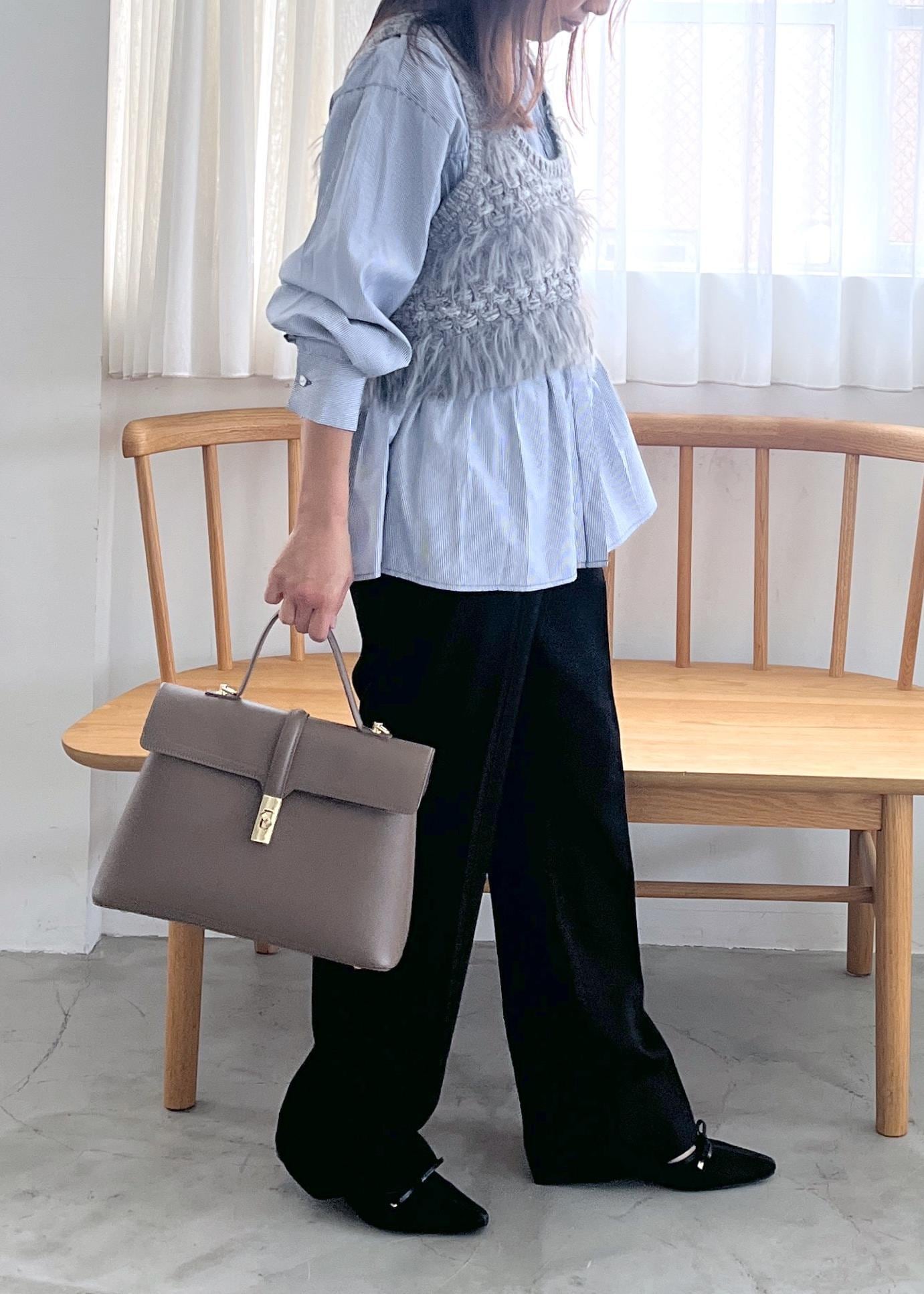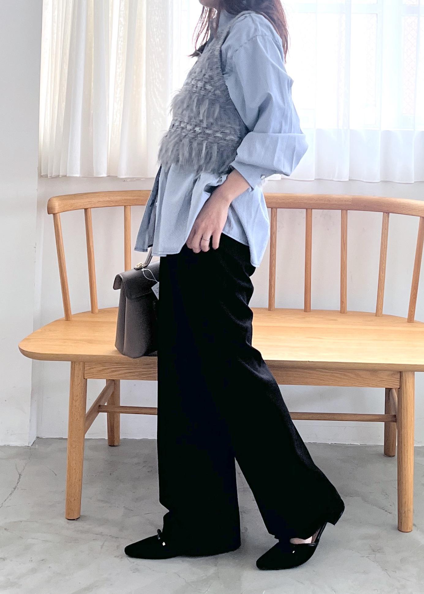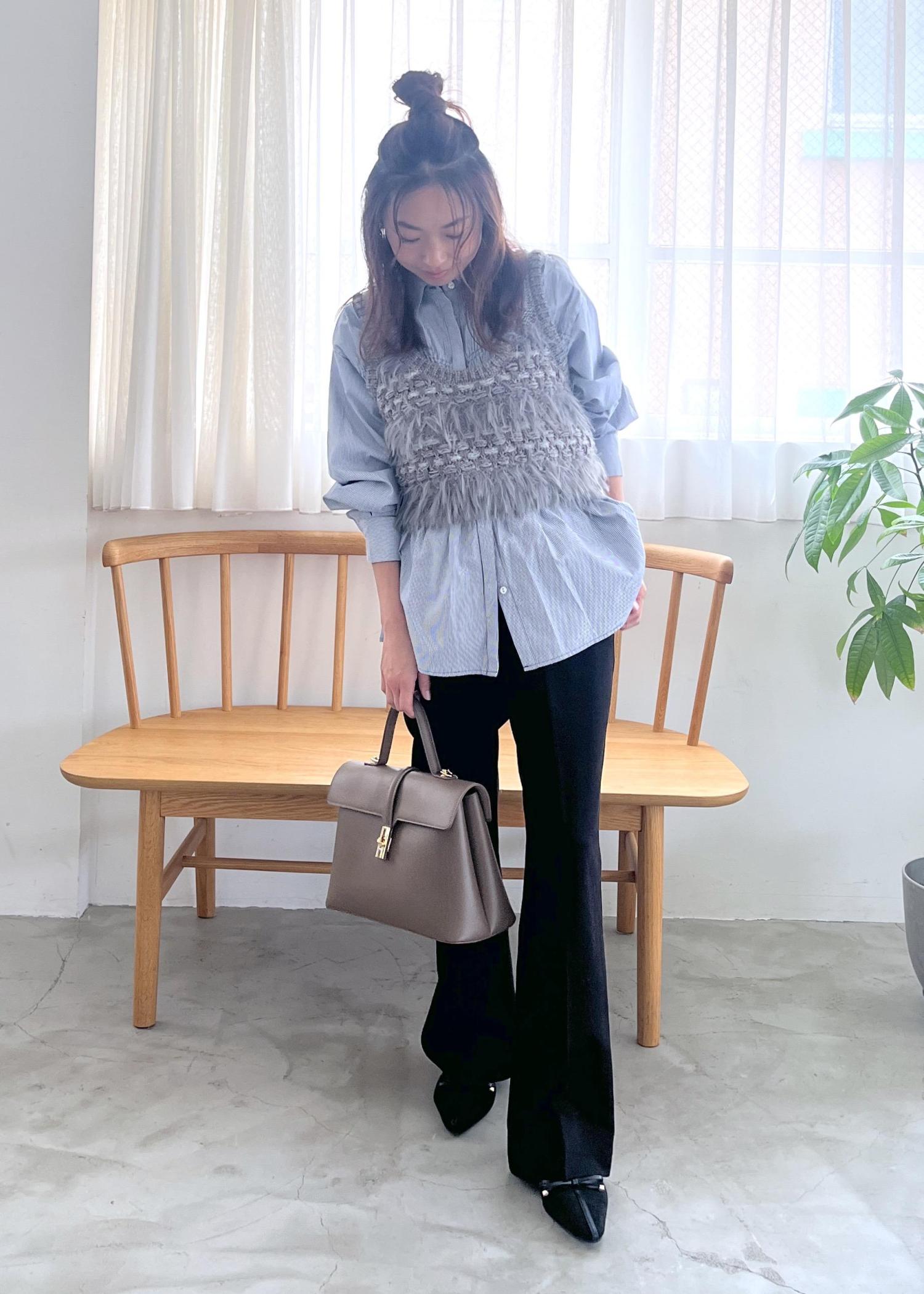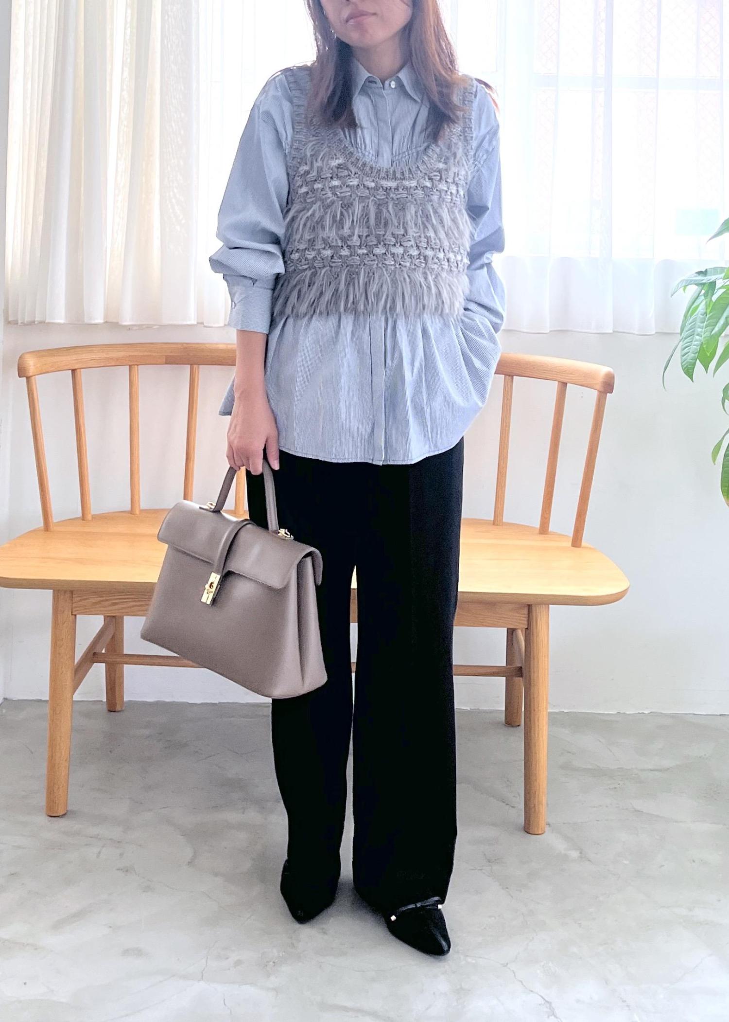 毎回大人気のシャーリングブラウスに、ふわもこ素材のビスチェをオンするだけで一気に今年顔に。
