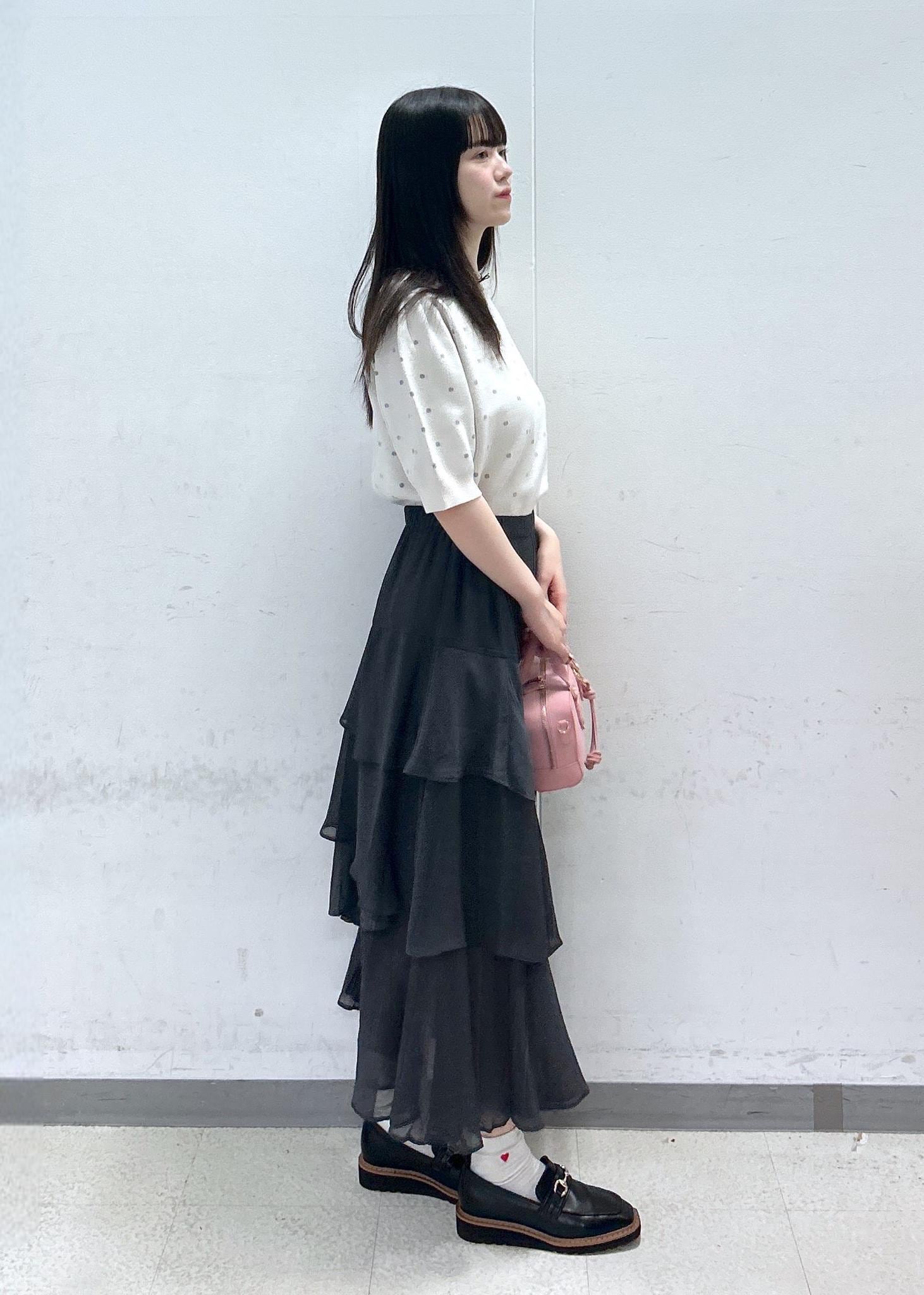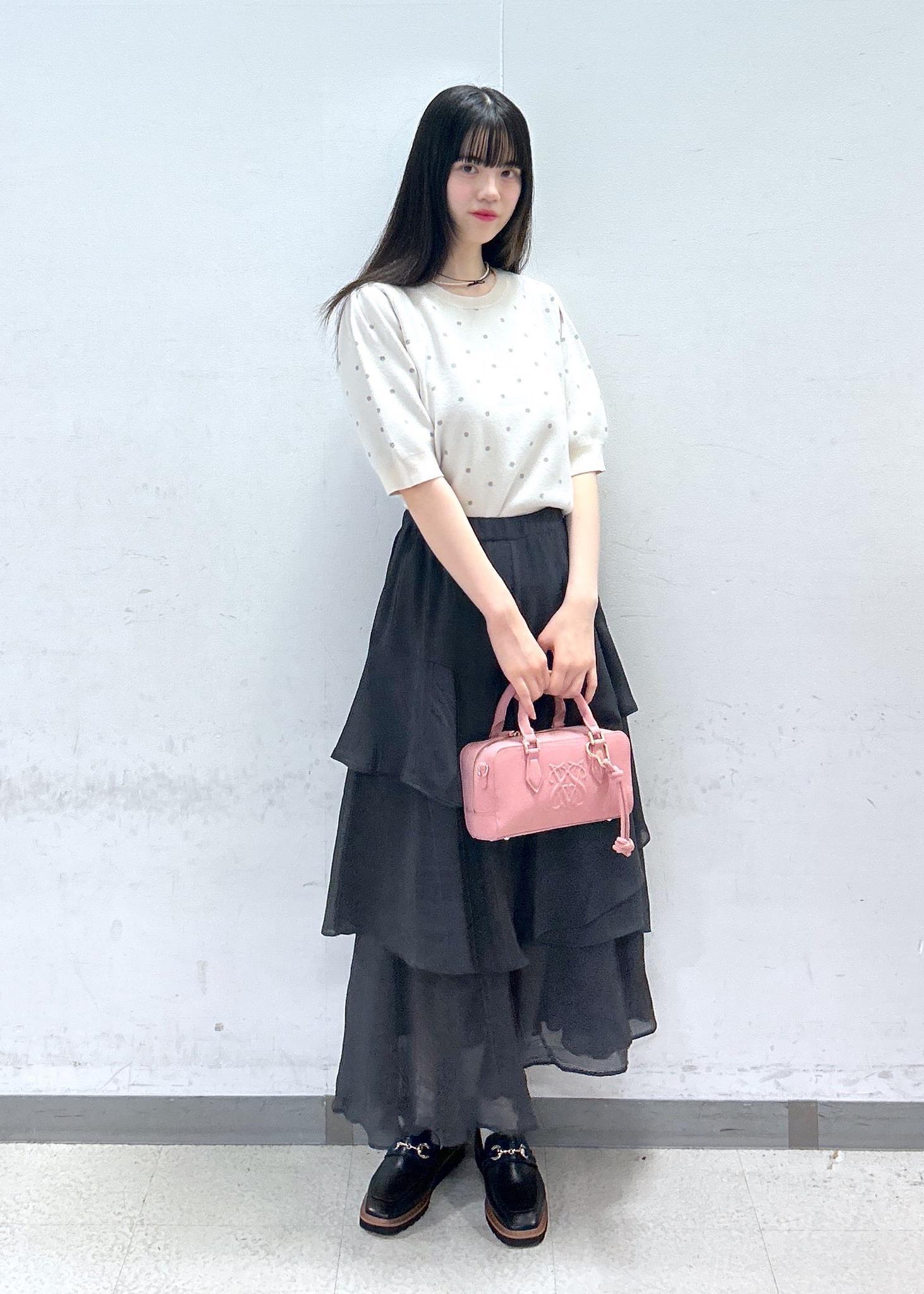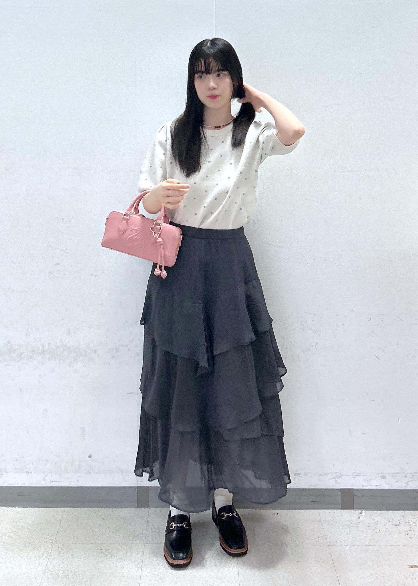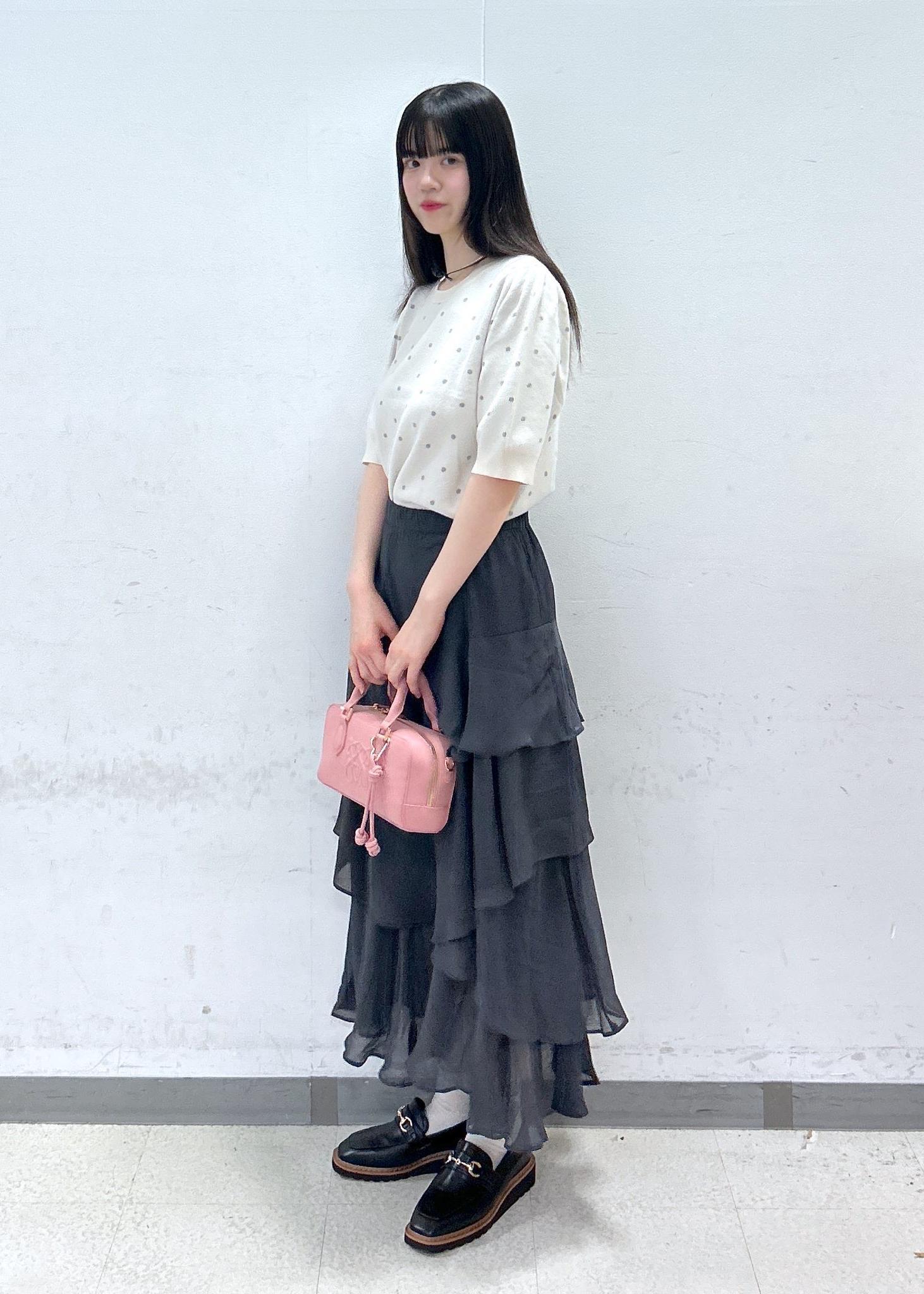 スカートの透け感&ピンクのバッグで女性らしさをプラスしつつ、足元はローファーで甘さを引き締めました。