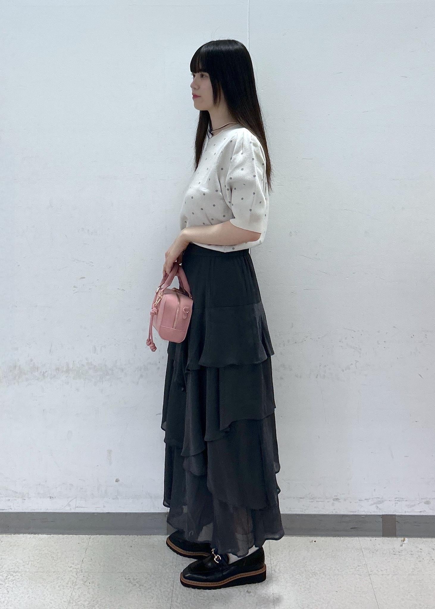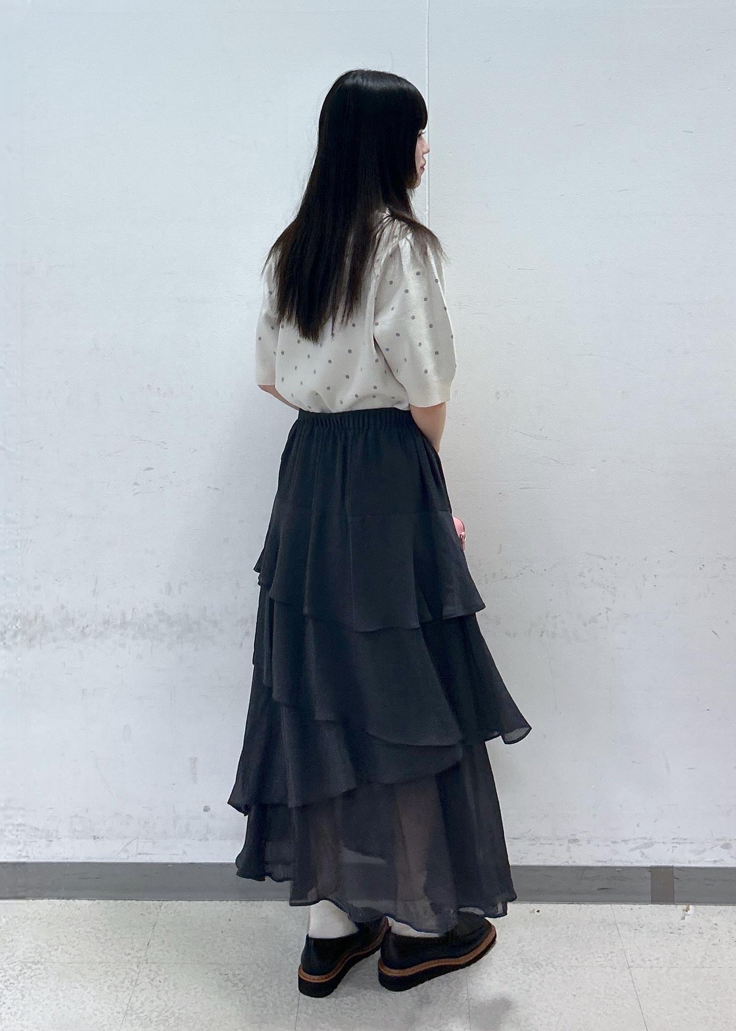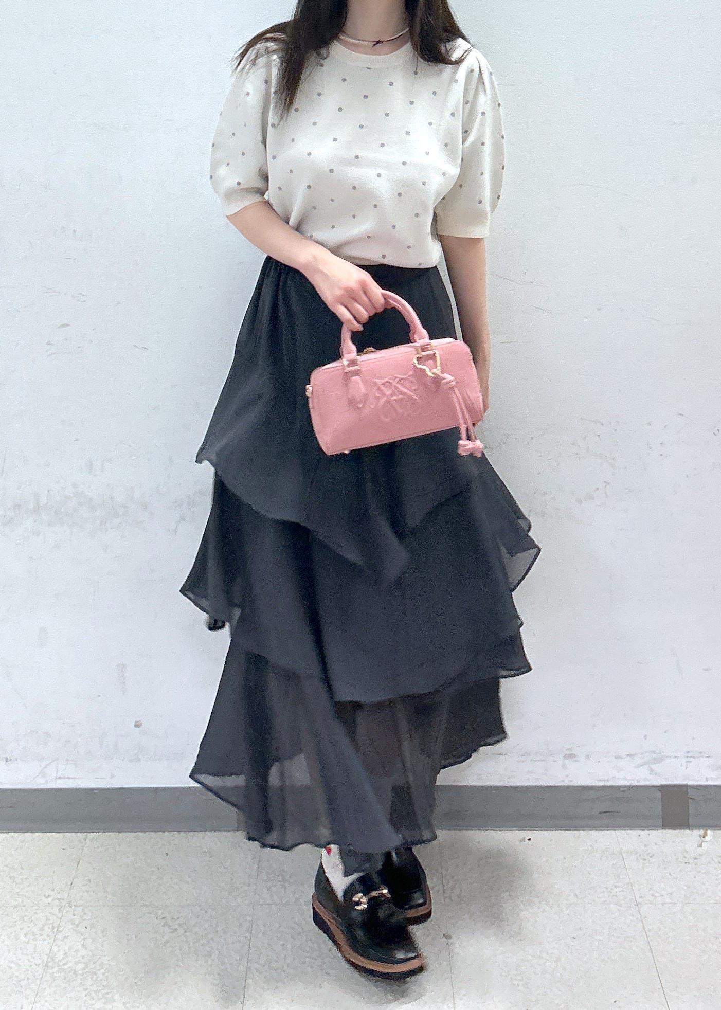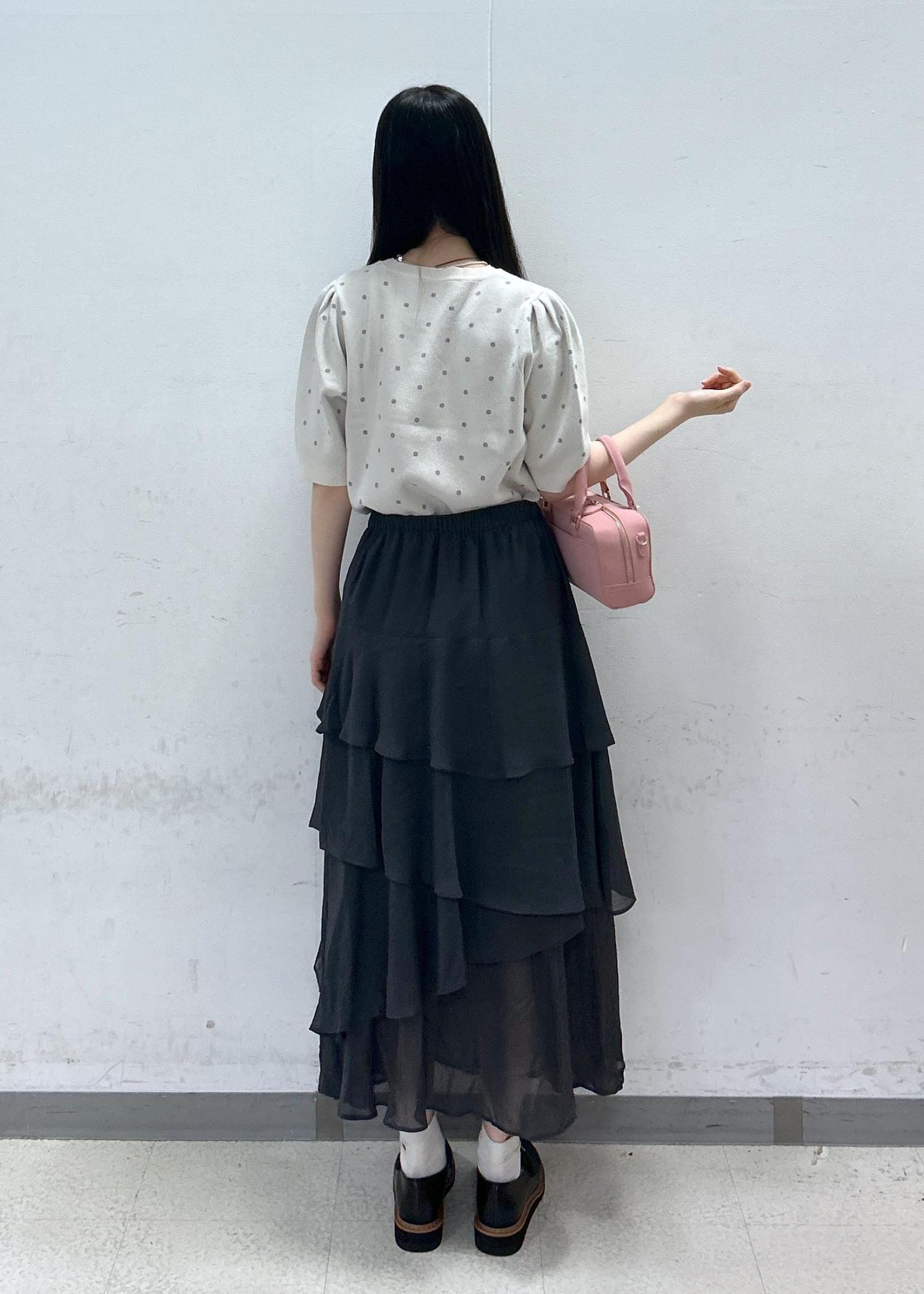 ドットトップスとティアードスカートを合わせた軽やかなモノトーンスタイル♪