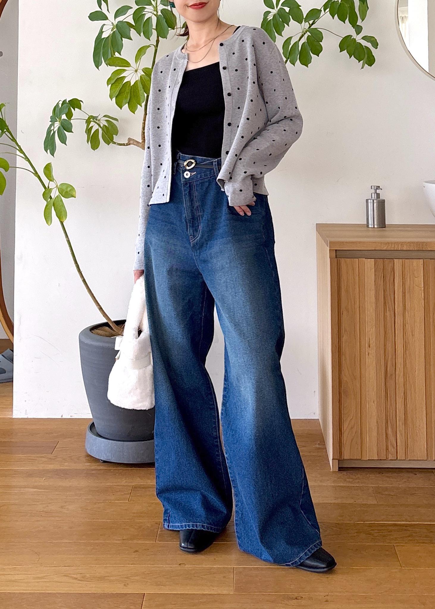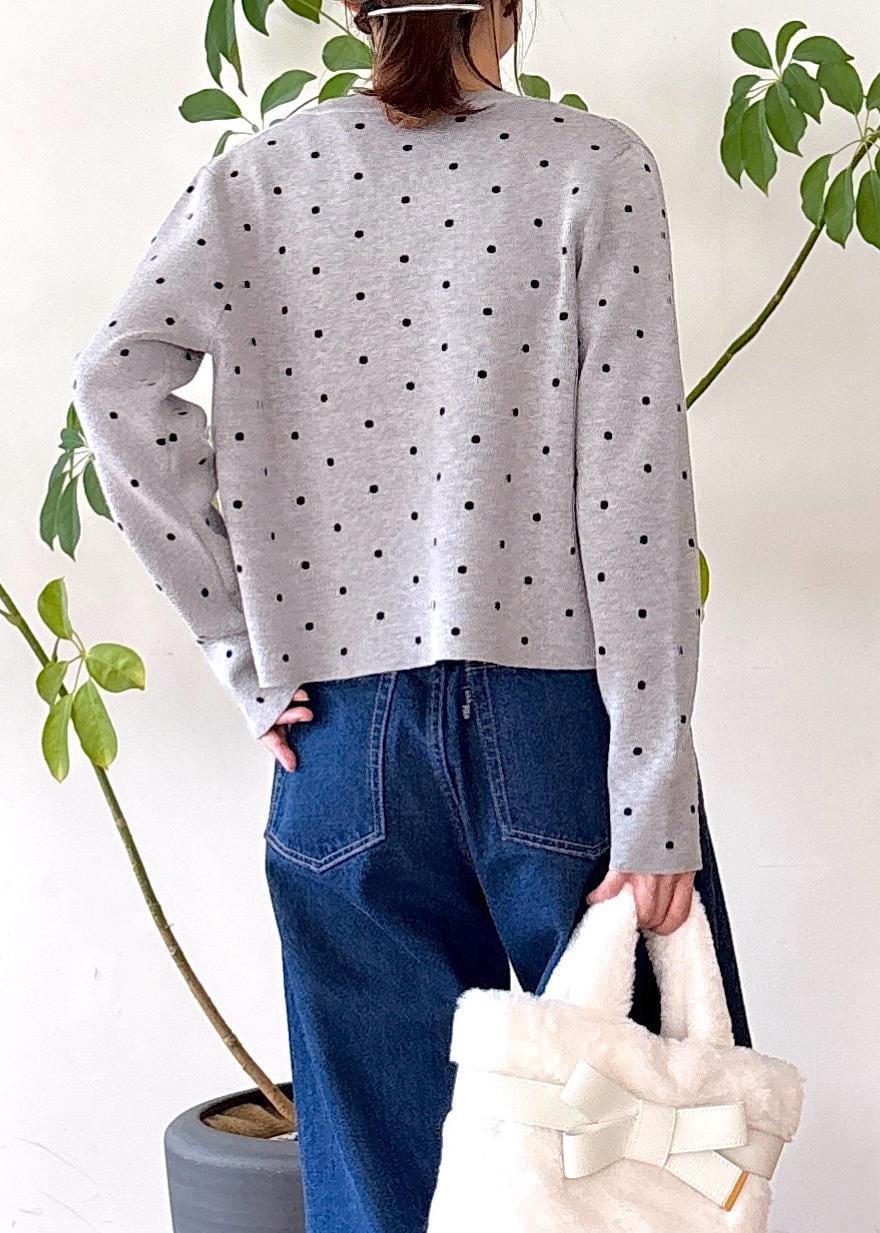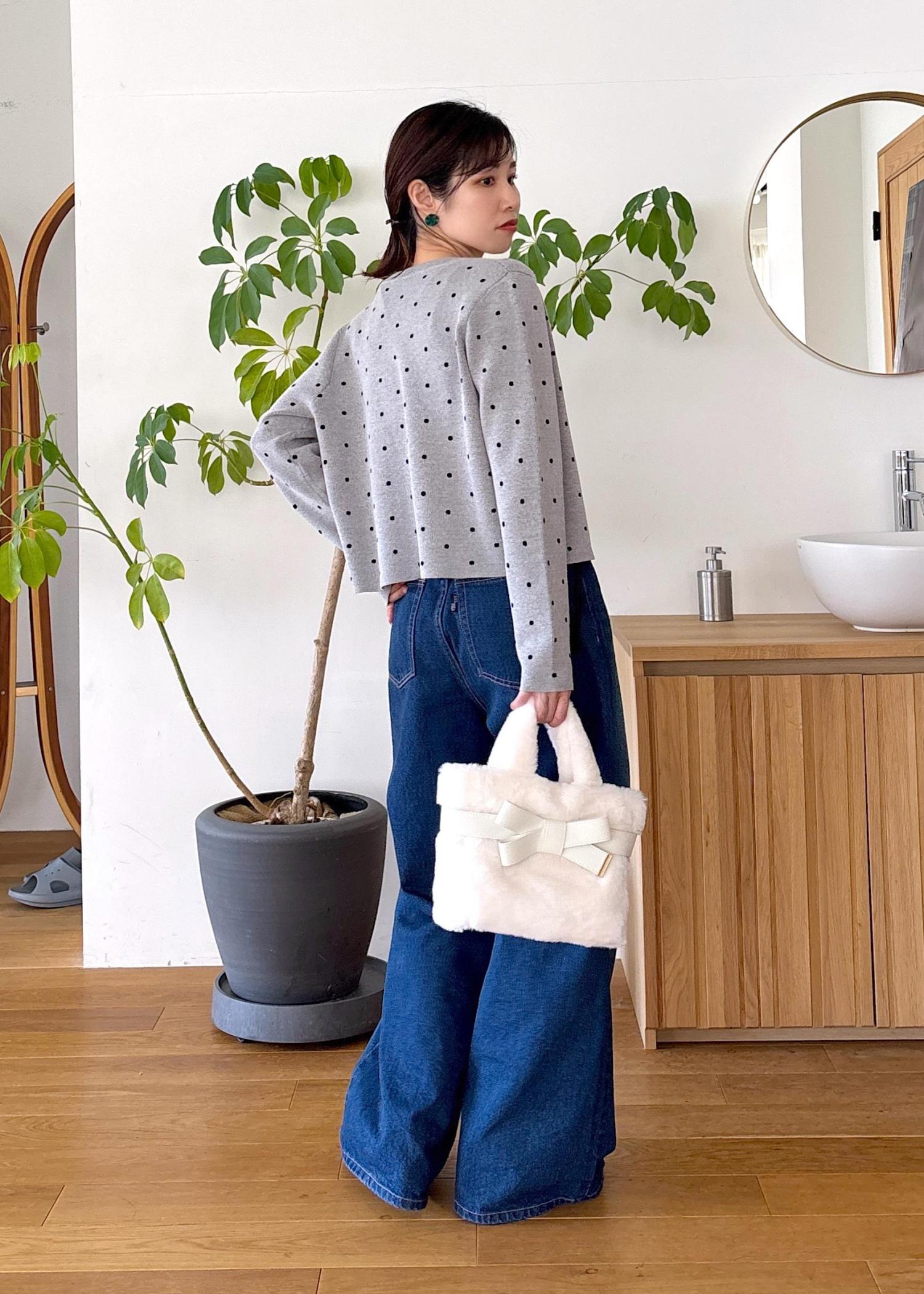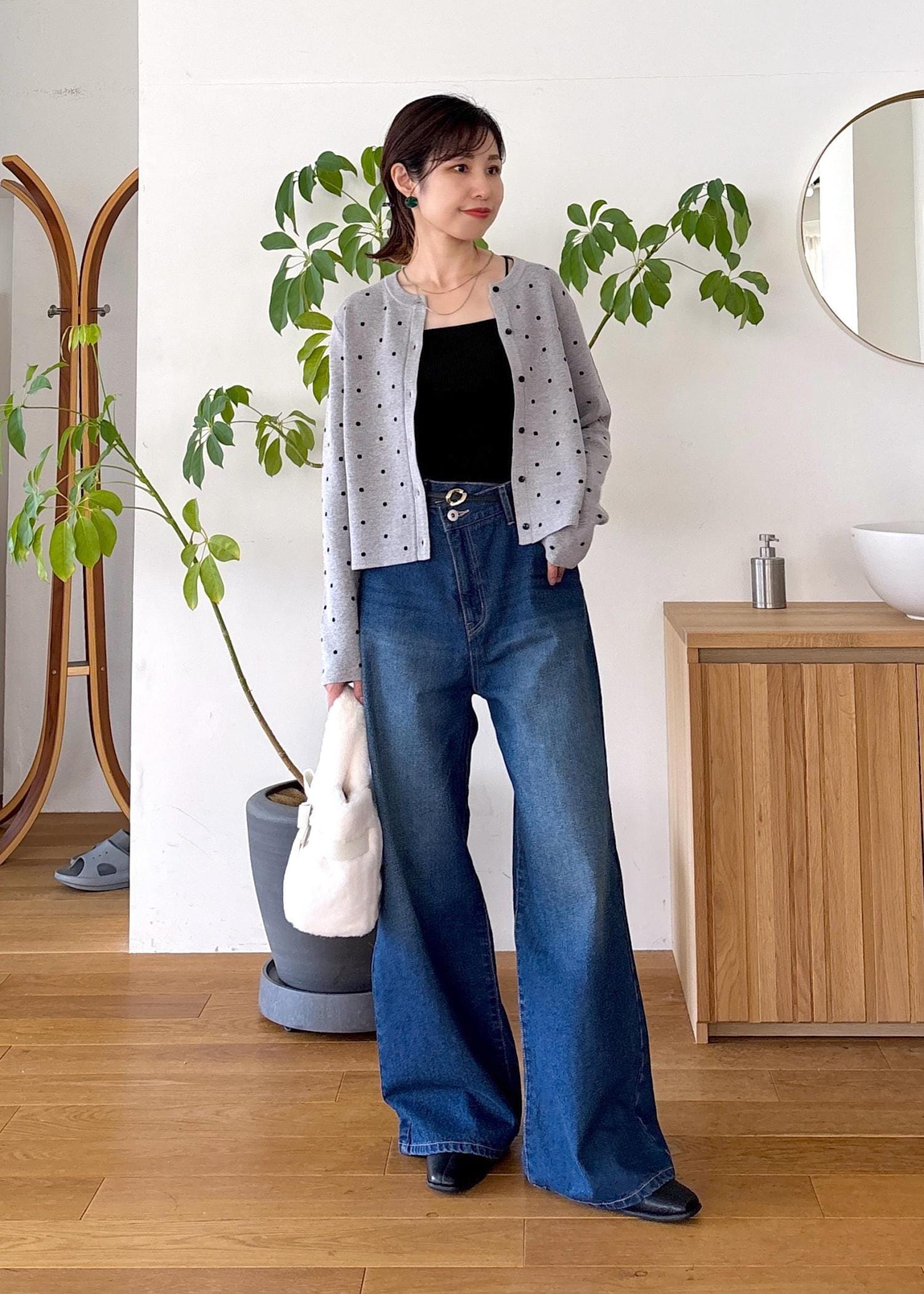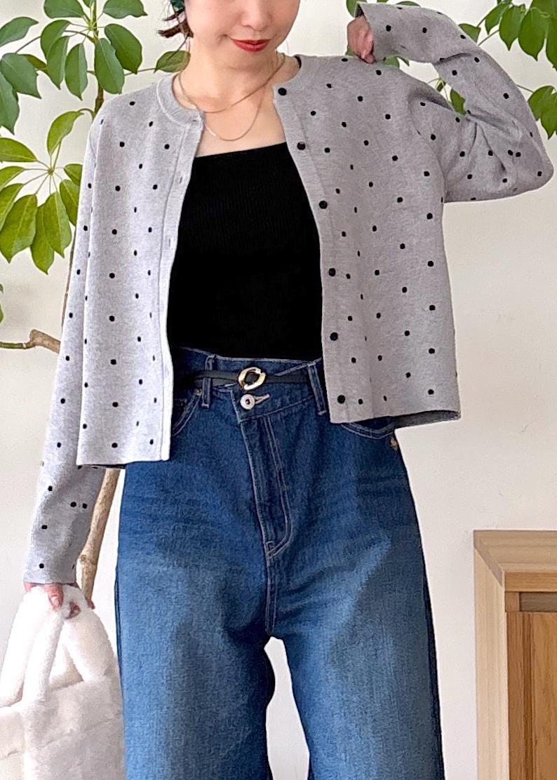 小ぶりなドット柄が大人可愛いカーディガン♪コンパクトなシルエットなので、リラックス感のある緩やかデニムとのバランスがとても好みでした◎ヒールブーツ、ファーバックなど季節を感じる小物でまとめた秋の大人カジュアルコーデ。