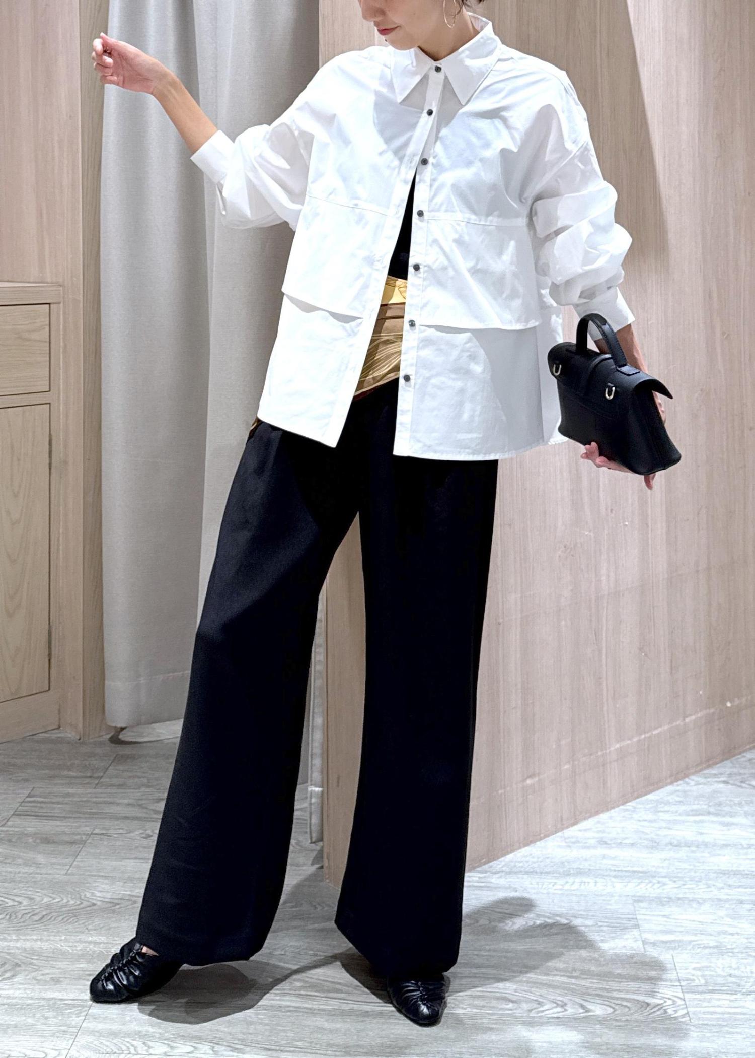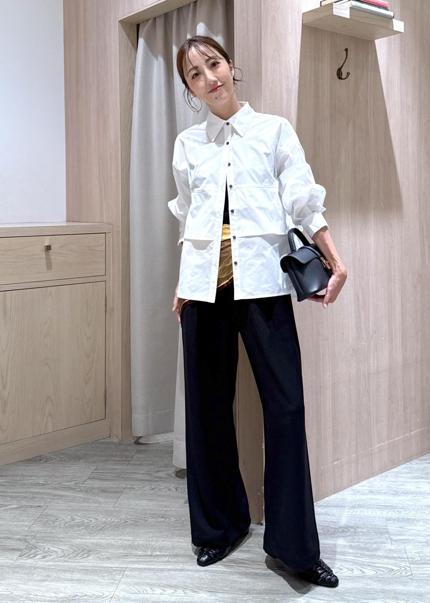 トラッドスタイルな白シャツ×ワイドパンツの定番の合わせにスカーフを合わせて秋らしく♪